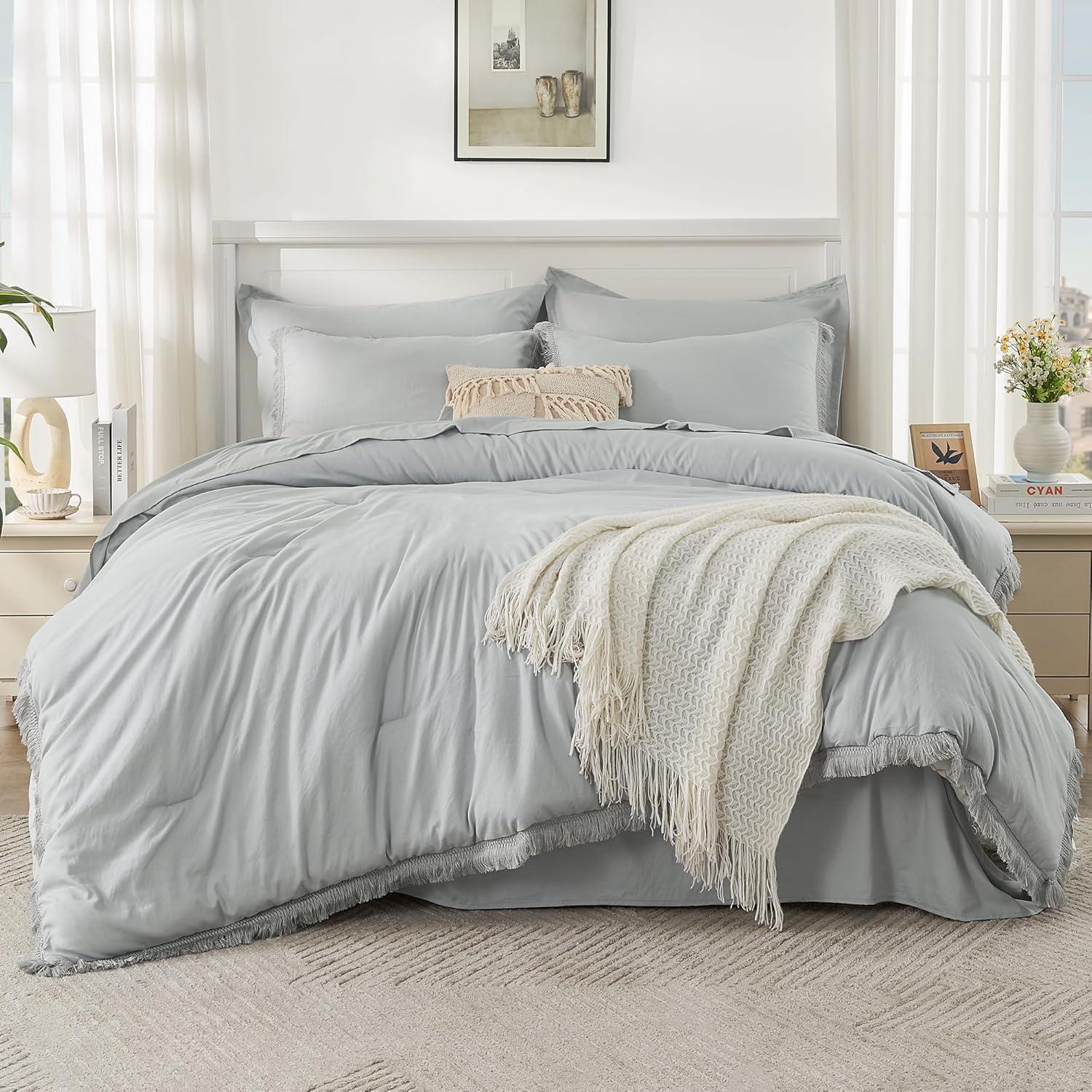 Andency Beige California King Size Comforter Set with Sheets – 7 Pieces Boho Tassel Bed in a Bag Soft Lightweight Bedding Sets, Fringe Bed Set with Comforter, Sheets, Pillowcases & Shams(11 – Light Grey)