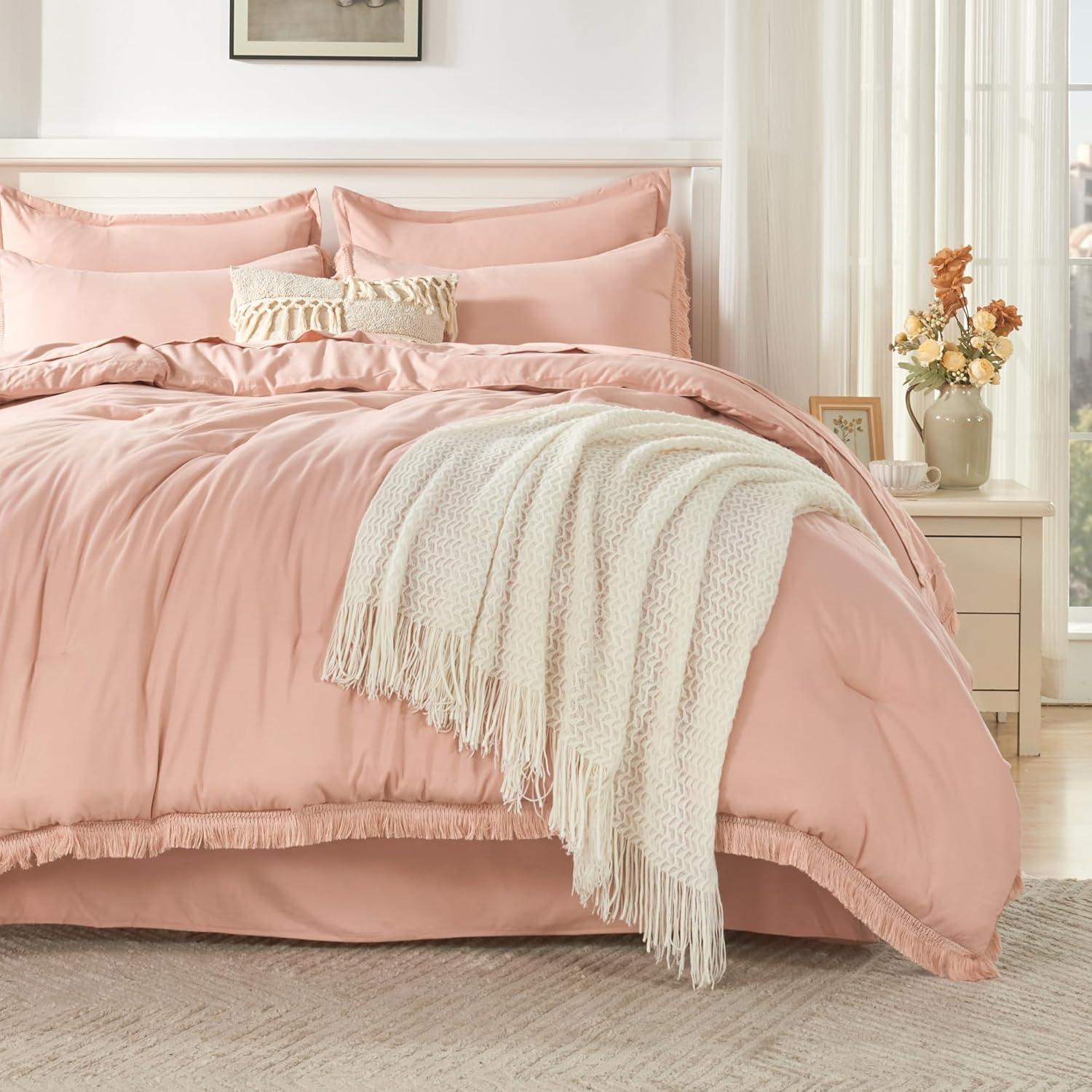 Andency Beige California King Size Comforter Set with Sheets – 7 Pieces Boho Tassel Bed in a Bag Soft Lightweight Bedding Sets, Fringe Bed Set with Comforter, Sheets, Pillowcases & Shams(13 – Pink)