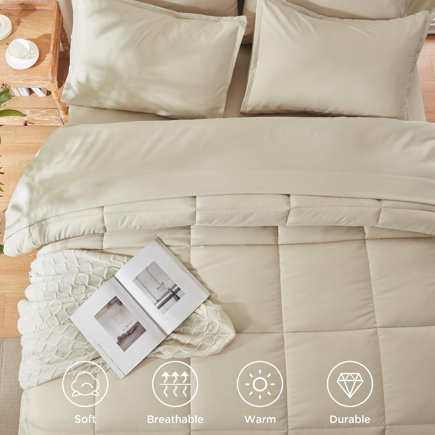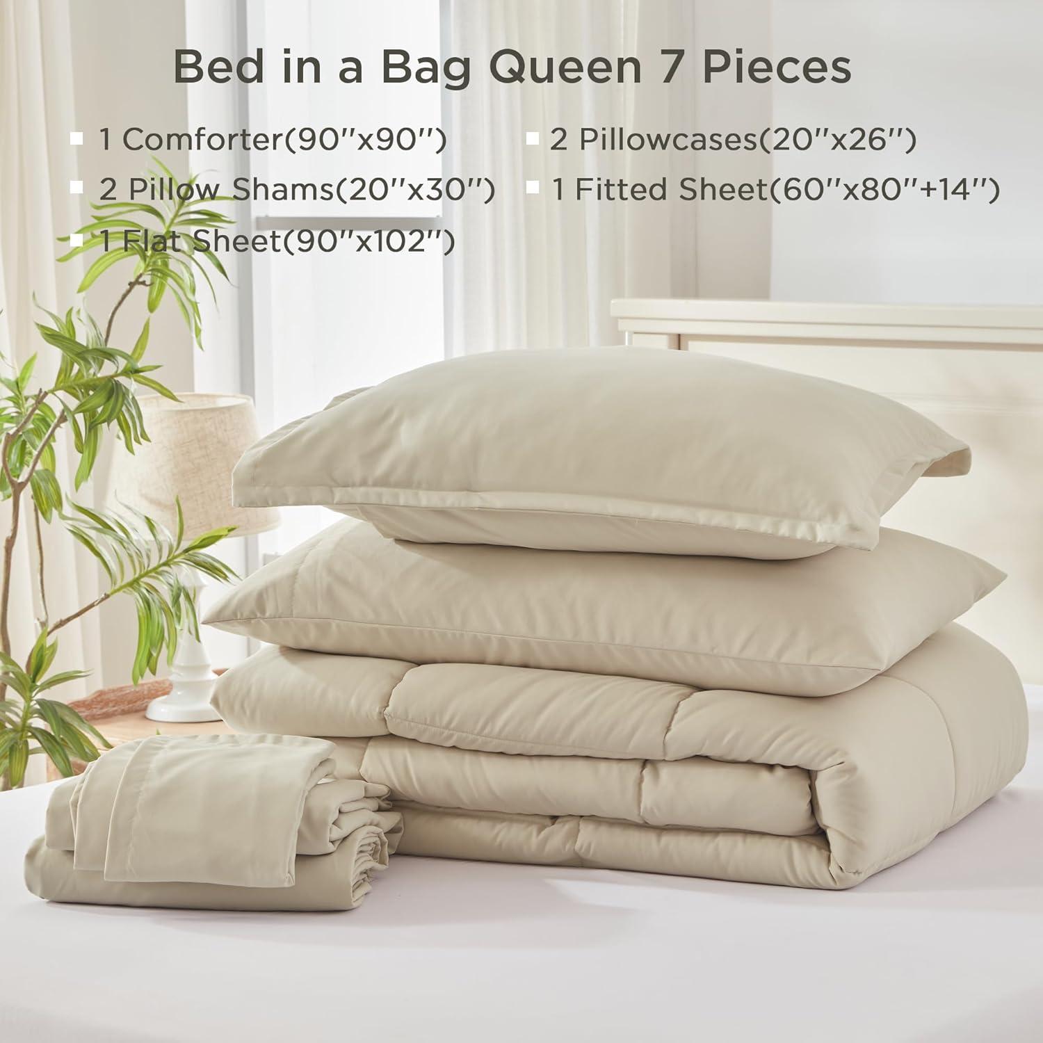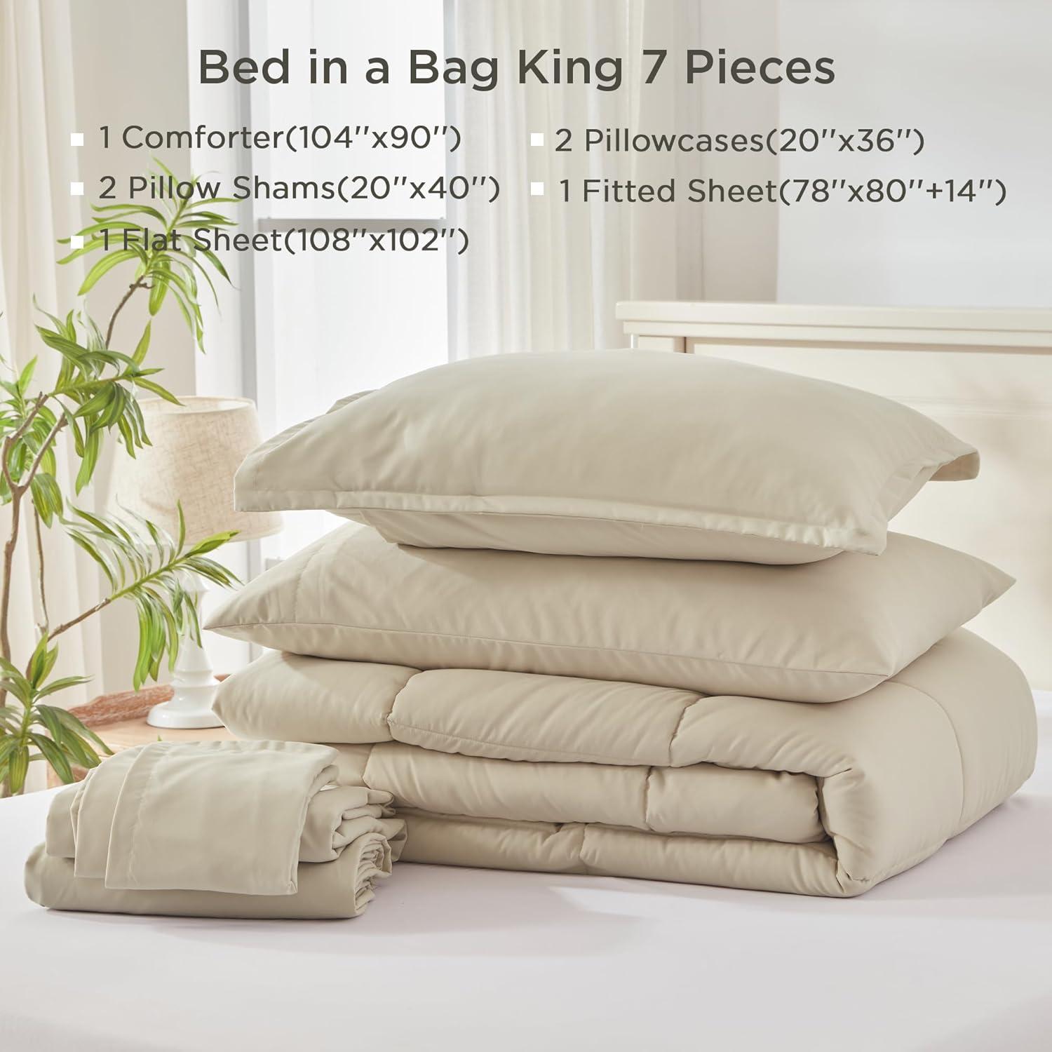 Bed in a bag 7 Pieces King Size: Say goodbye to the hassle of searching for bedding essentials. Our seven-piece set has everything you need for a perfect bedroom setup. The package includes 1 comforter (104″x 90″), 1 flat sheet (108″x 102″), 1 fitted sheet (78″x 80″+14″ deep), 2 pillowcases (20″x 36″), and 2 pillow shams (20″x 40″).
