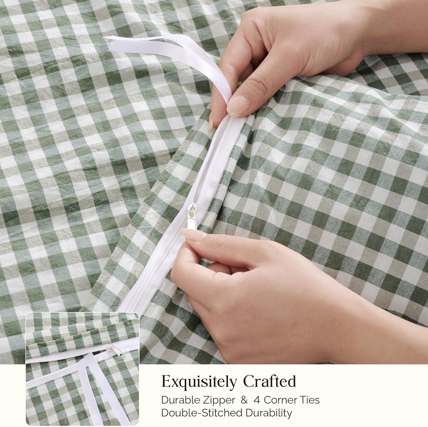Thoughtful Details: Our gingham duvet cover features a hidden smooth zipper closure, allowing for easy insert changes. 4 interior corner ties secure the duvet perfect in place to prevent shifting or bunching. Envelope pillowcases are designed for fast pillow replacement.