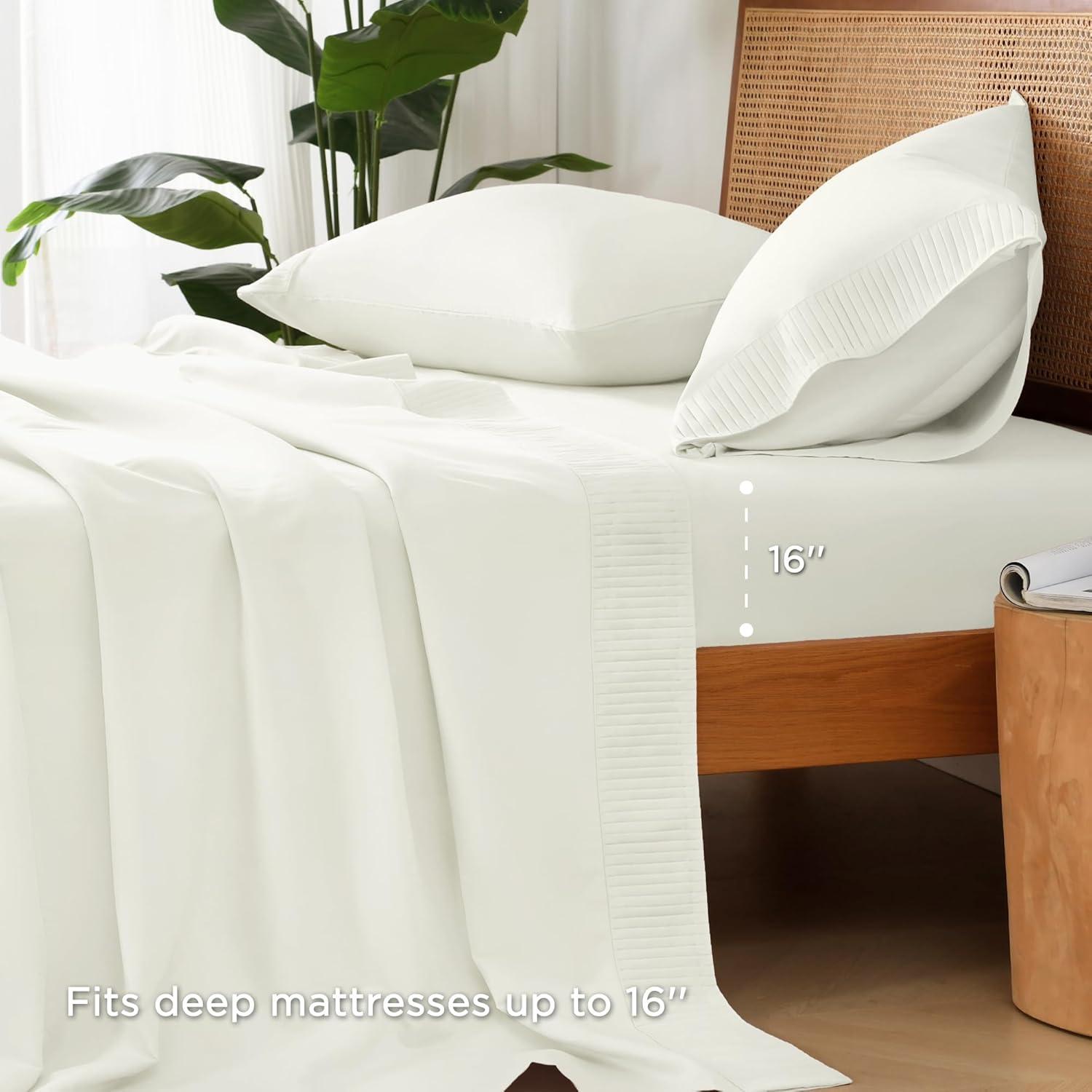 Deep Pockets: The deep pockets of the fitted sheet are designed to fit mattresses up to 16 inches, and the elastic band around the fitted sheet is designed to grip the mattress tightly, and the full elasticity ensures that the fitted sheet fits snugly and won't shift around.