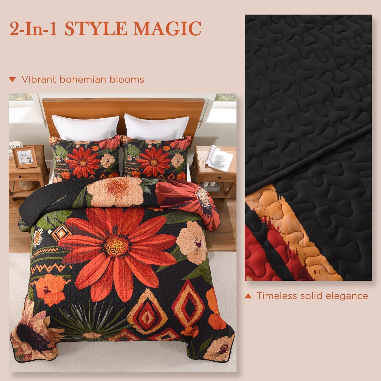 Andency Floral Boho Quilt King Size Bedding Set Black, 3 Pieces Farmhouse Flower Botanical Summer Bedspreads with 2 Shams, Soft Reversible Lightweight Microfiber Coverlet Set for All Season, 106"x96"(Red-black Floral)