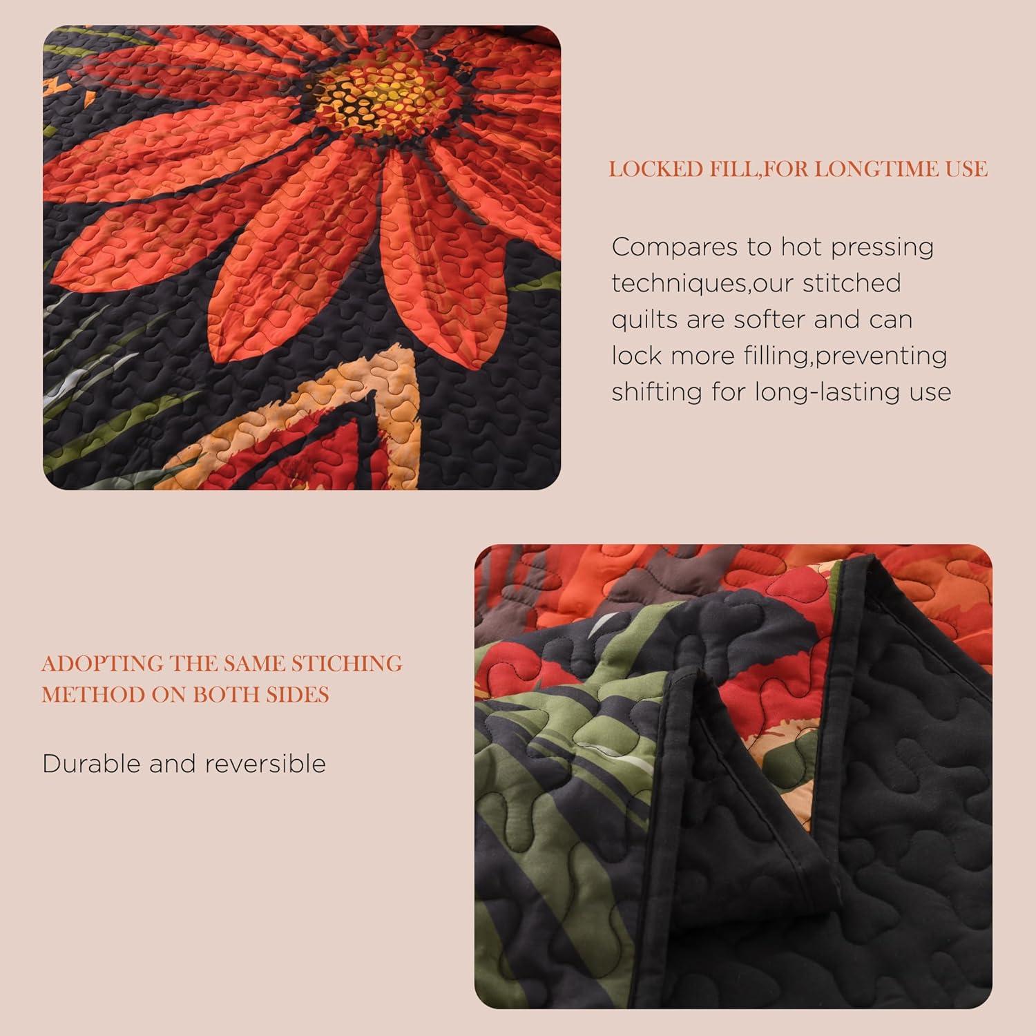 imageAndency Floral Boho Quilt King Size Bedding Set Black 3 Pieces Farmhouse Flower Botanical Summer Bedspreads with 2 Shams Soft Reversible Lightweight Microfiber Coverlet Set for All Season 106quotx96quotRedblack Floral