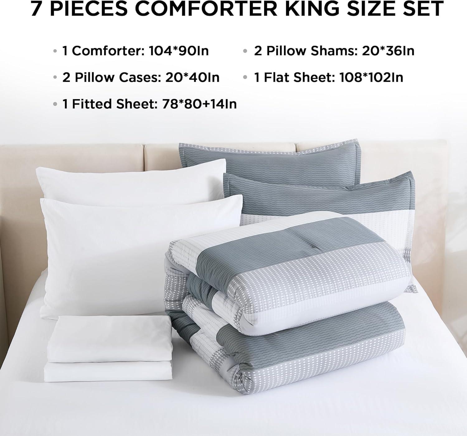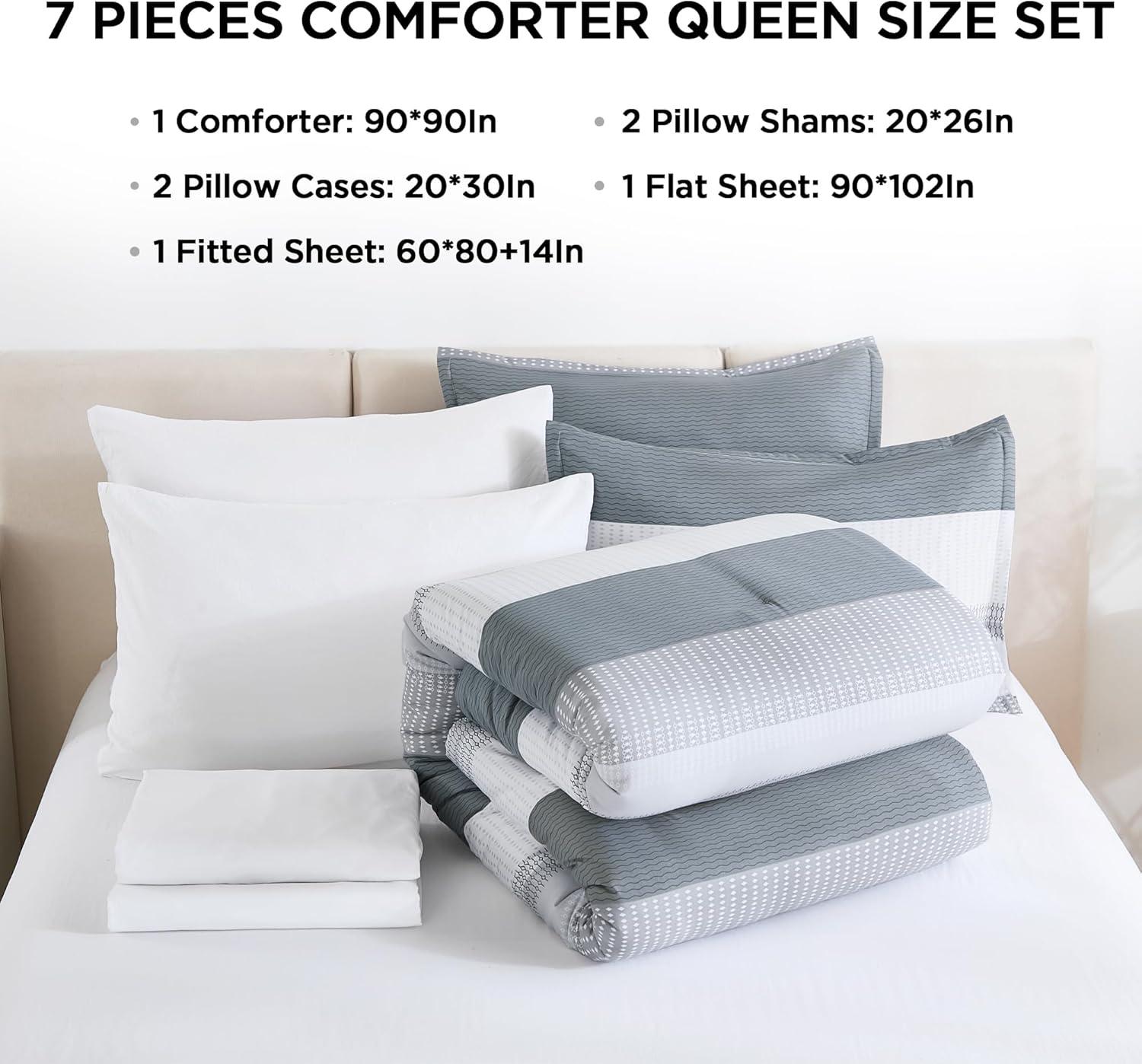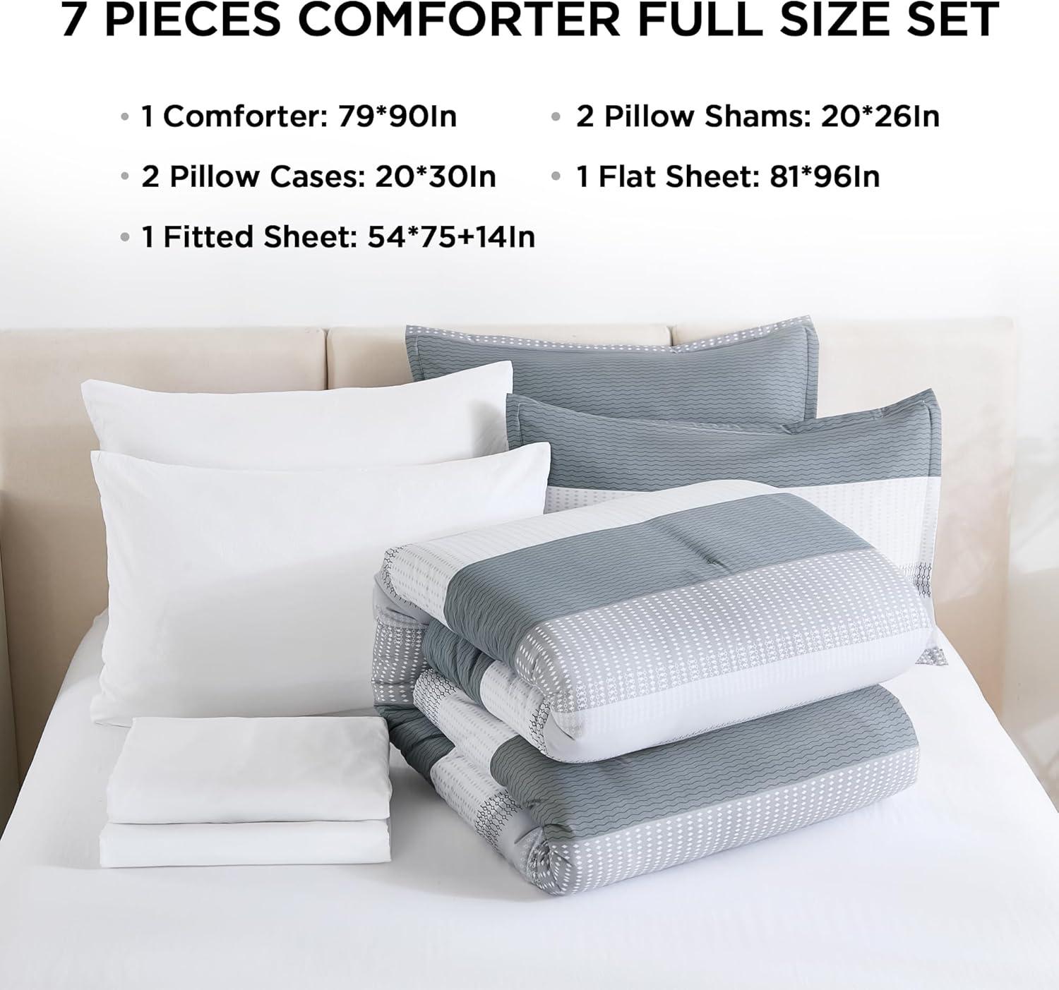 【What You Get】: You can get 7 pieces full size bed in a bag with 1x Comforter(79*90In)+ 2x Pillow shams(20*26In)+ 2x Pillowcases (20*30In)+ 1x Flat sheet(81*96In)+ 1x Fitted sheet(54*75+14In). Should you have any queries or require further assistance, please do not hesitate to contact us. We will provide a timely solution