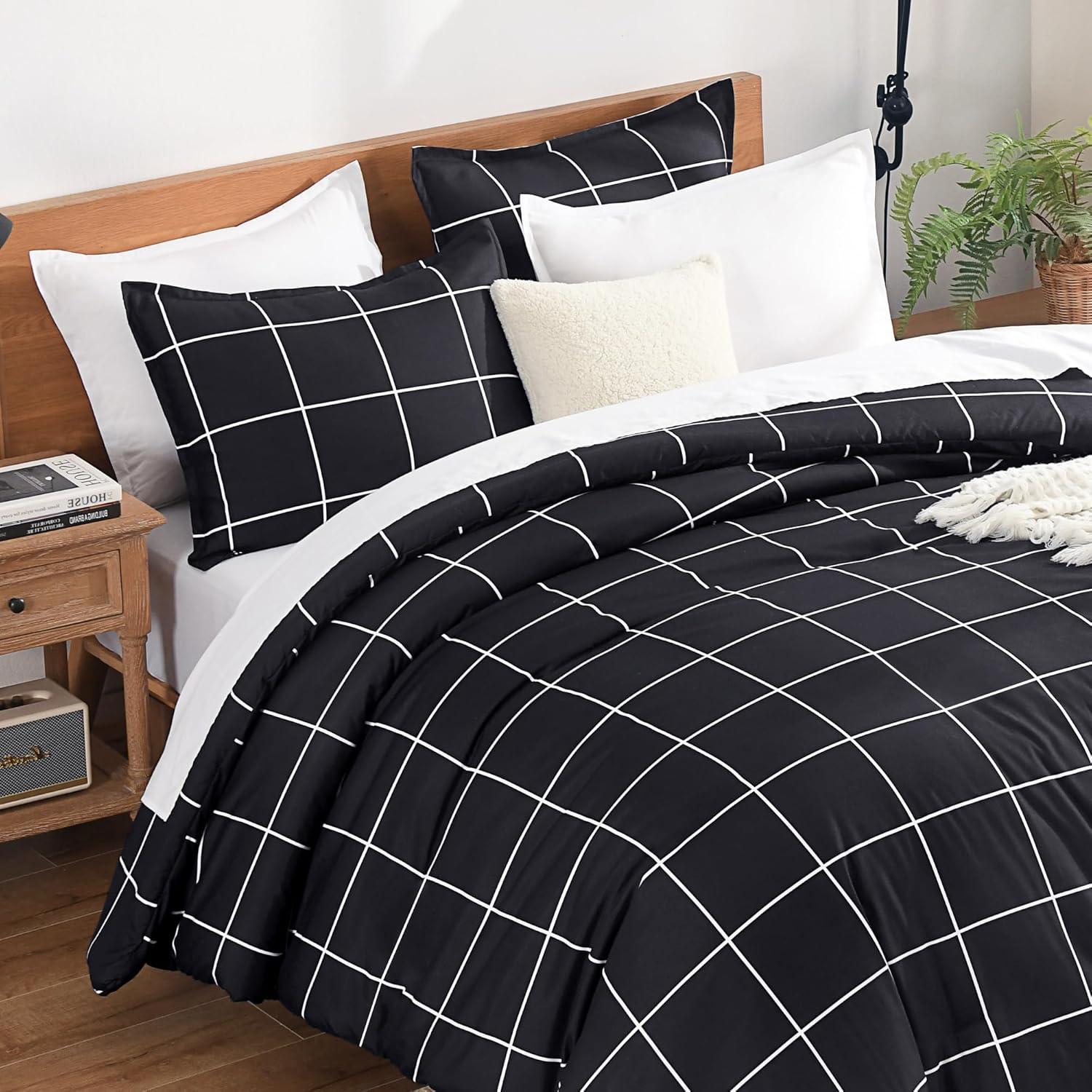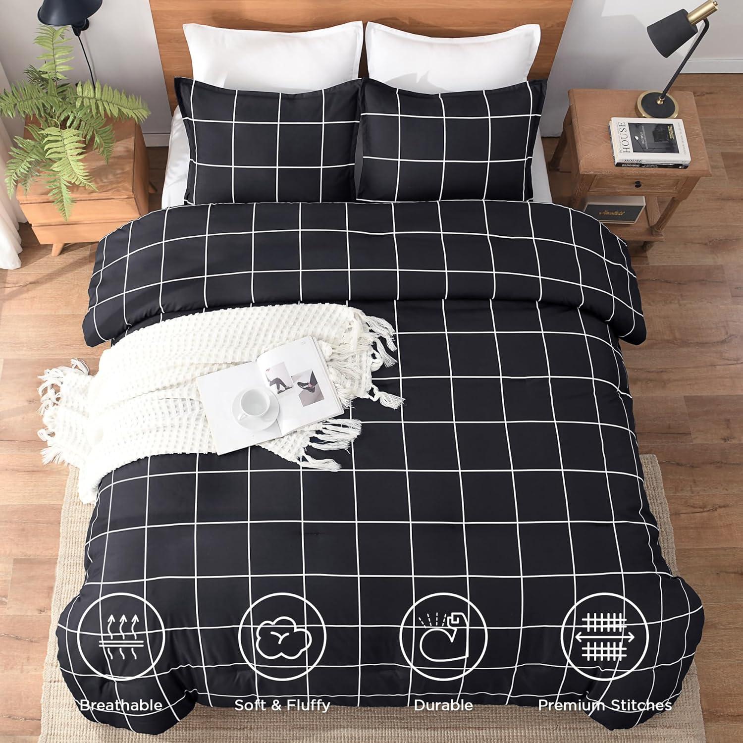 Andency Grey Queen Comforter Set, 3 Pieces Grey White Buffalo Check Plaid Bedding Comforter & Sets, Light Gray Soft Lightweight Fluffy All Season Bed Set(07 – Grid – Black)