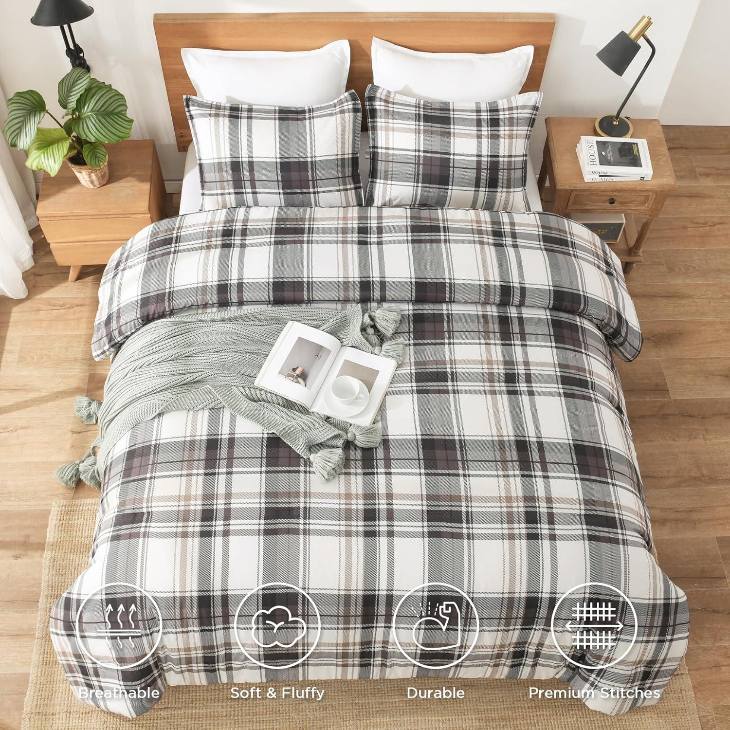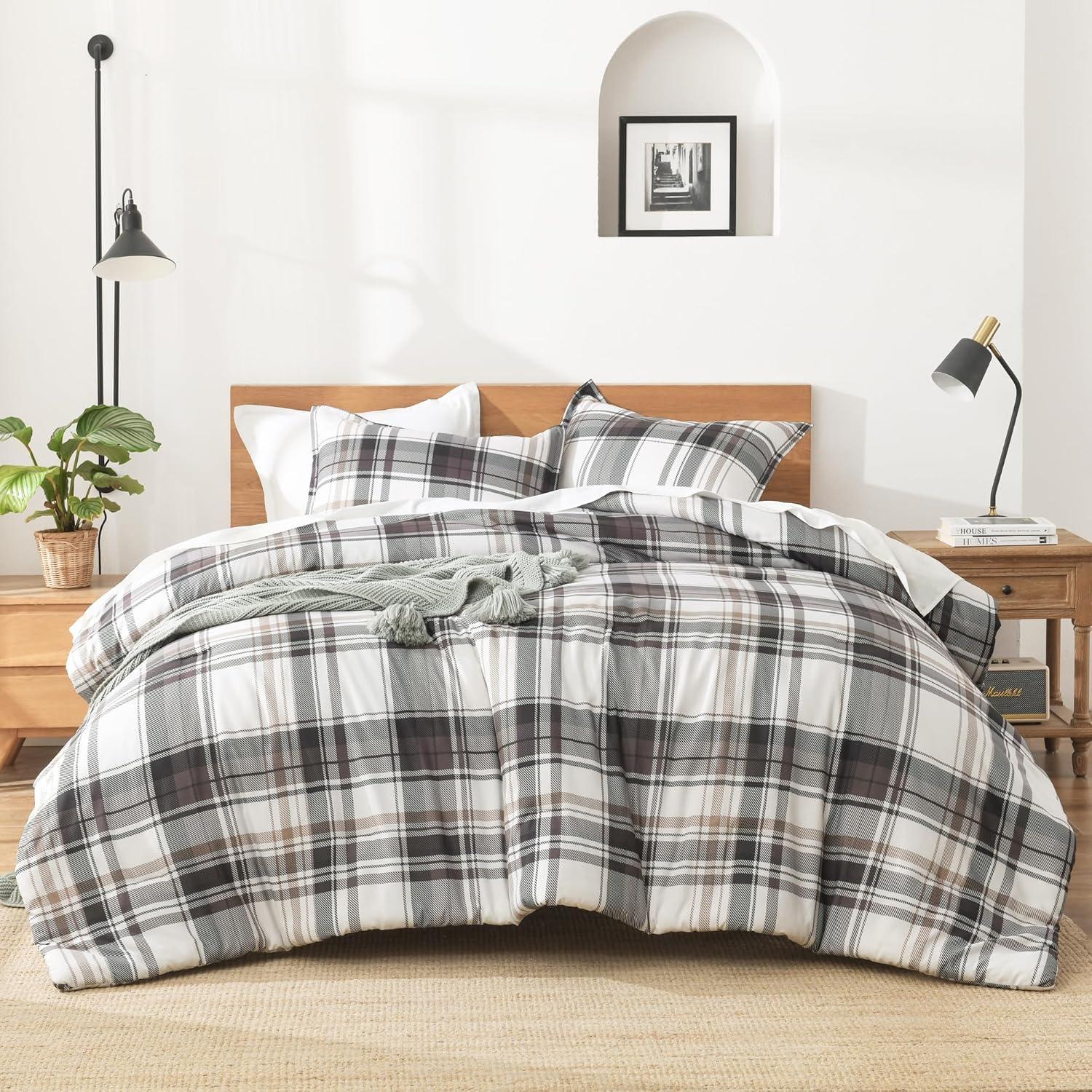 Andency Grey Queen Comforter Set, 3 Pieces Grey White Buffalo Check Plaid Bedding Comforter & Sets, Light Gray Soft Lightweight Fluffy All Season Bed Set(10 – Plaid – Brown Gray)