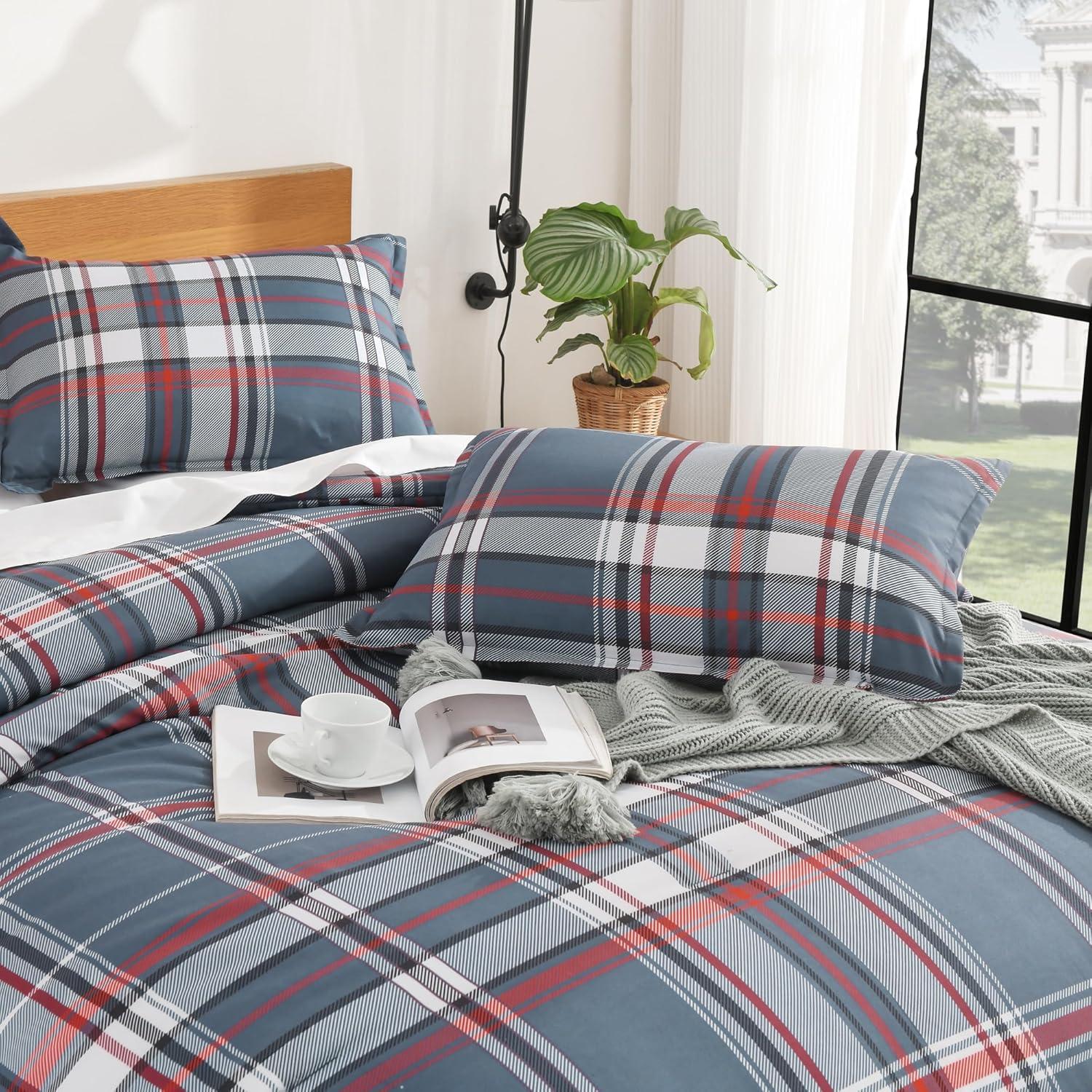 Andency Grey Queen Comforter Set, 3 Pieces Grey White Buffalo Check Plaid Bedding Comforter & Sets, Light Gray Soft Lightweight Fluffy All Season Bed Set(11 - Plaid - Navy Red)