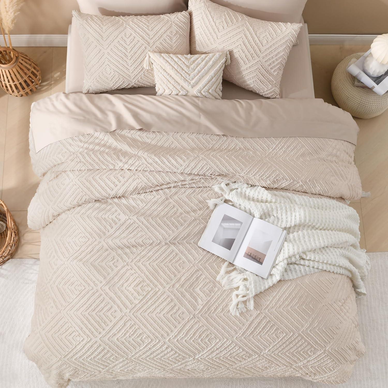 【Superior Fabric】Andency beige comforter features a reversible design with delicate and lovely tufts on the front, stunningly soft and skin-friendly brushed microfiber on the reverse, providing you with a comfortable night's sleep all year round!