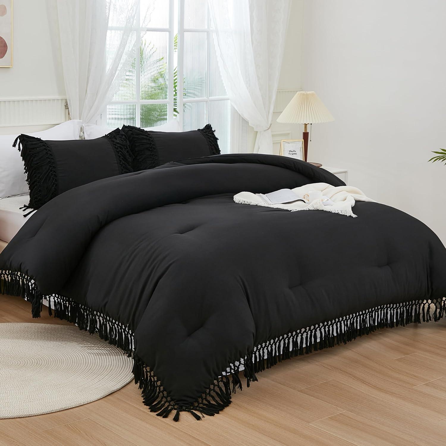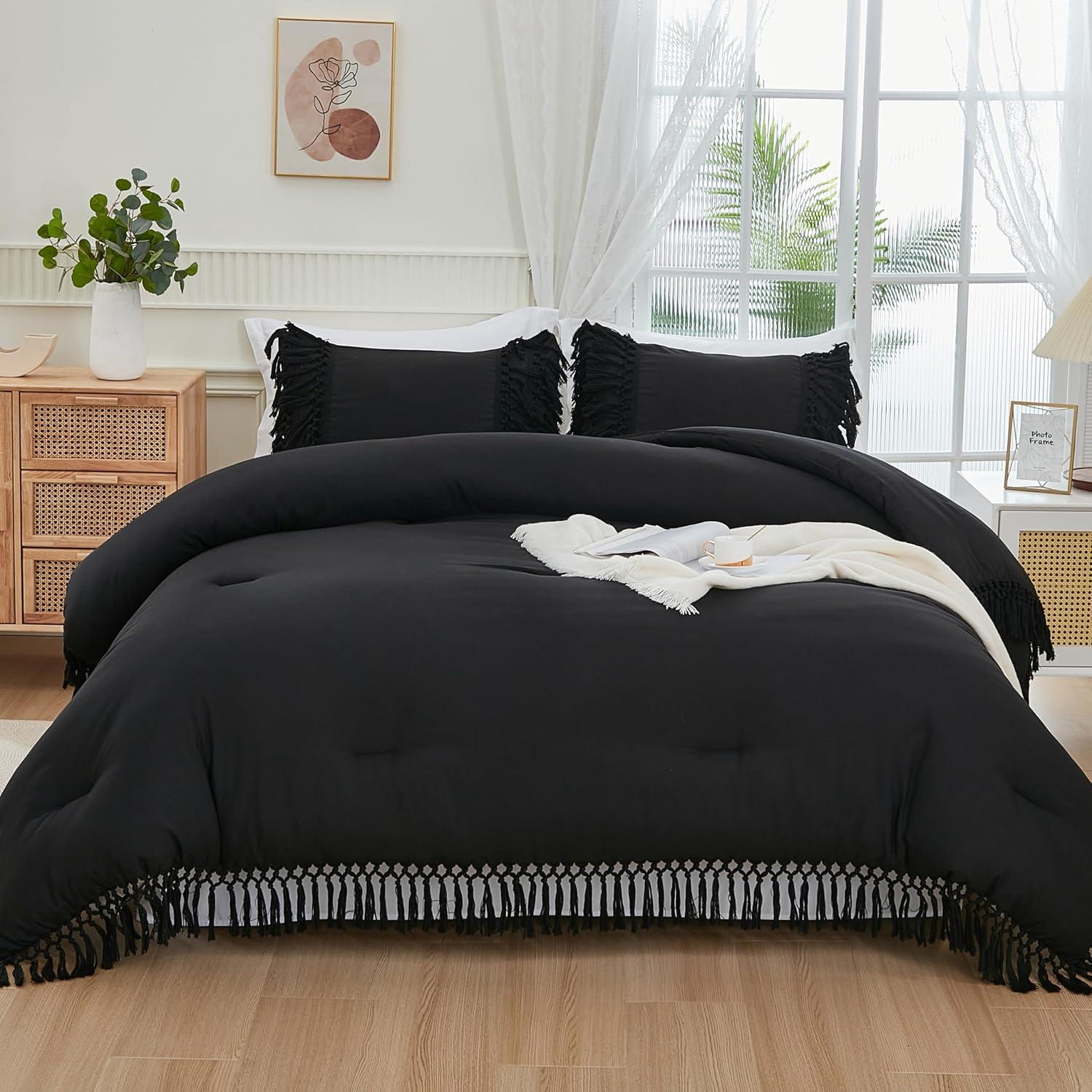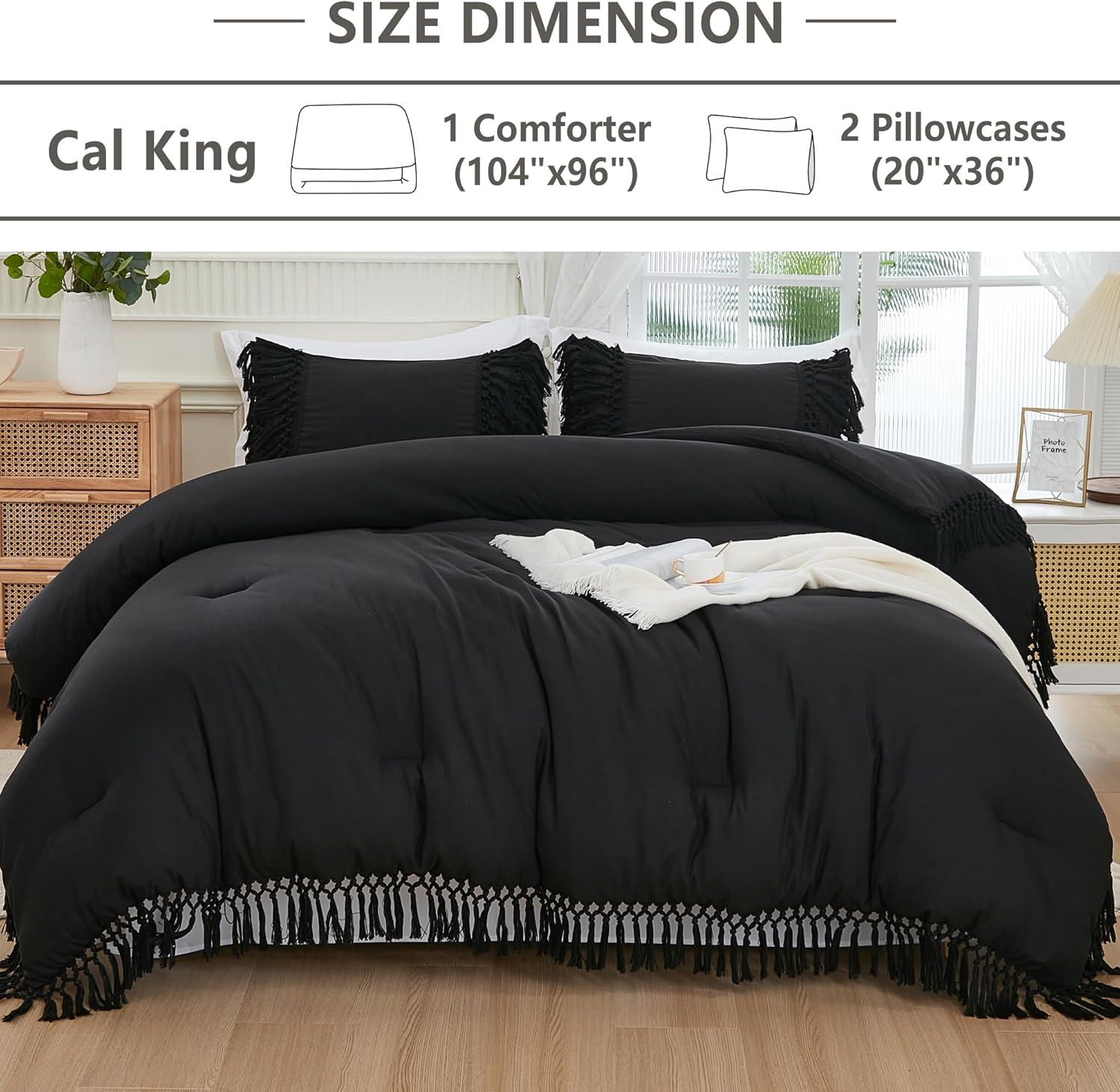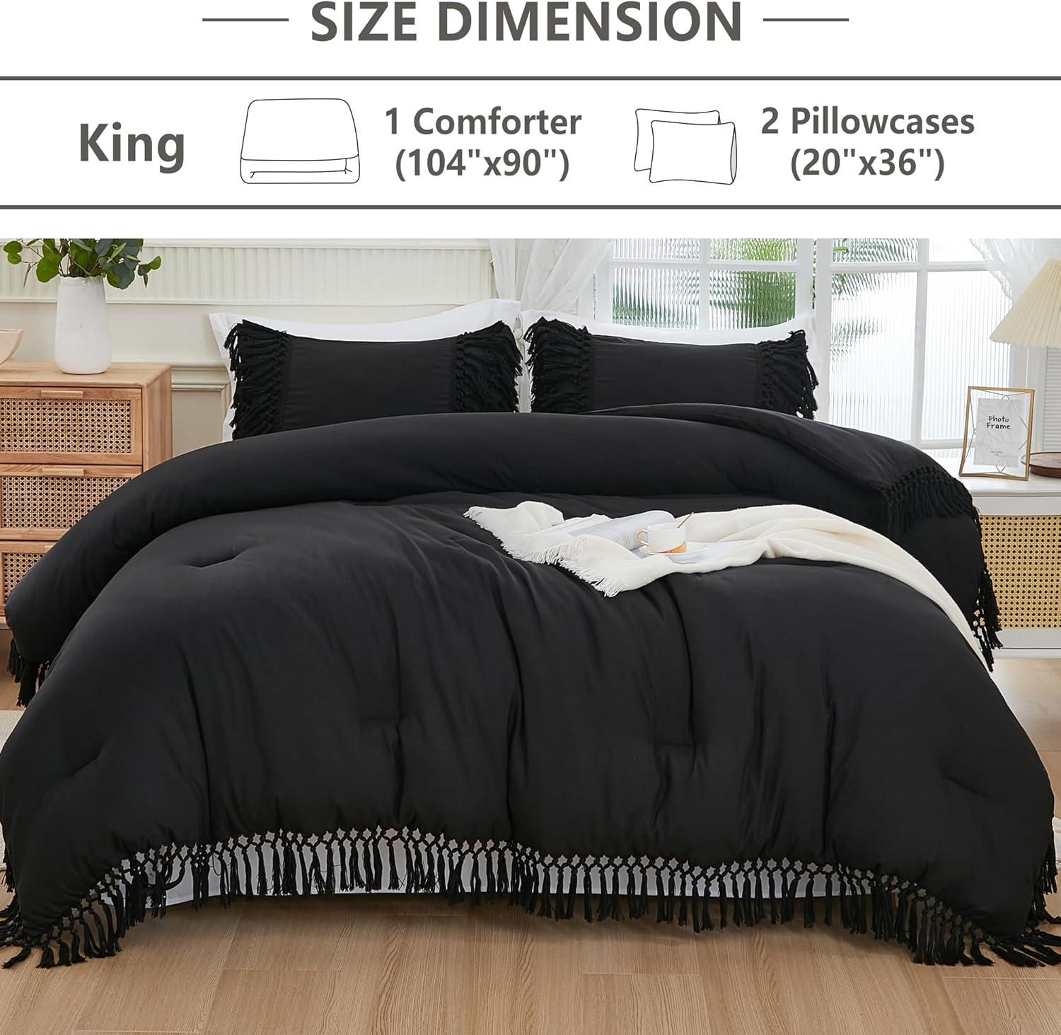 Andency King Size Comforter Set Beige, 3 Pieces Boho Tassel Lightweight Soft Bedding Comforter Sets for King Bed, All Season Fluffy Bed Set (104x90In Comforter & 2 Pillowcases)(Black)
