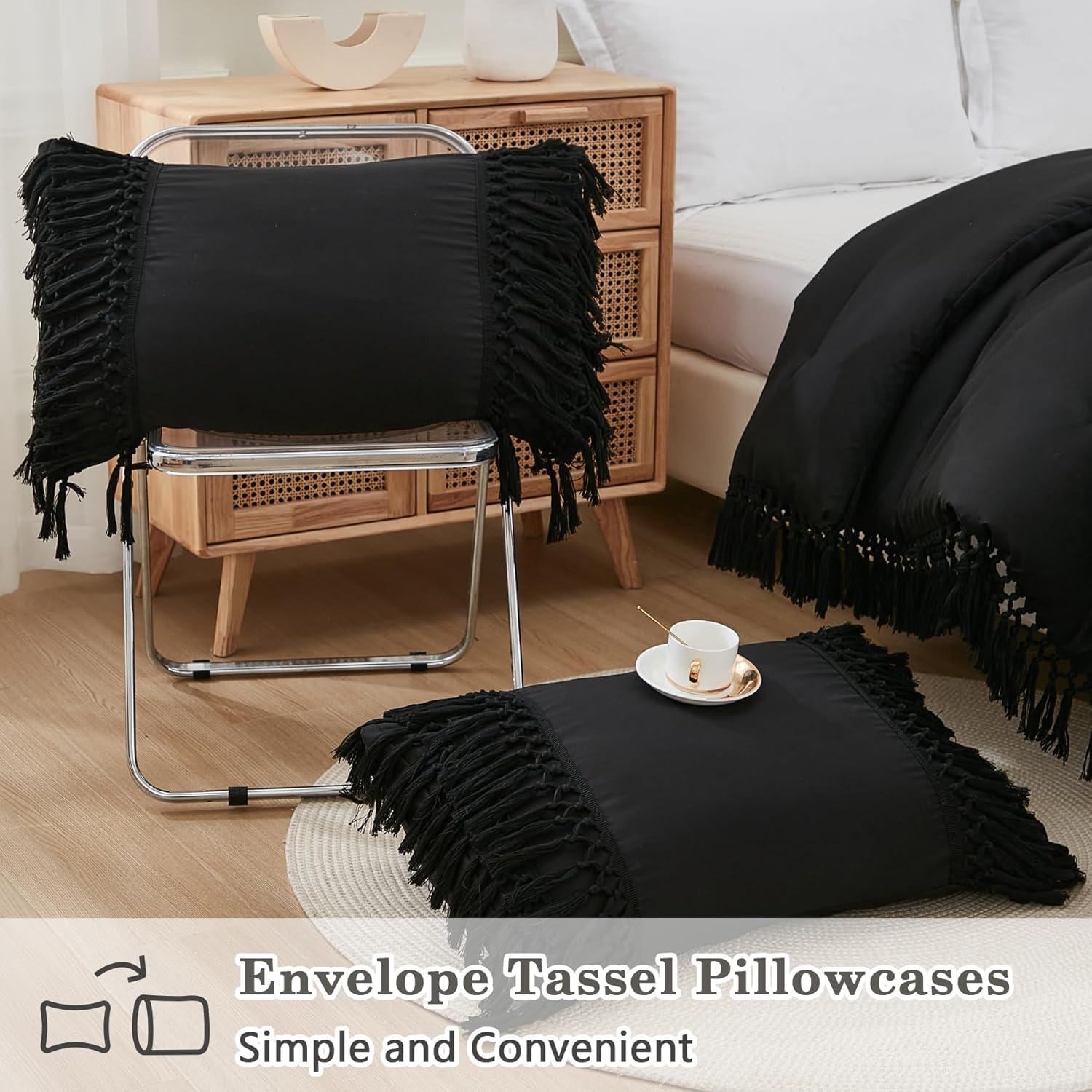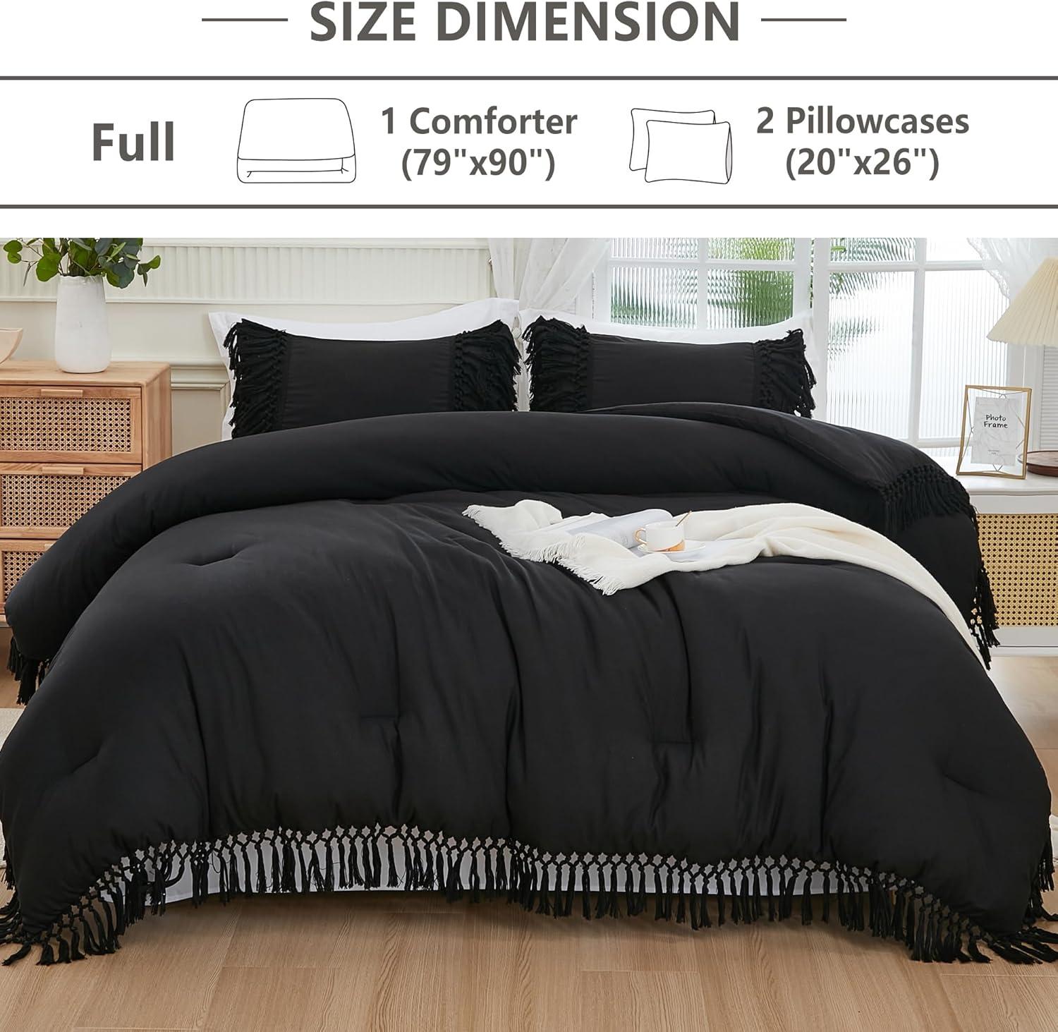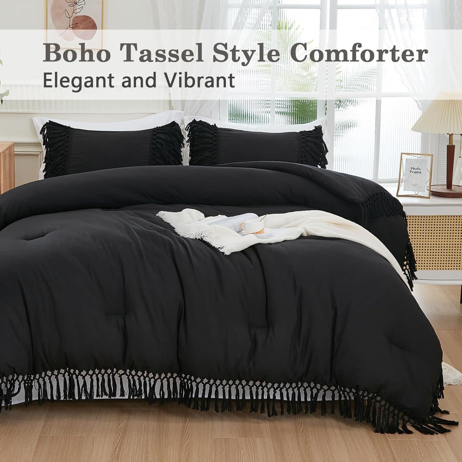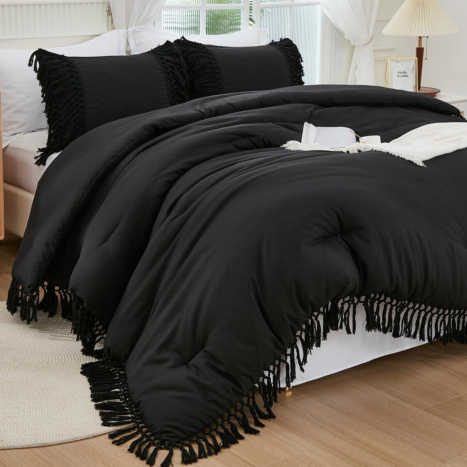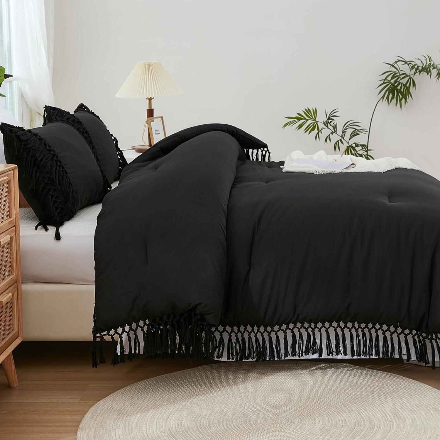 Andency King Size Comforter Set Beige, 3 Pieces Boho Tassel Lightweight Soft Bedding Comforter Sets for King Bed, All Season Fluffy Bed Set (104x90In Comforter & 2 Pillowcases)(Black)