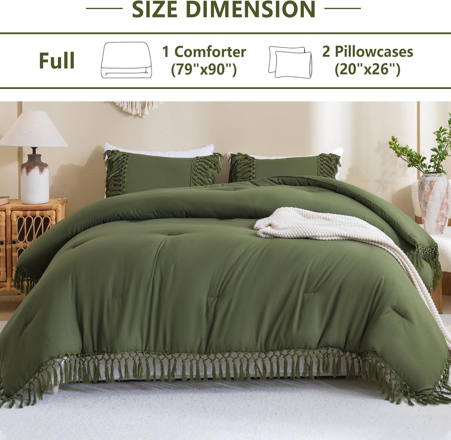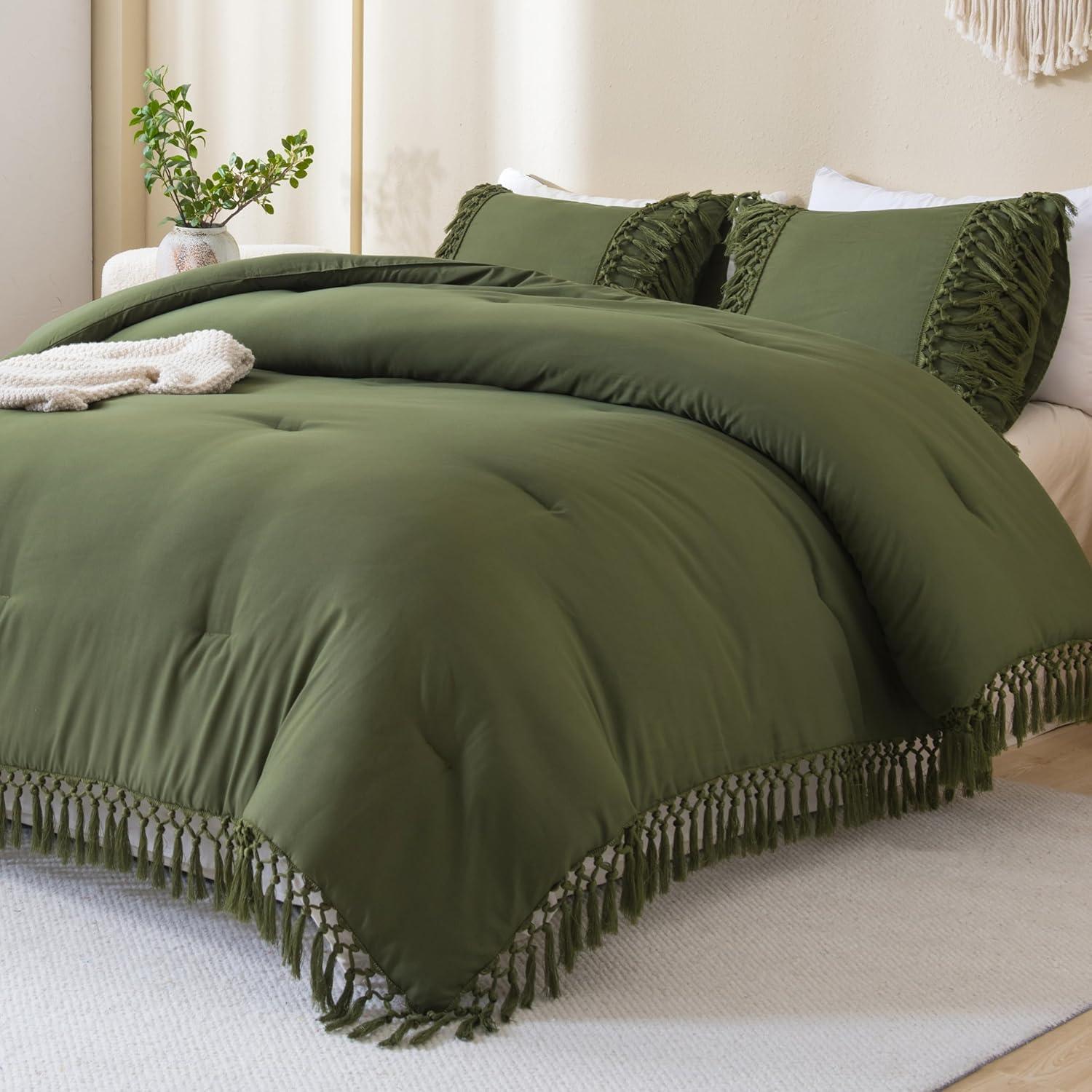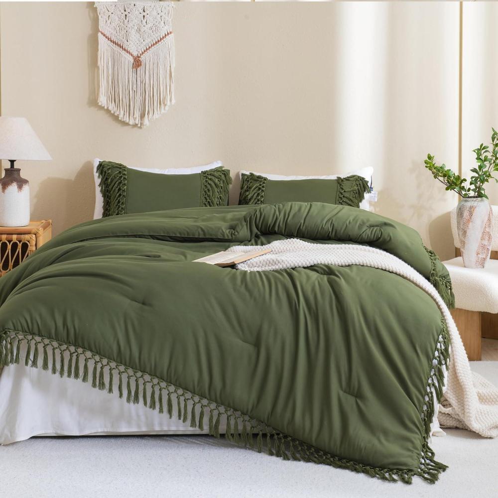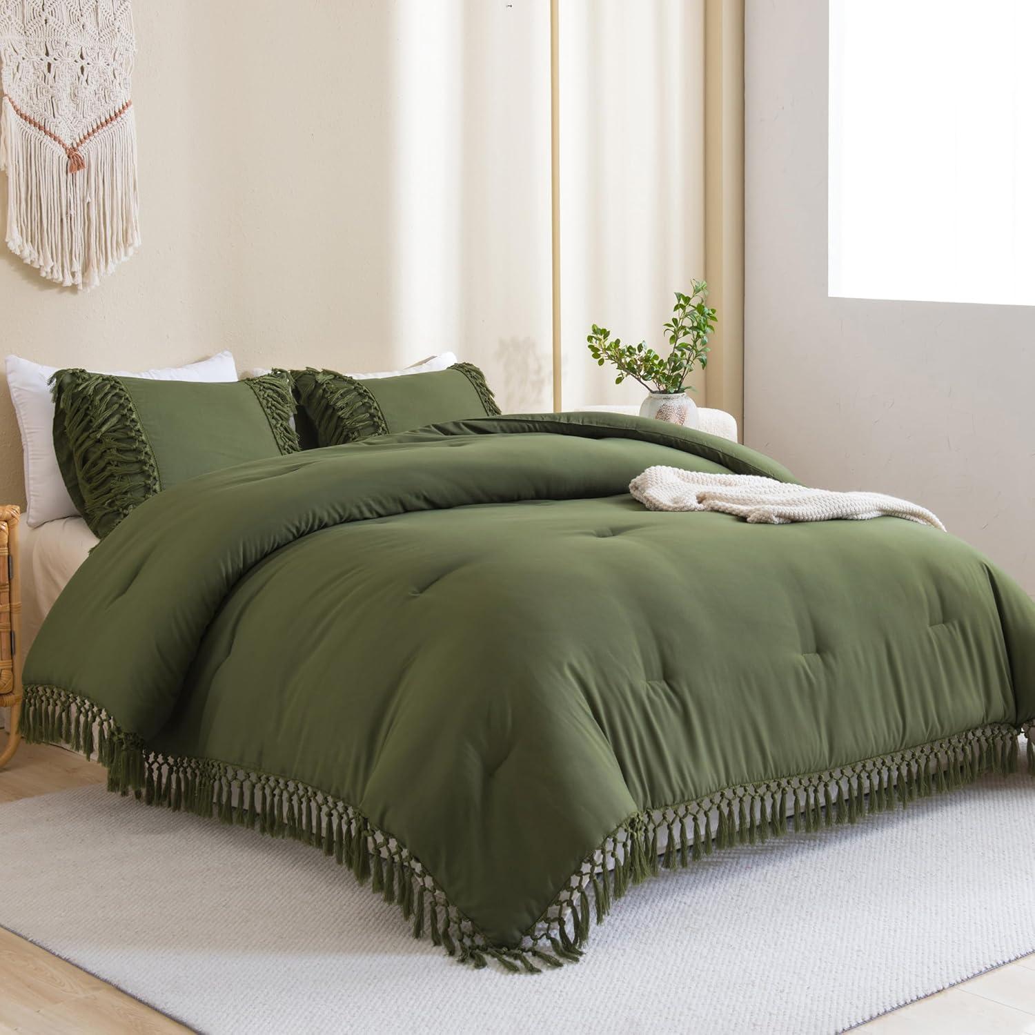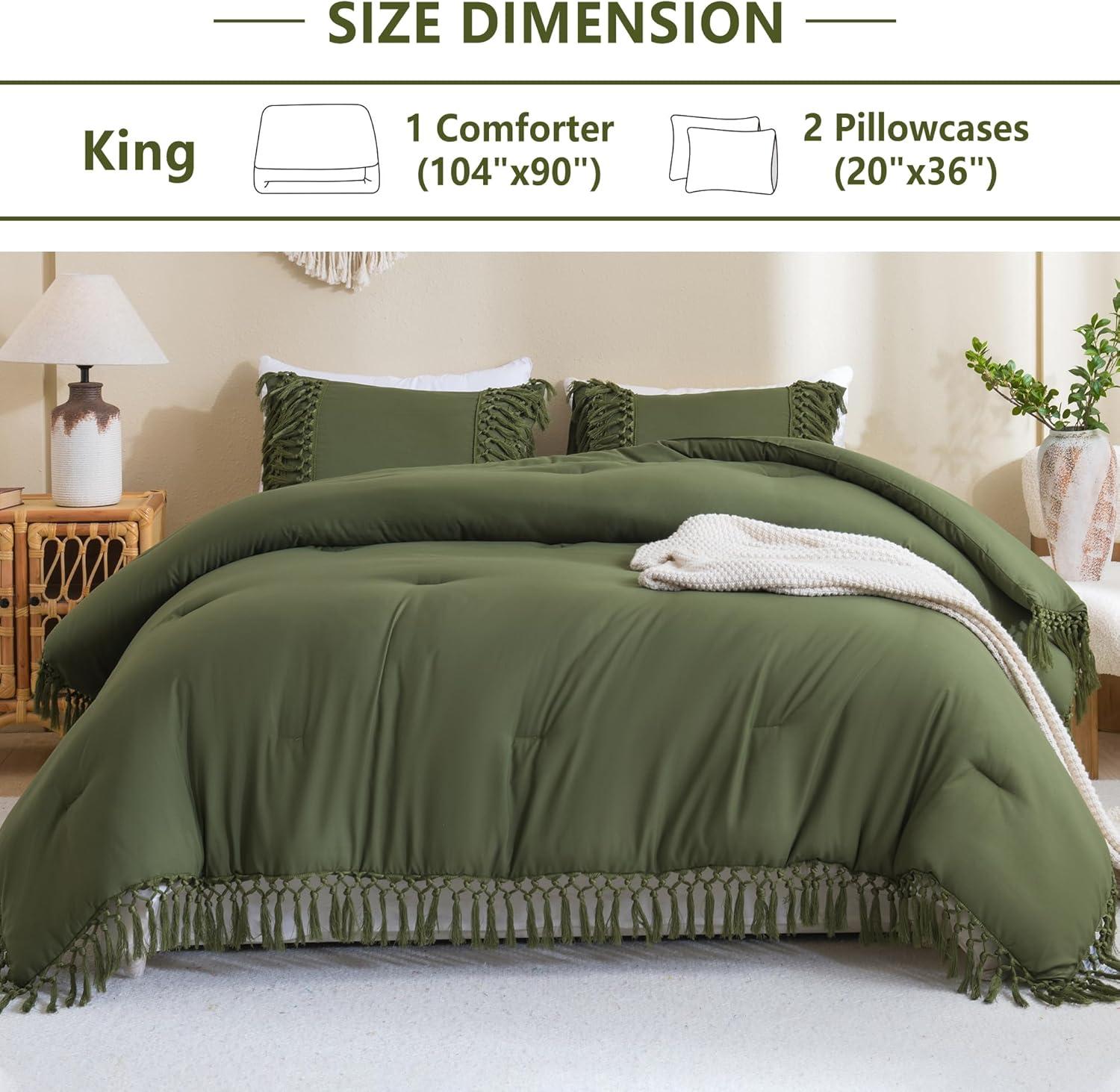 Andency King Size Comforter Set Beige, 3 Pieces Boho Tassel Lightweight Soft Bedding Comforter Sets for King Bed, All Season Fluffy Bed Set (104x90In Comforter & 2 Pillowcases)(Olive Green)
