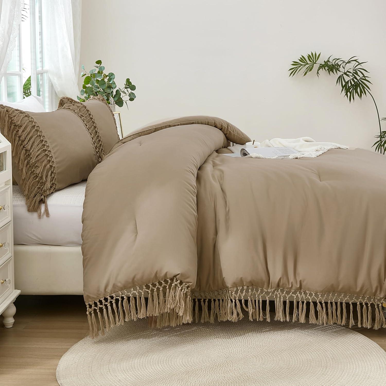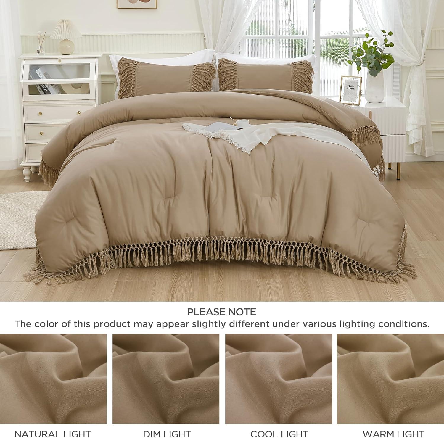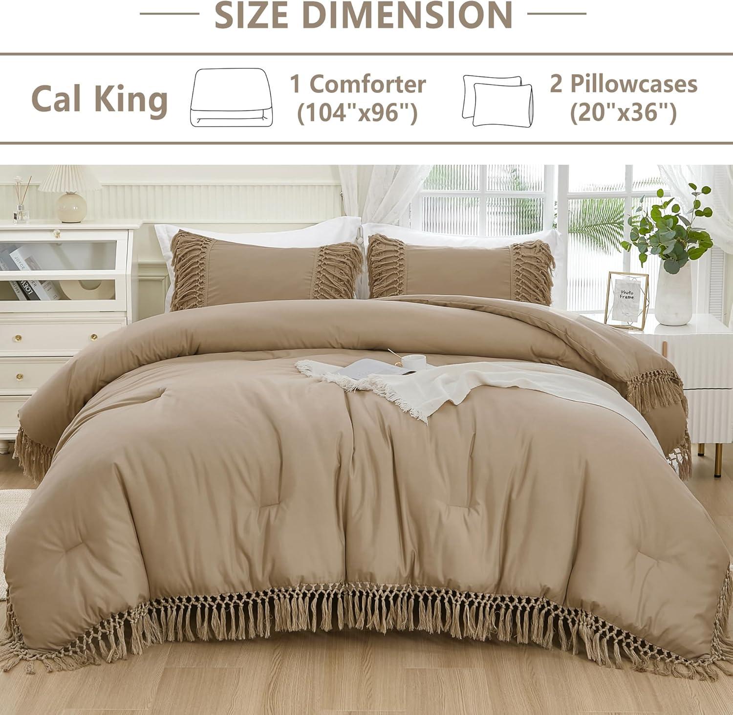 Andency King Size Comforter Set Beige, 3 Pieces Boho Tassel Lightweight Soft Bedding Comforter Sets for King Bed, All Season Fluffy Bed Set (104x90In Comforter & 2 Pillowcases)(Taupe)