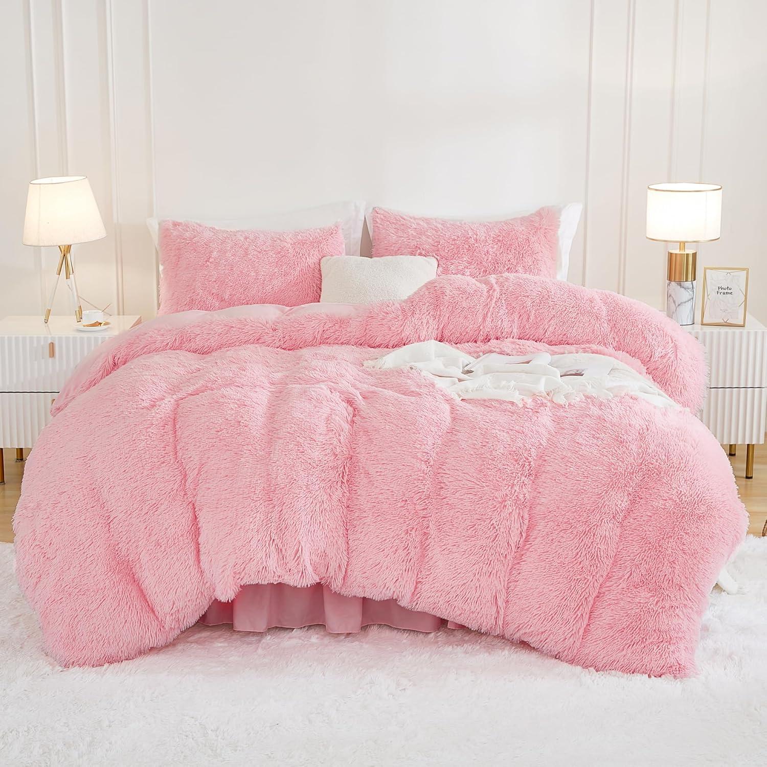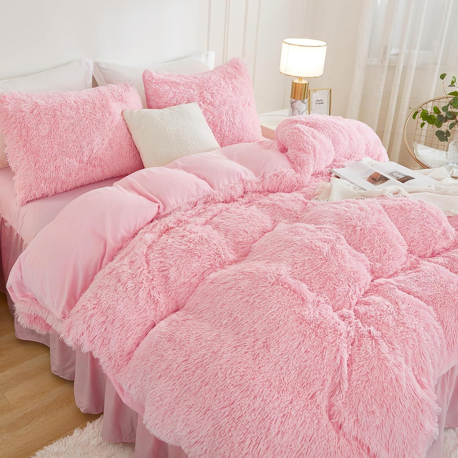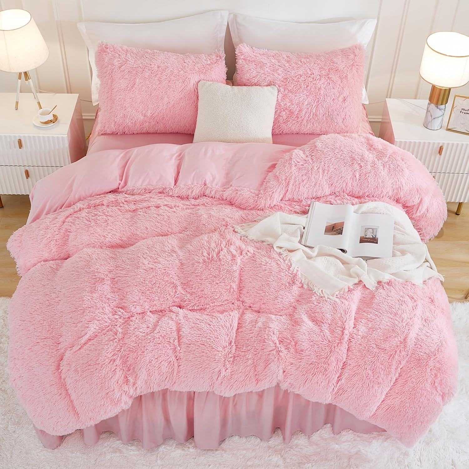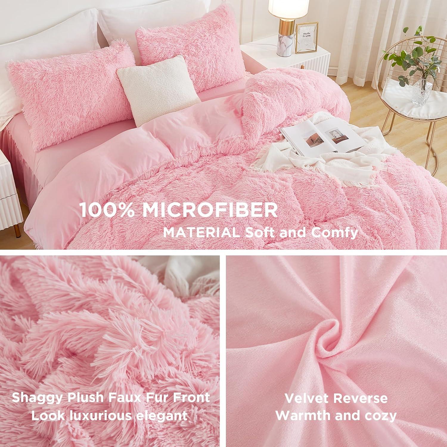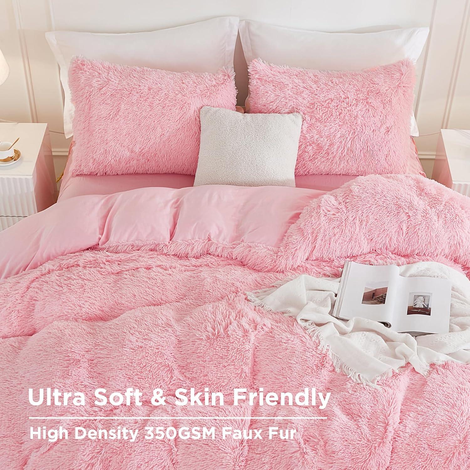 Andency Queen Comforter Set Black, Fluffy Winter Faux Fur Warm Soft Plush Bedding Comforter Set (1 Velvet Comforter & 2 Pillowcases), Fuzzy Thick Heavy Puffy Comforters Bed Set(04 - Pink)