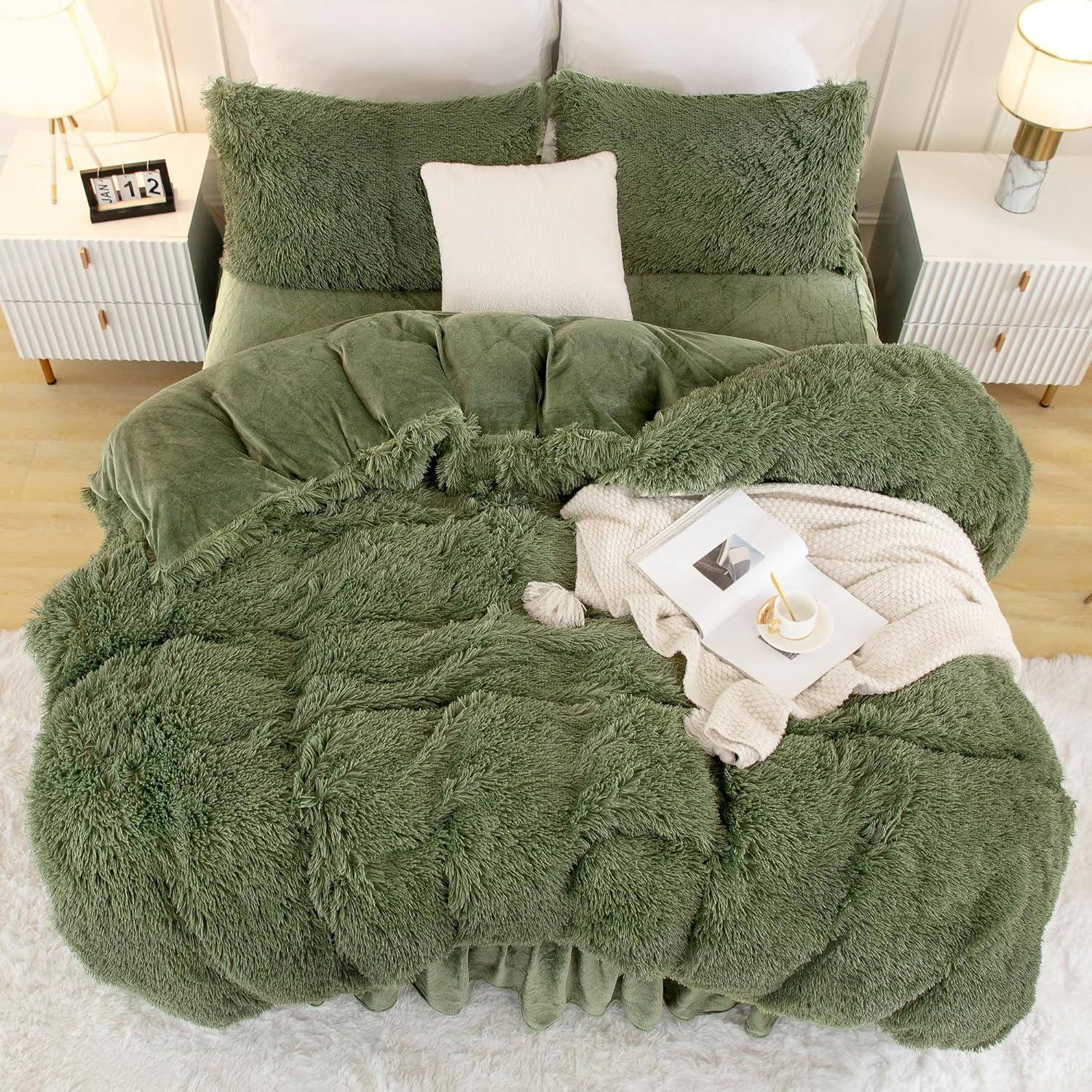 Andency Queen Comforter Set Black, Fluffy Winter Faux Fur Warm Soft Plush Bedding Comforter Set (1 Velvet Comforter & 2 Pillowcases), Fuzzy Thick Heavy Puffy Comforters Bed Set(06 - Green)