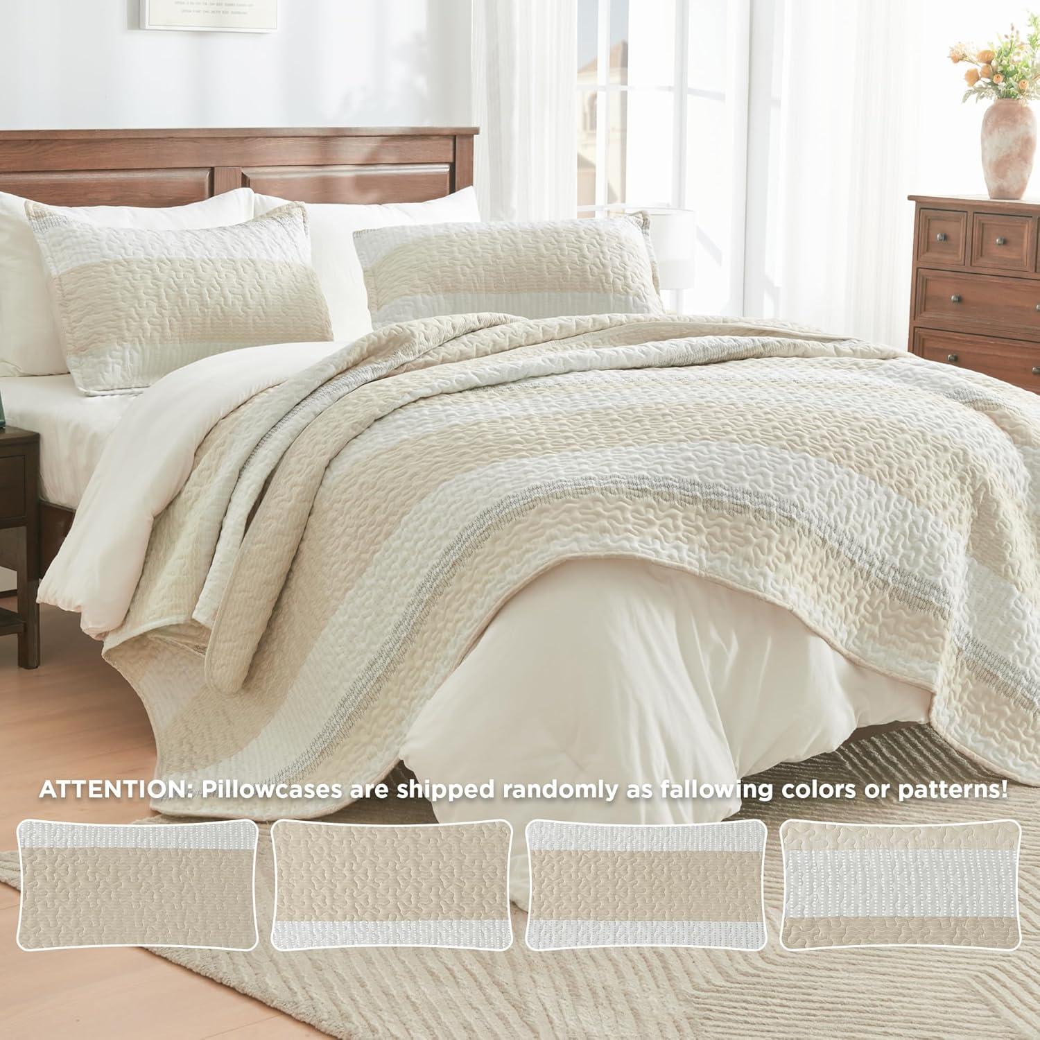 Andency Queen Quilt Bedding Set Beige, 3 Pieces Patchwork Beige Striped Ultra Soft Lightweight Bedspreads, Coverlets Set with 2 Pillow Shams for All Seasons (90"x96")(05 - Beige)