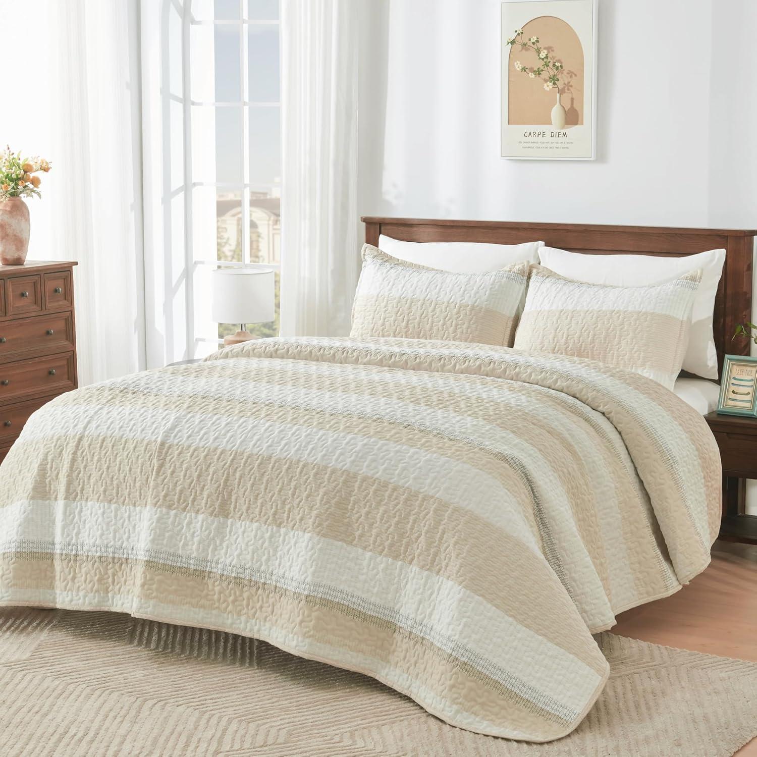 Andency Queen Quilt Bedding Set Beige, 3 Pieces Patchwork Beige Striped Ultra Soft Lightweight Bedspreads, Coverlets Set with 2 Pillow Shams for All Seasons (90″x96″)(05 – Beige)