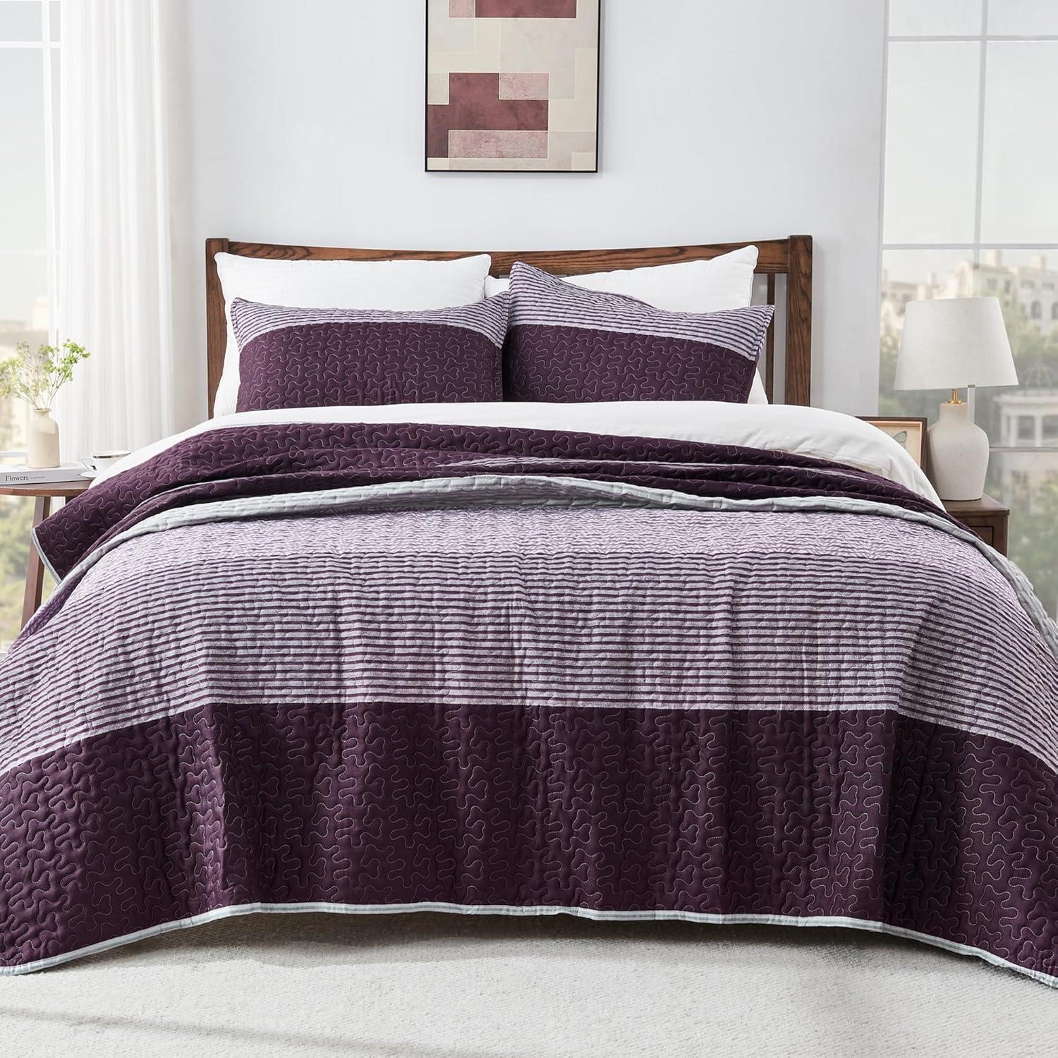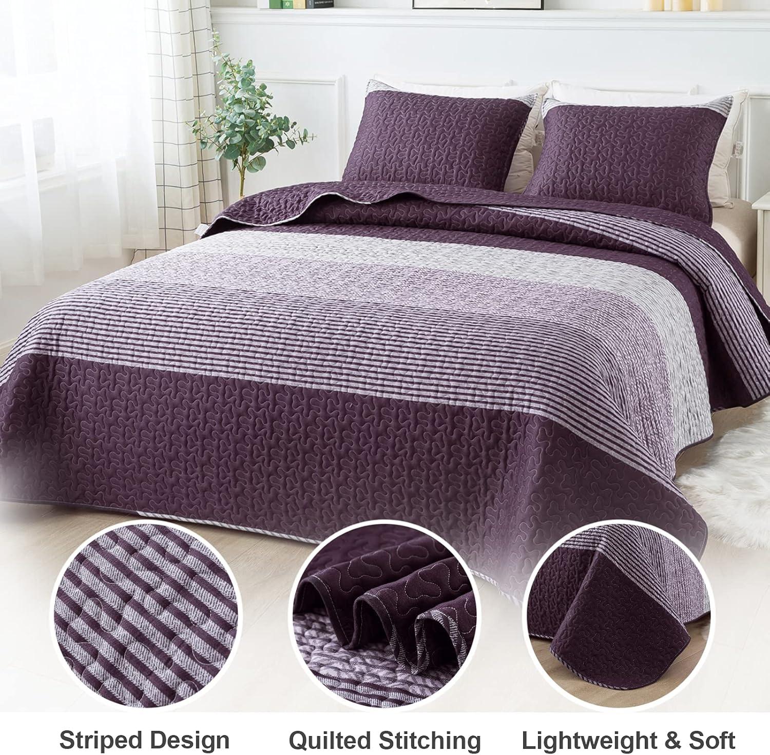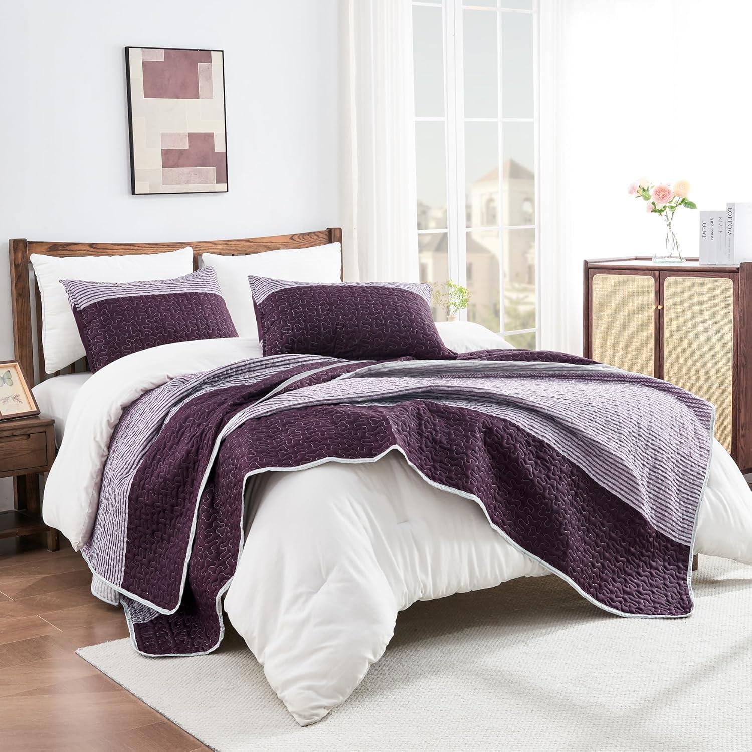 Andency Queen Quilt Bedding Set Beige, 3 Pieces Patchwork Beige Striped Ultra Soft Lightweight Bedspreads, Coverlets Set with 2 Pillow Shams for All Seasons (90"x96")(08 - Purple Gray)