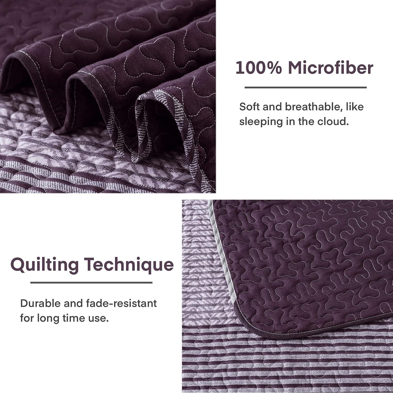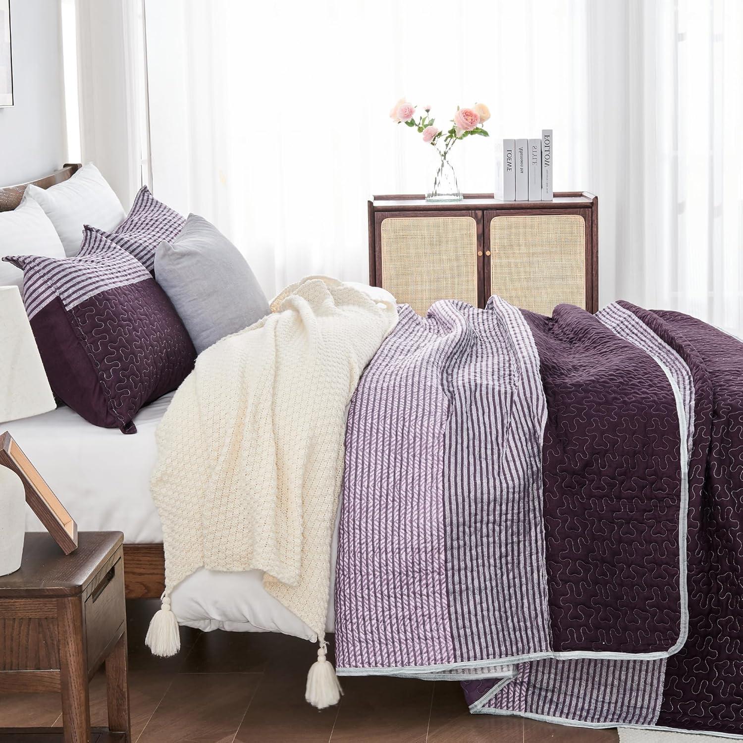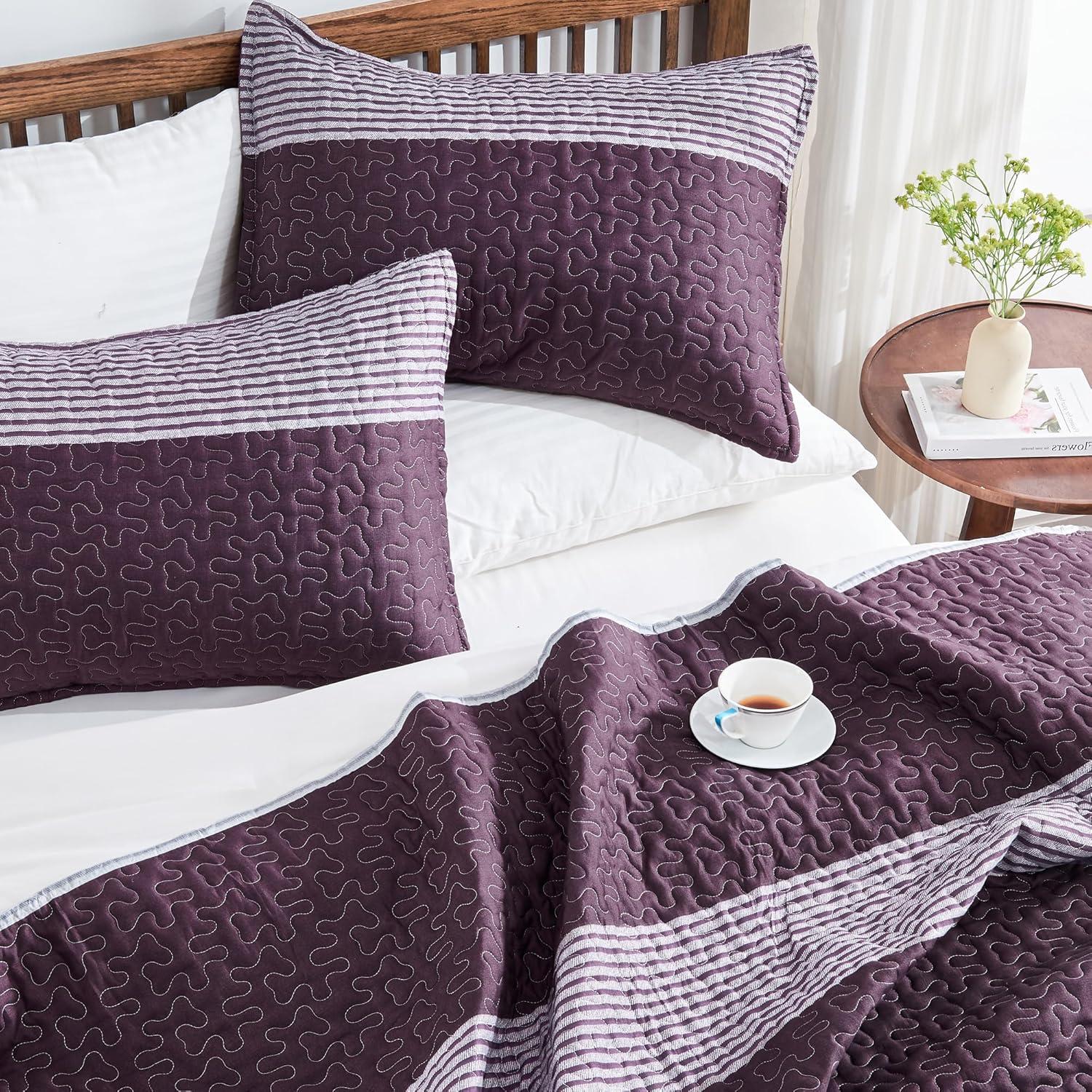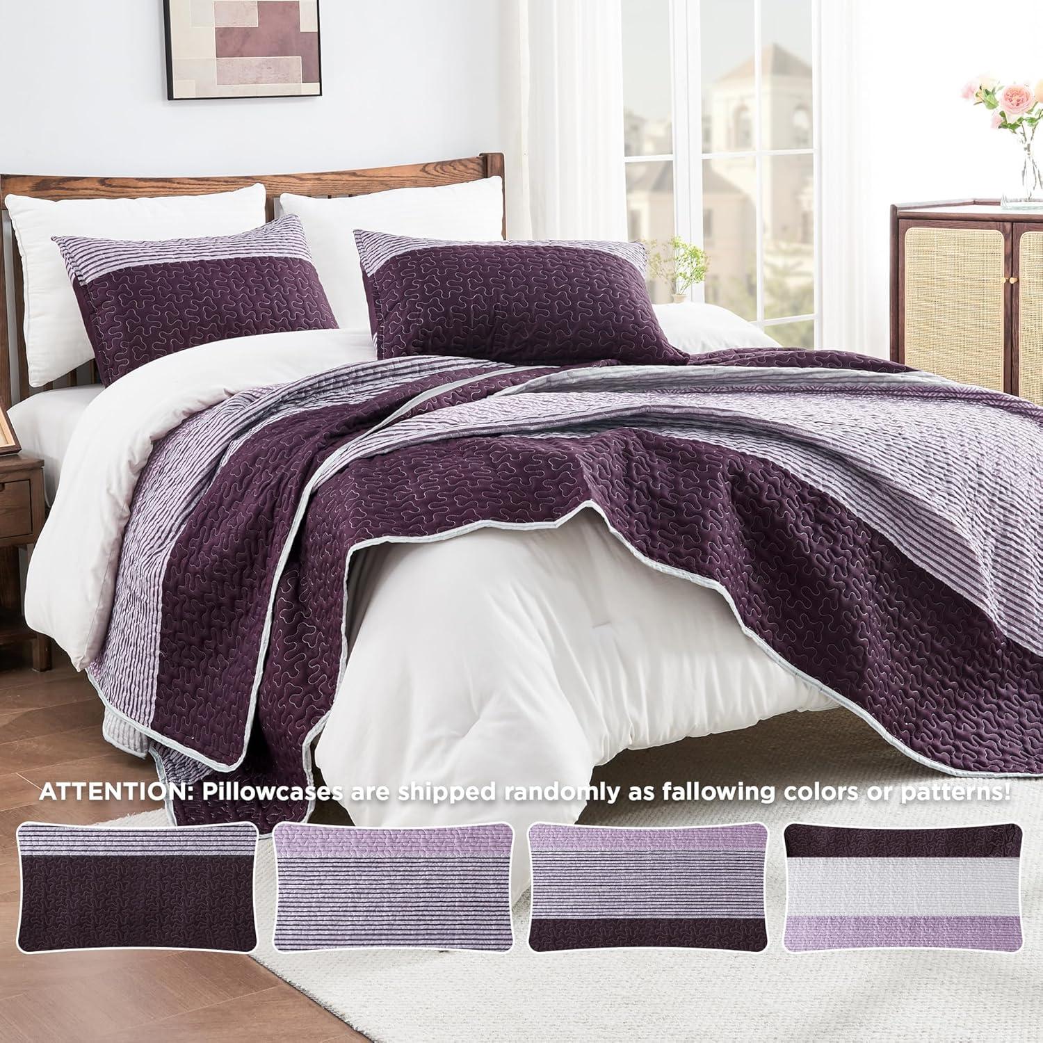 Andency Queen Quilt Bedding Set Beige, 3 Pieces Patchwork Beige Striped Ultra Soft Lightweight Bedspreads, Coverlets Set with 2 Pillow Shams for All Seasons (90"x96")(08 - Purple Gray)