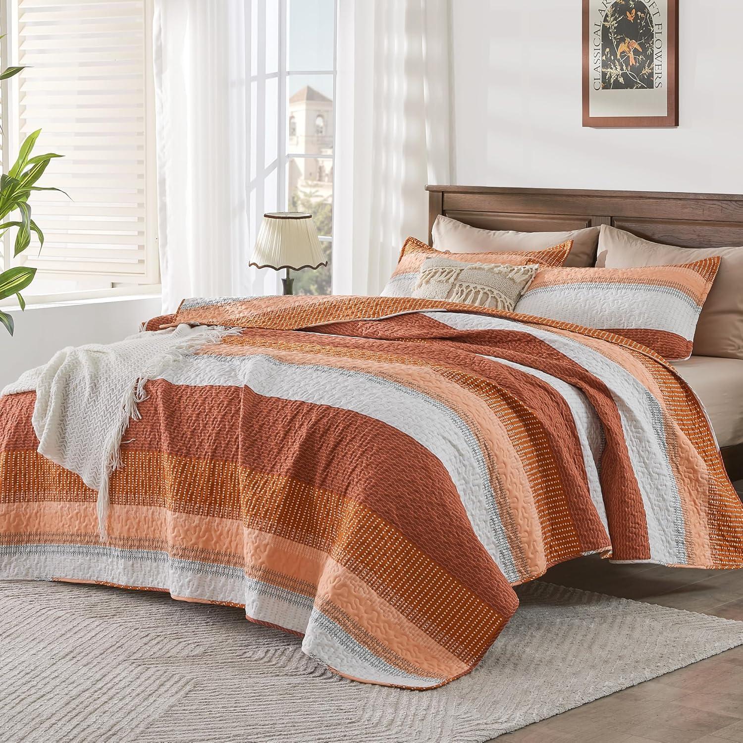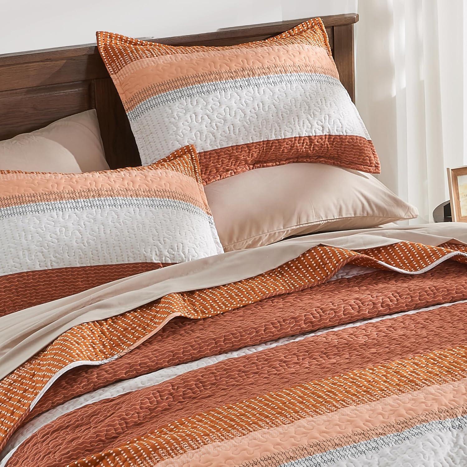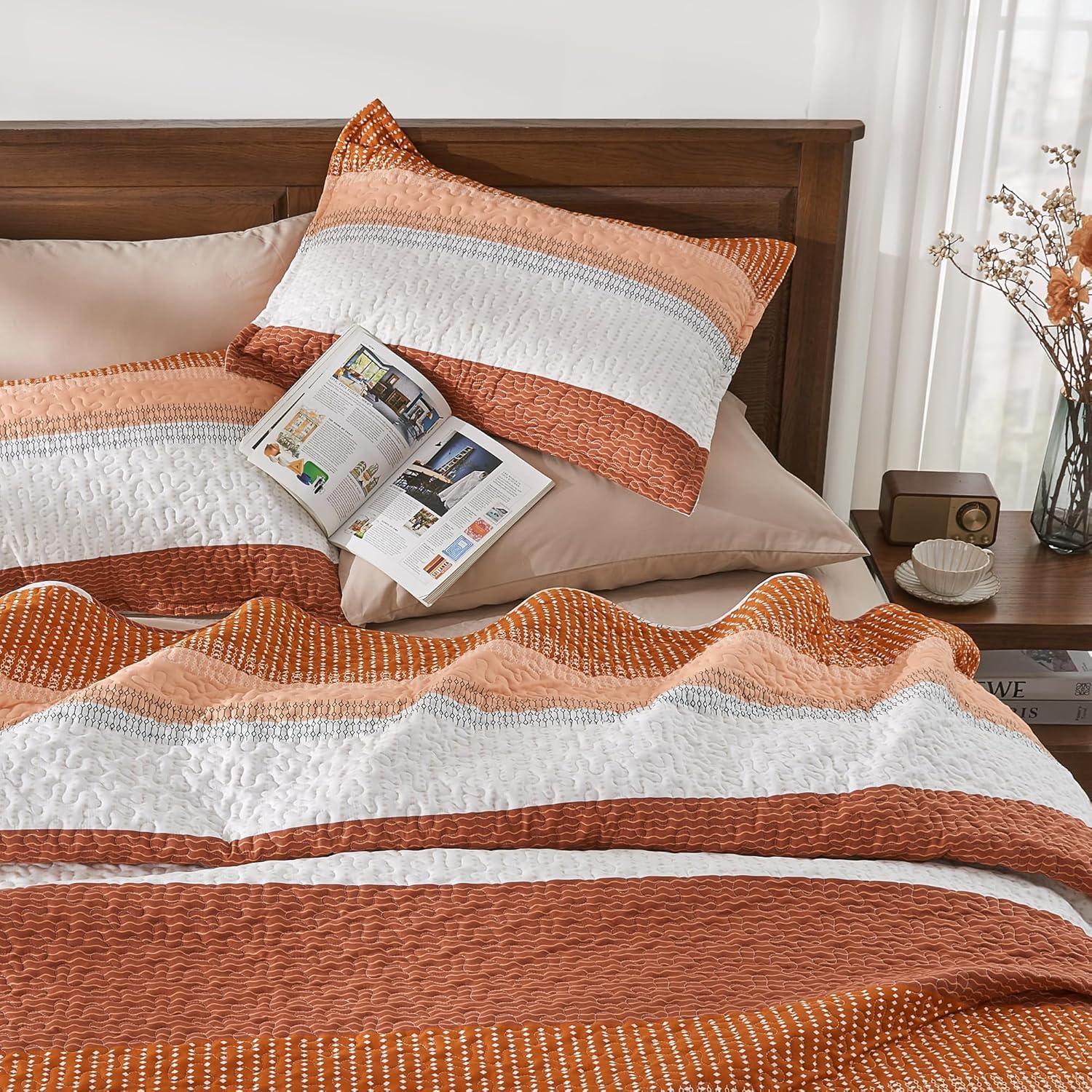 Andency Queen Quilt Bedding Set Beige, 3 Pieces Patchwork Beige Striped Ultra Soft Lightweight Bedspreads, Coverlets Set with 2 Pillow Shams for All Seasons (90″x96″)(10 – Orange)