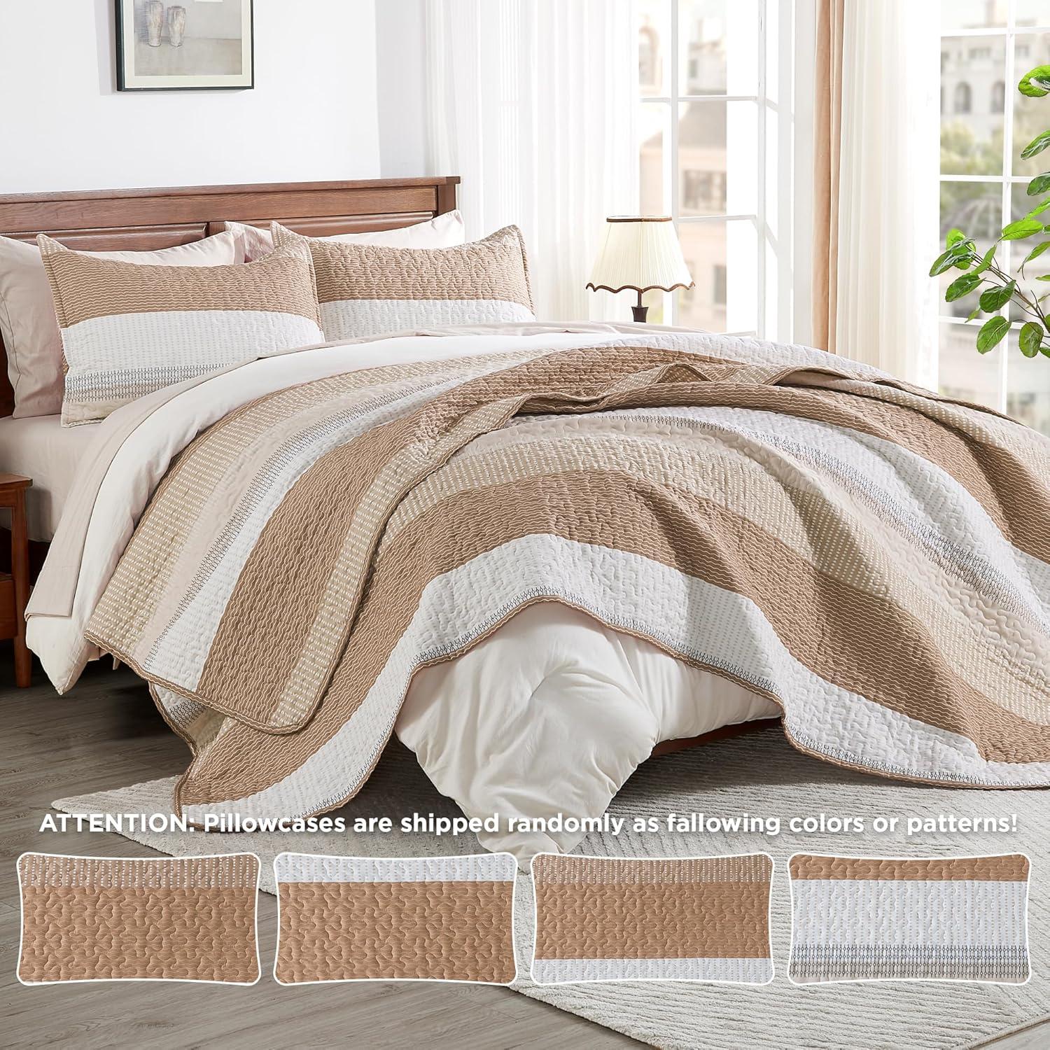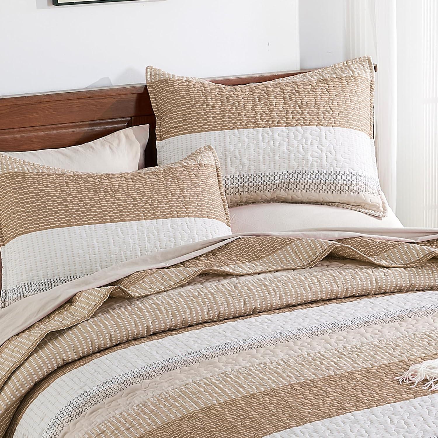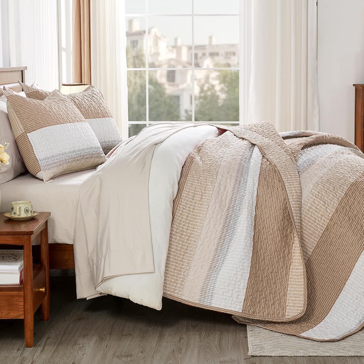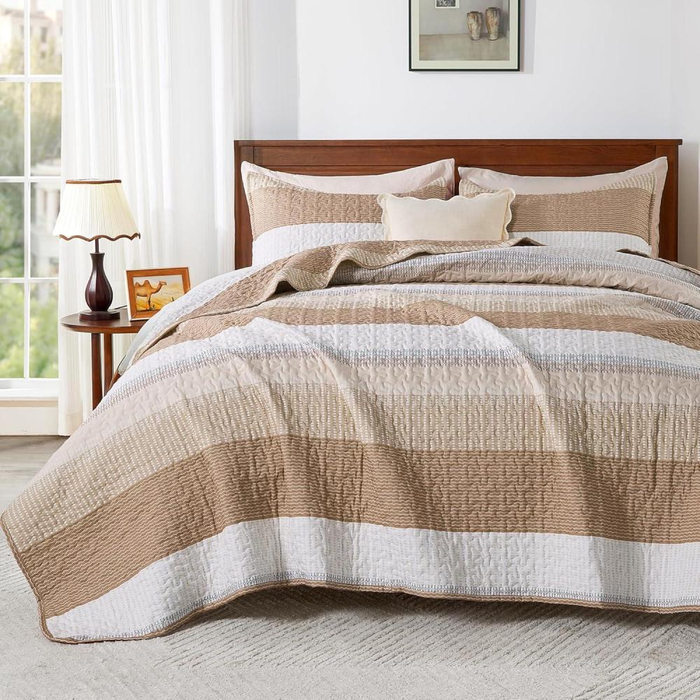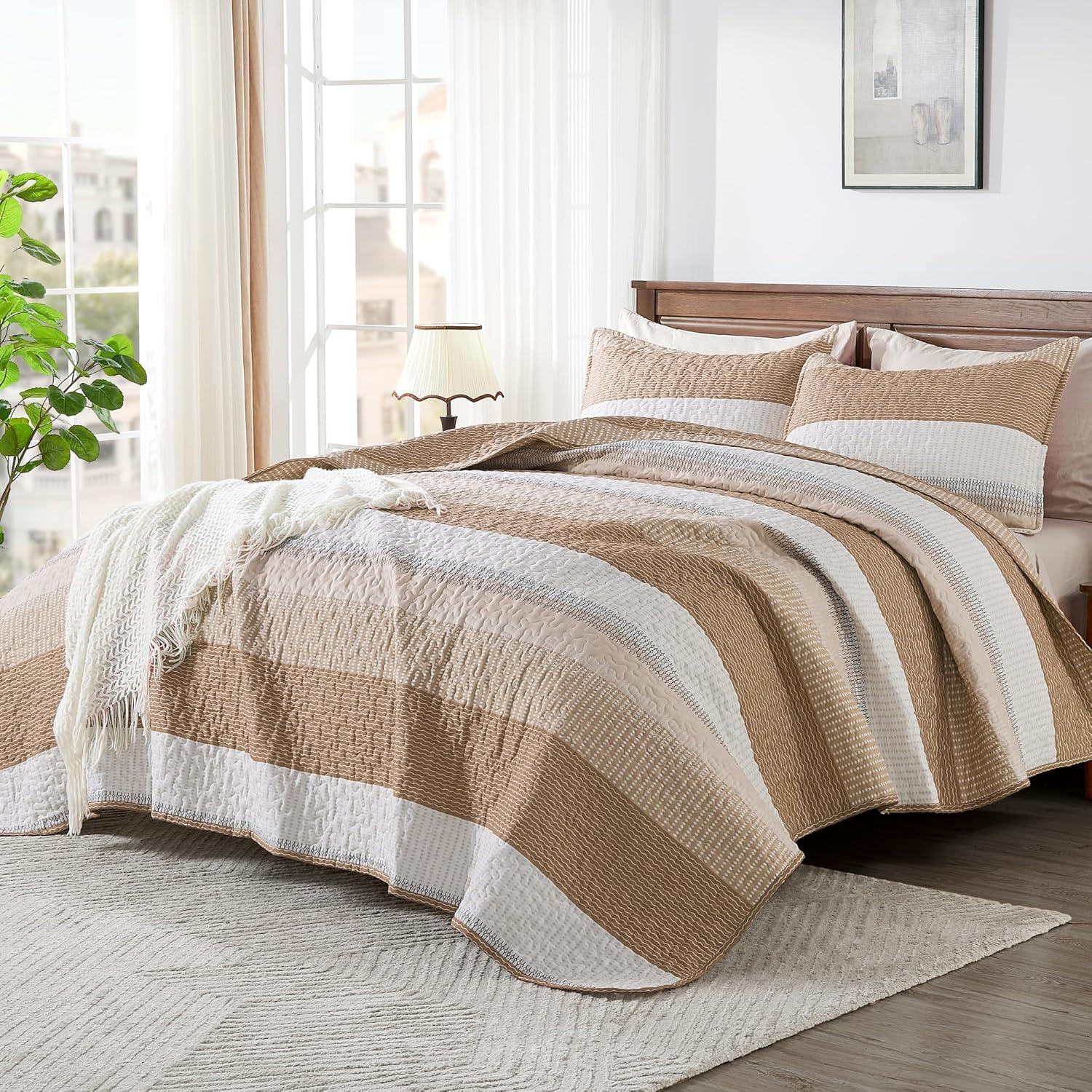 Andency Queen Quilt Bedding Set Beige, 3 Pieces Patchwork Beige Striped Ultra Soft Lightweight Bedspreads, Coverlets Set with 2 Pillow Shams for All Seasons (90″x96″)(12 – Taupe)