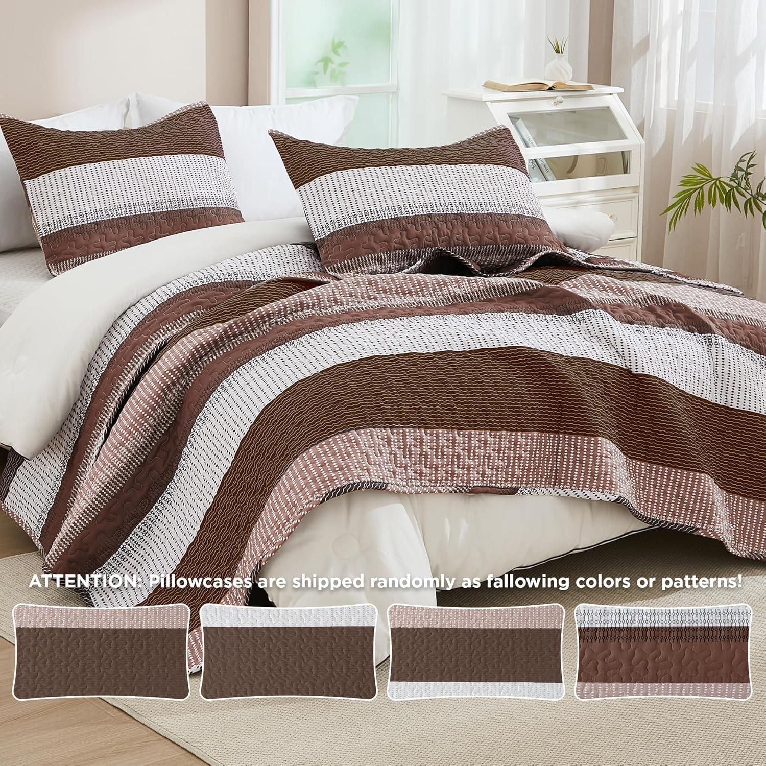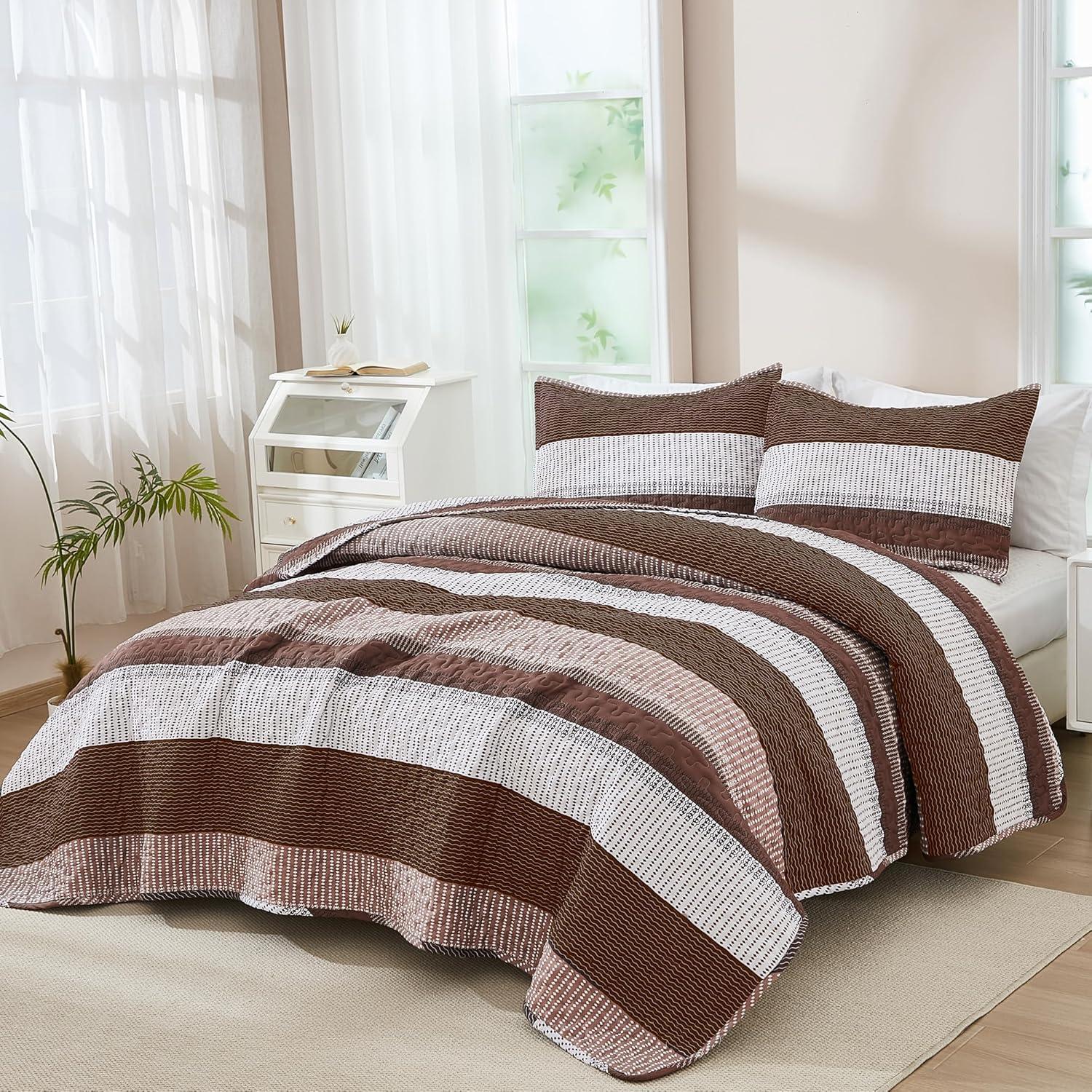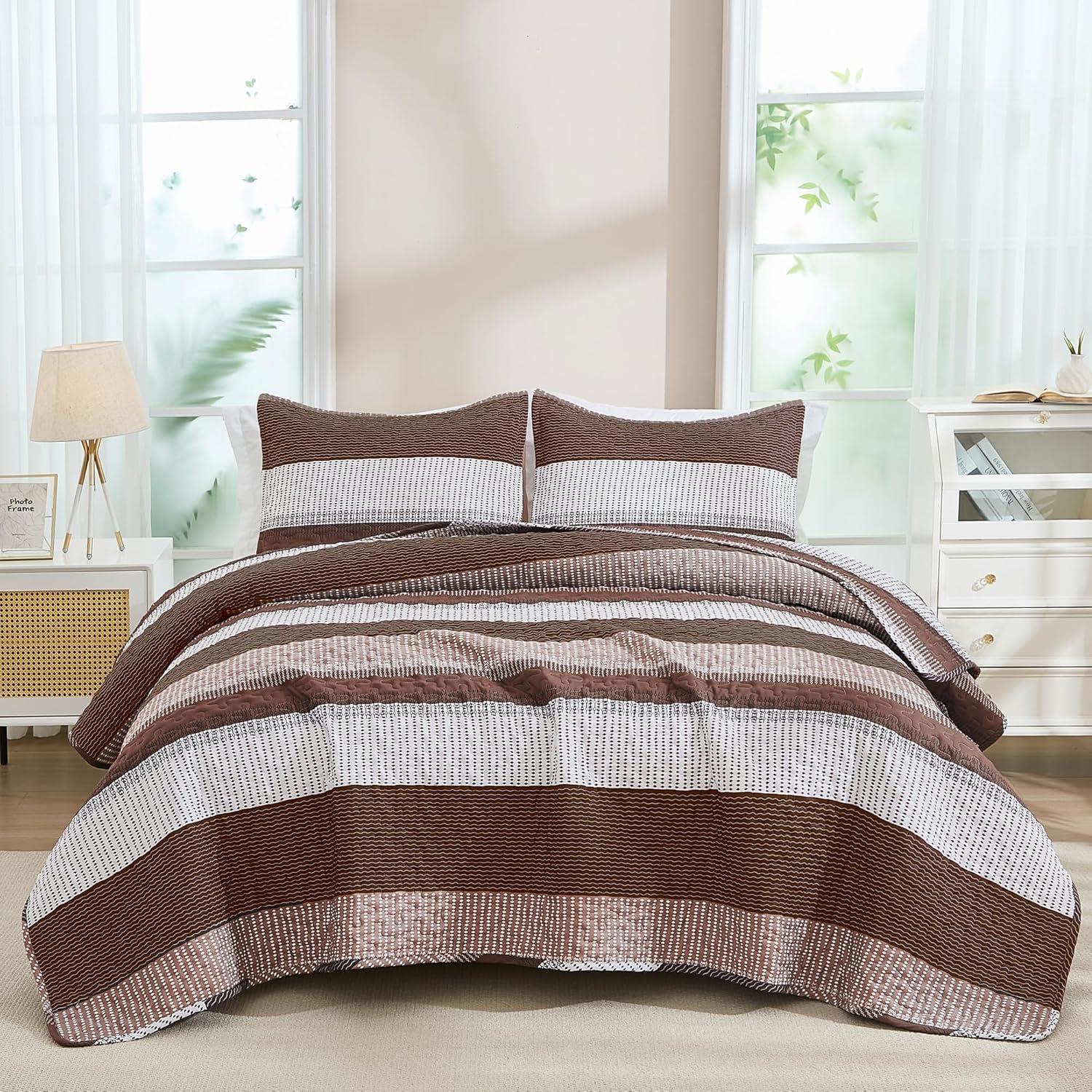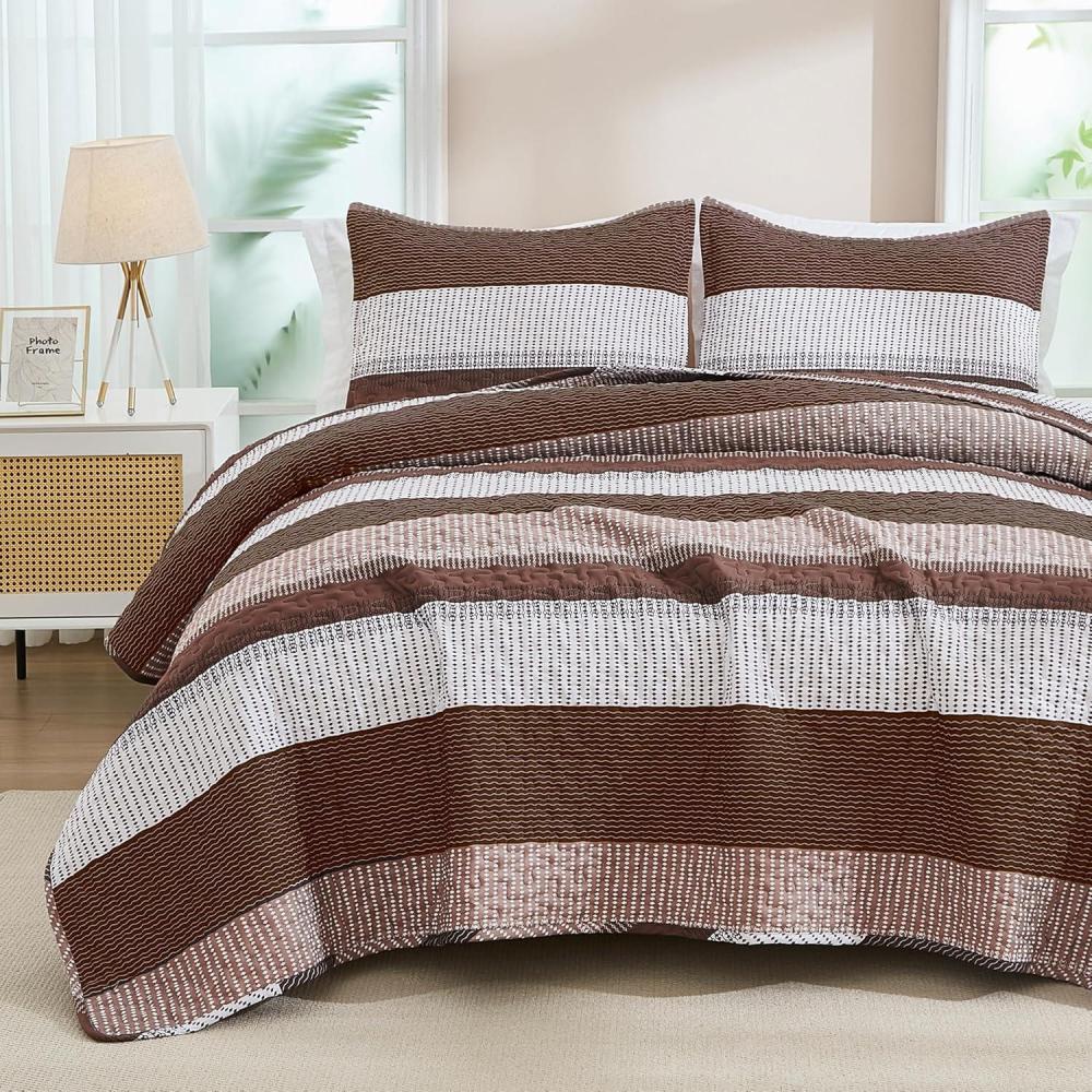 Andency Queen Quilt Bedding Set Beige, 3 Pieces Patchwork Beige Striped Ultra Soft Lightweight Bedspreads, Coverlets Set with 2 Pillow Shams for All Seasons (90″x96″)(14 – Brown)
