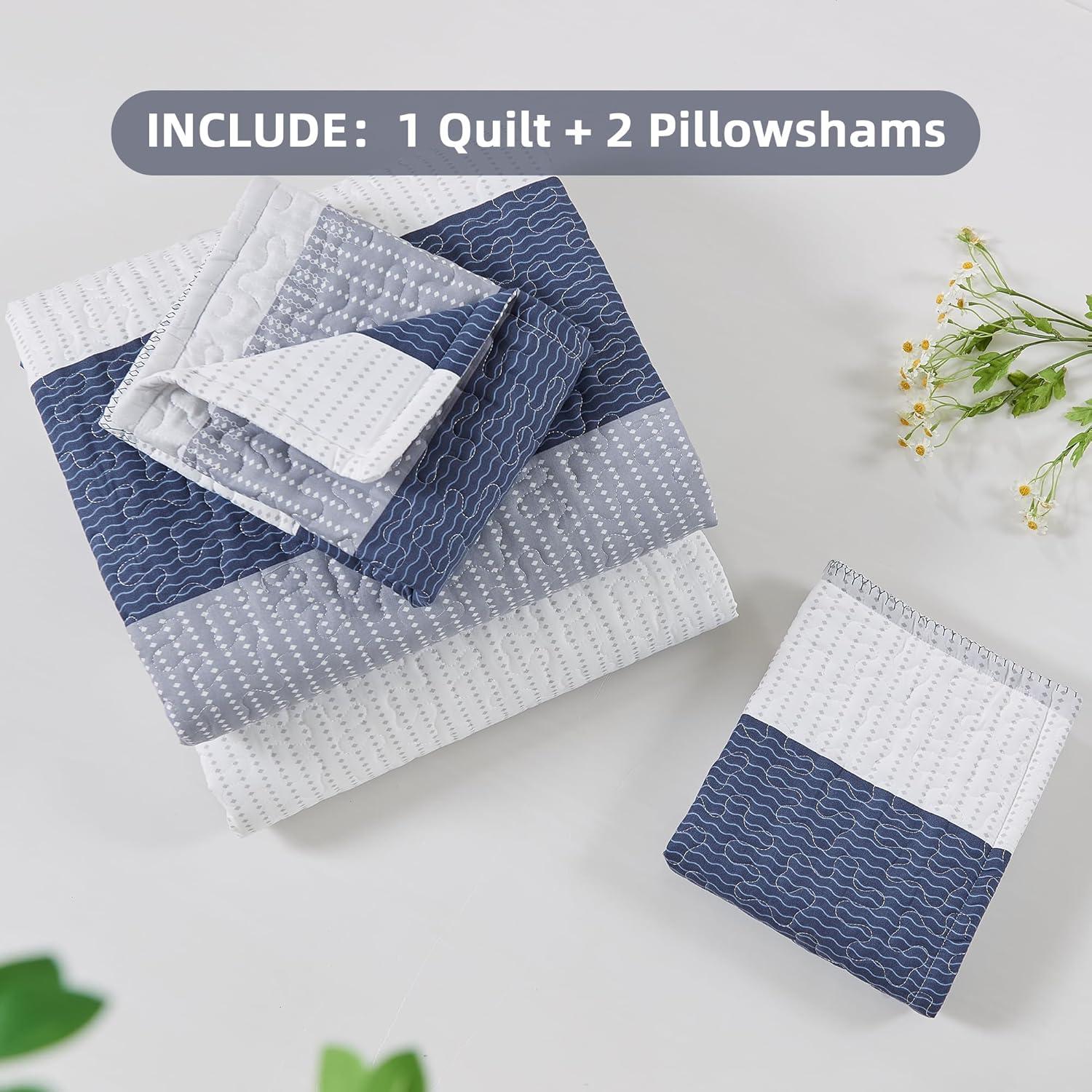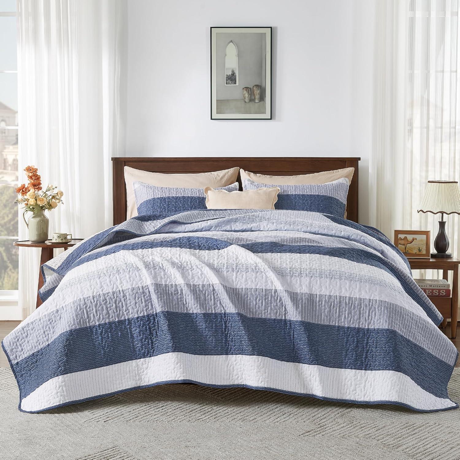 Andency Queen Quilt Bedding Set Beige, 3 Pieces Patchwork Beige Striped Ultra Soft Lightweight Bedspreads, Coverlets Set with 2 Pillow Shams for All Seasons (90″x96″)(18 – Mineral Blue)