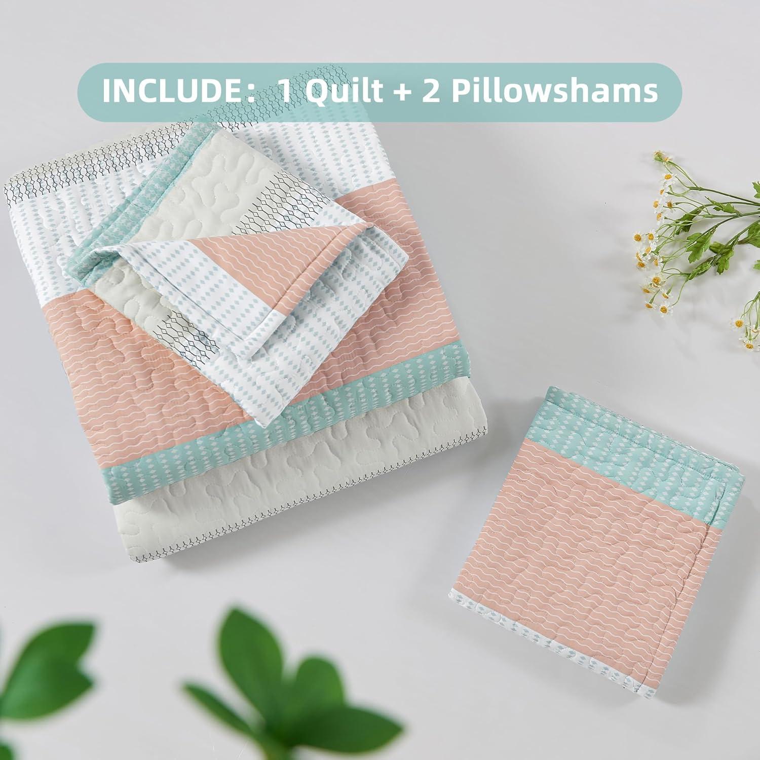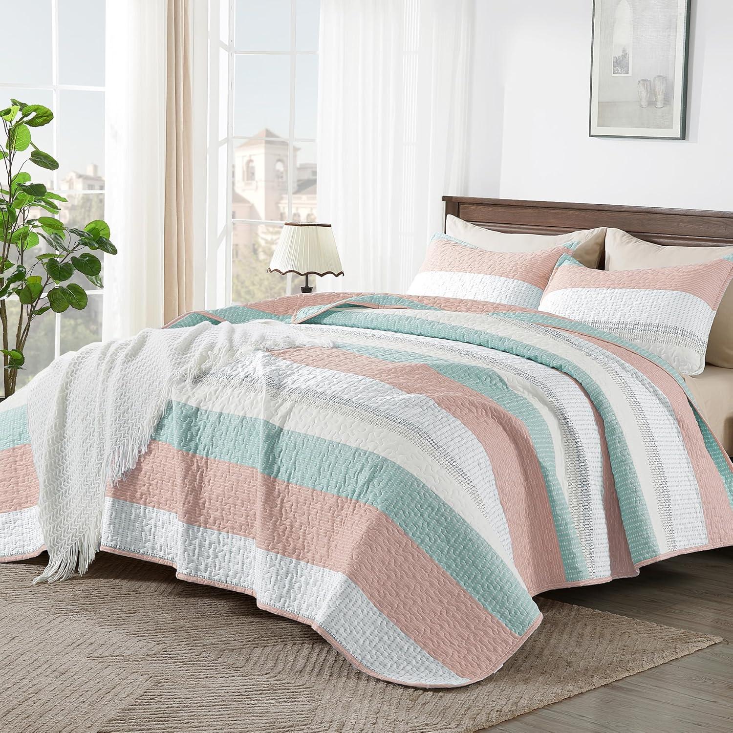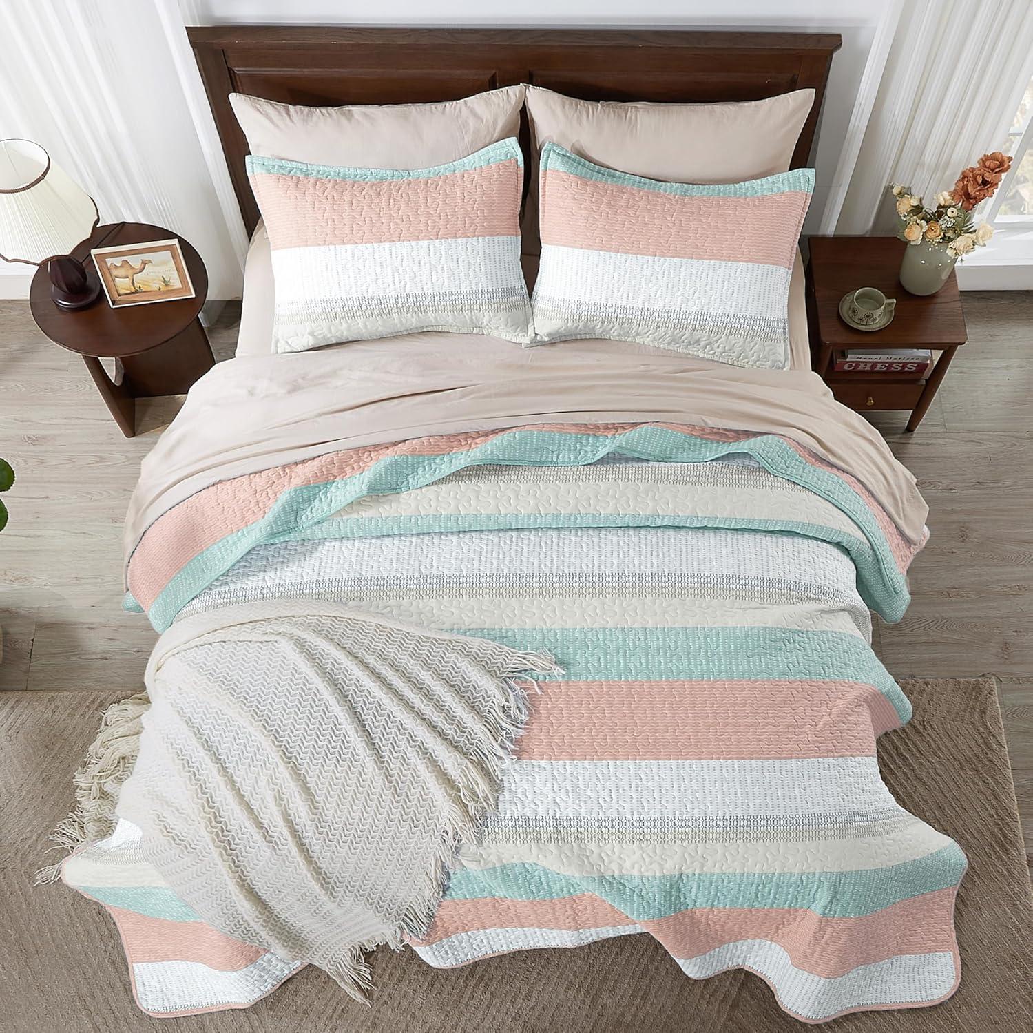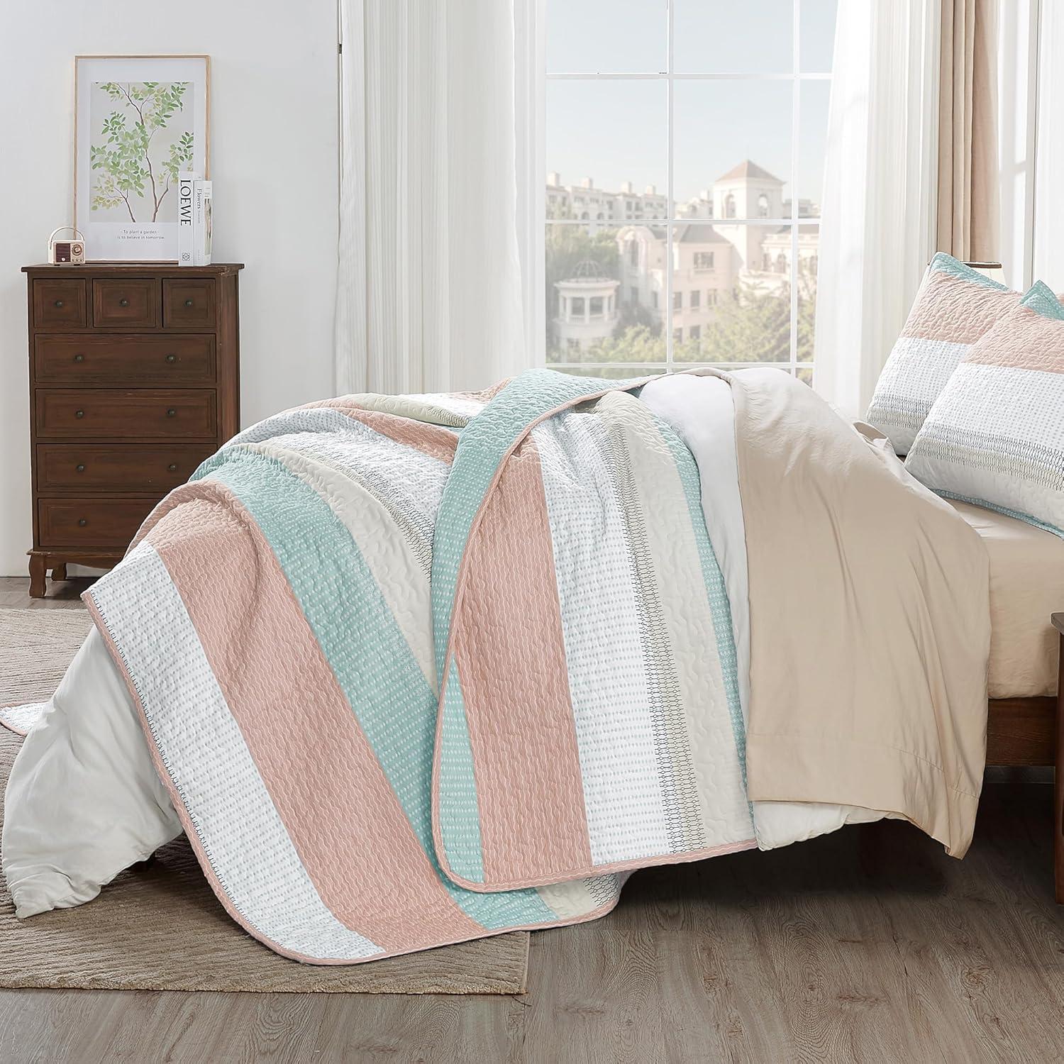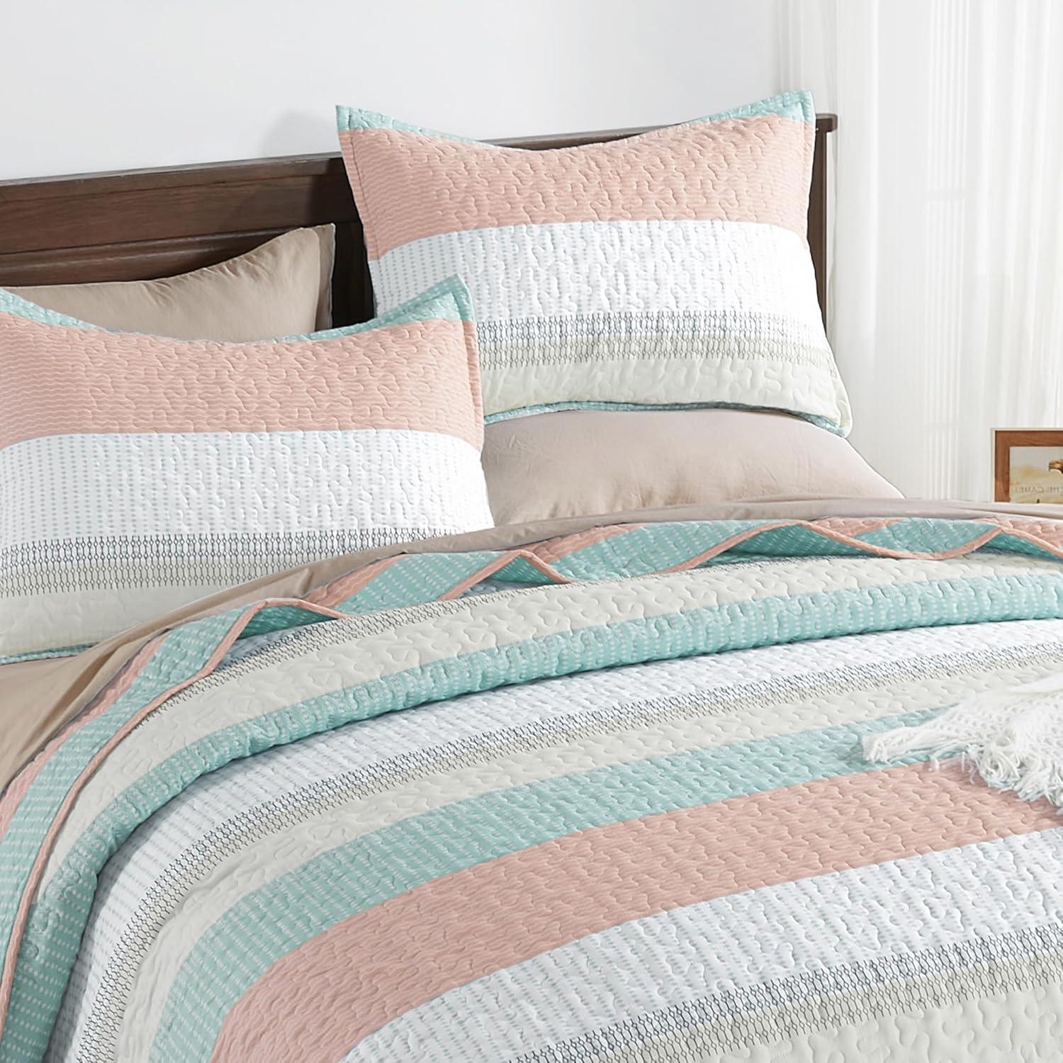 Andency Queen Quilt Bedding Set Beige, 3 Pieces Patchwork Beige Striped Ultra Soft Lightweight Bedspreads, Coverlets Set with 2 Pillow Shams for All Seasons (90″x96″)(32 – Pink Green)