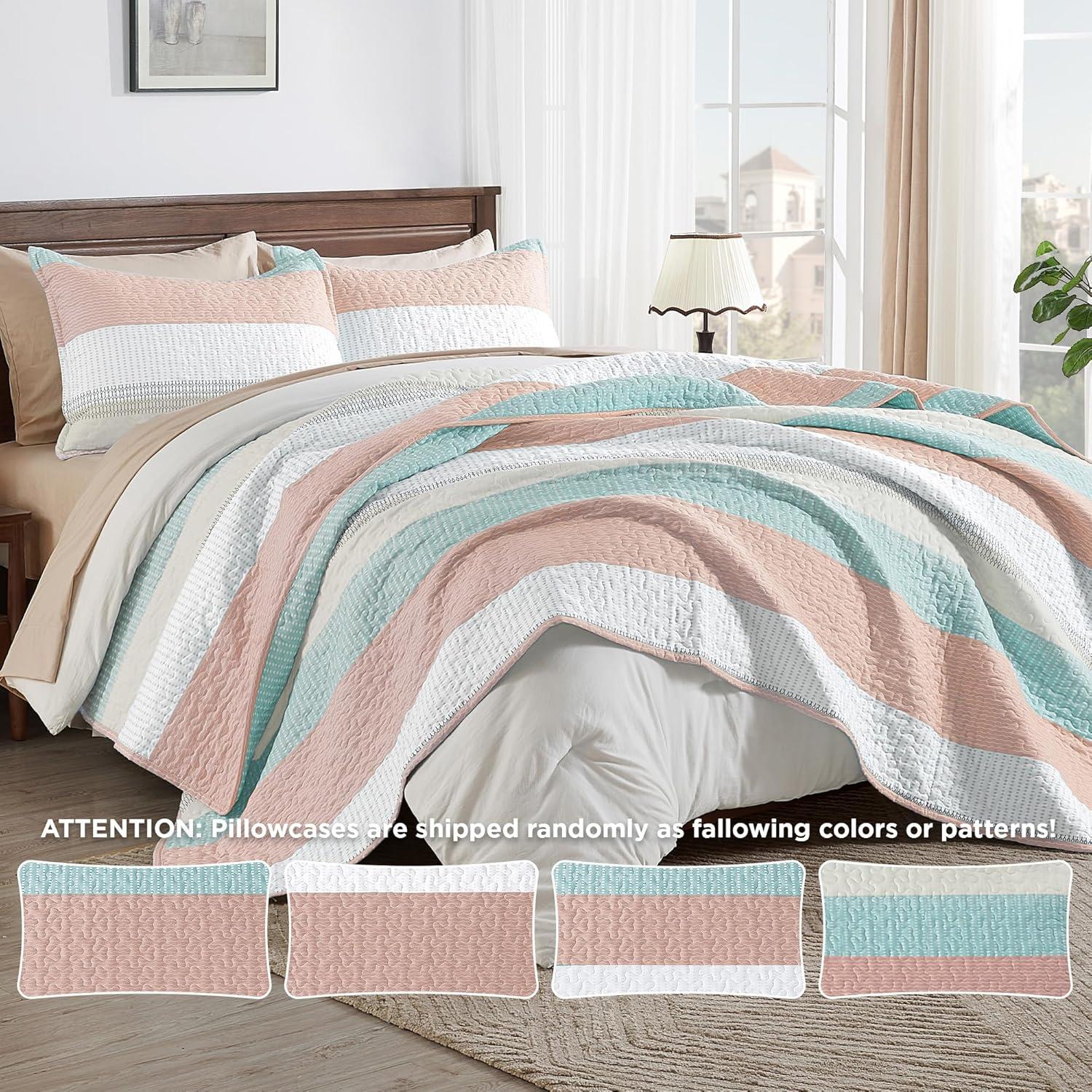 Andency Queen Quilt Bedding Set Beige, 3 Pieces Patchwork Beige Striped Ultra Soft Lightweight Bedspreads, Coverlets Set with 2 Pillow Shams for All Seasons (90"x96")(32 - Pink Green)