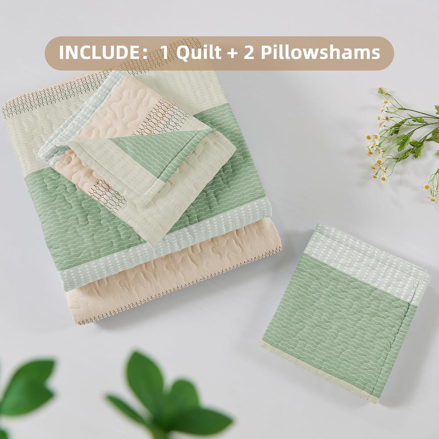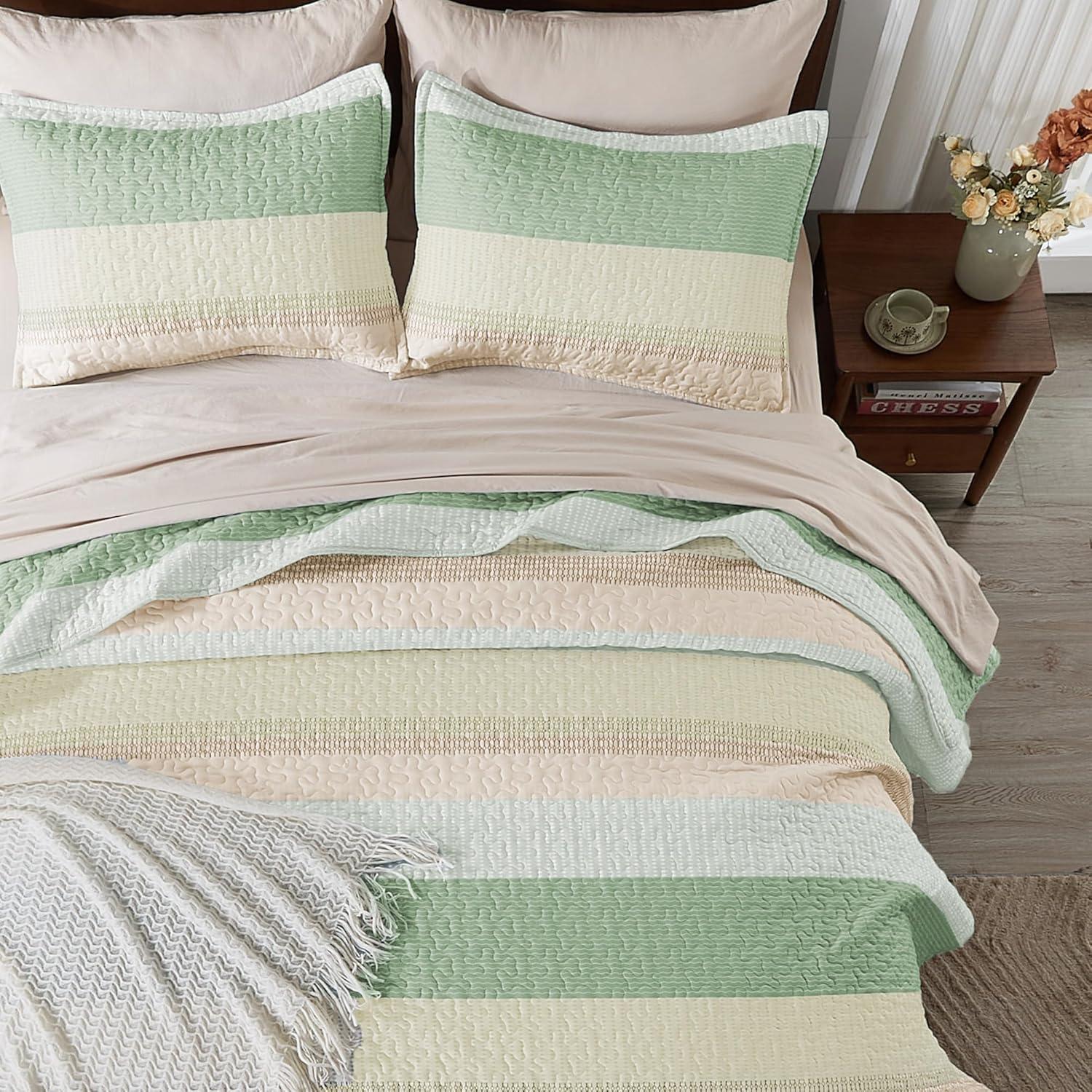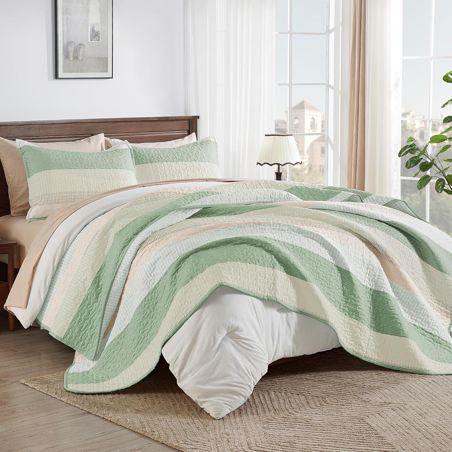 Andency Queen Quilt Bedding Set Beige, 3 Pieces Patchwork Beige Striped Ultra Soft Lightweight Bedspreads, Coverlets Set with 2 Pillow Shams for All Seasons (90″x96″)(37 – Wheat Green)