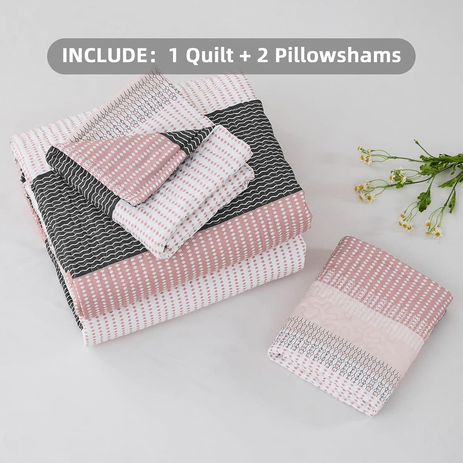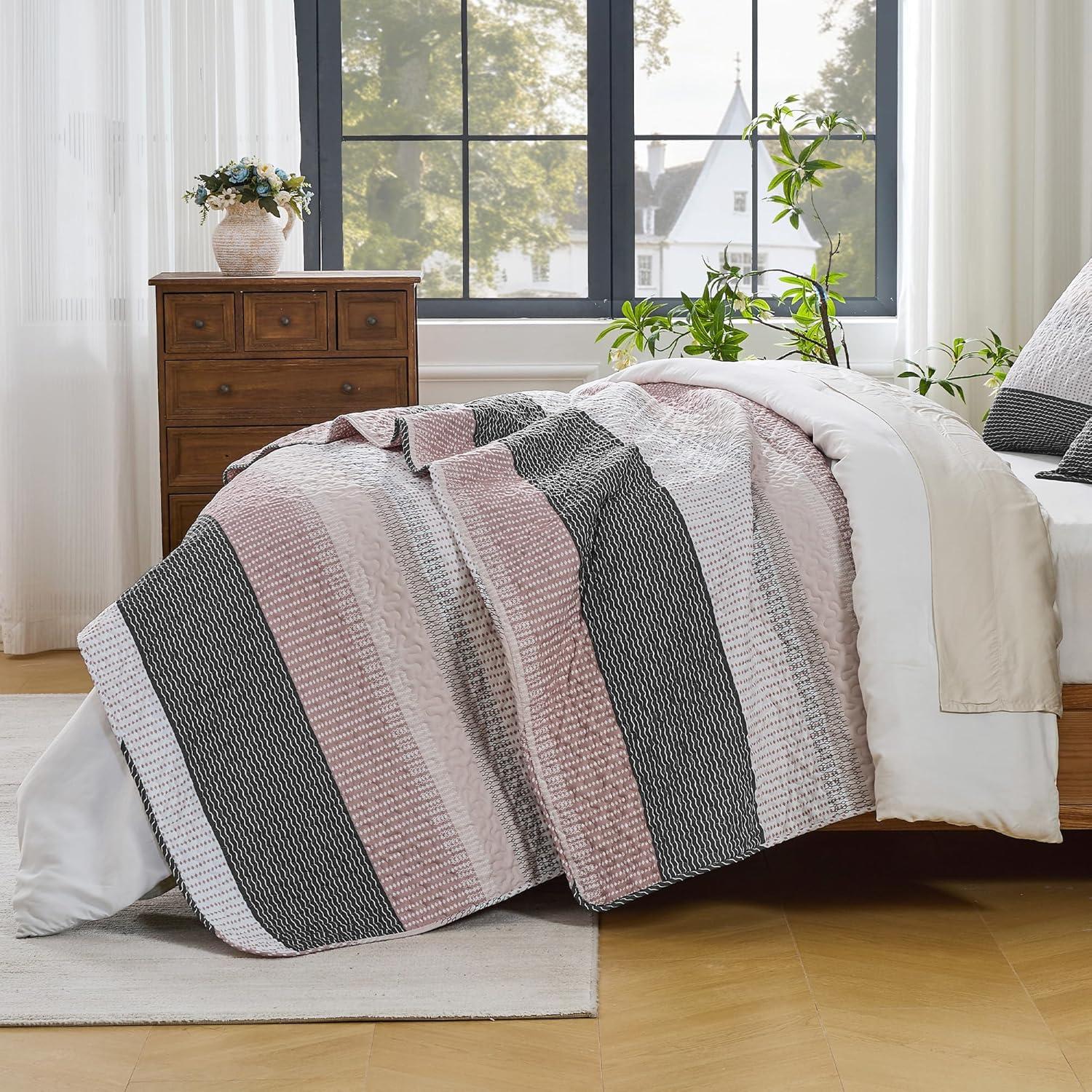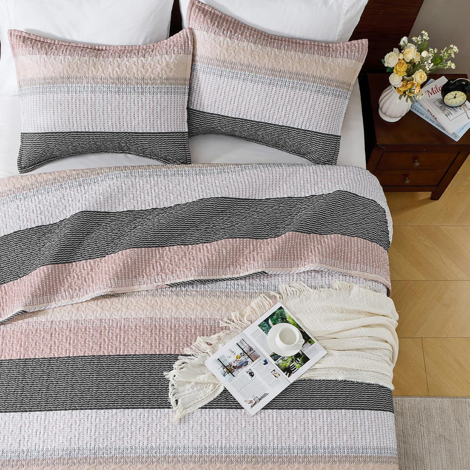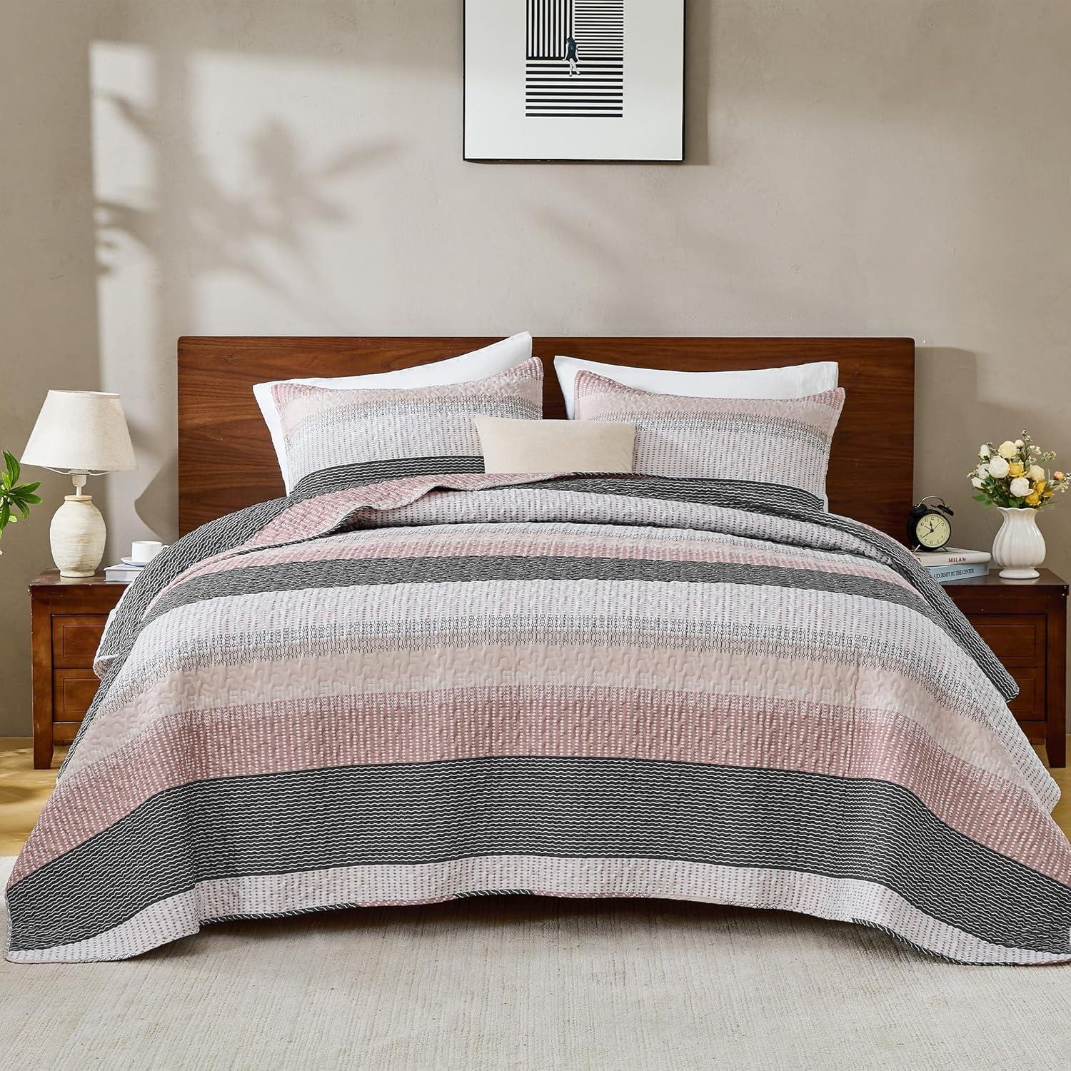 Andency Queen Quilt Bedding Set Beige, 3 Pieces Patchwork Beige Striped Ultra Soft Lightweight Bedspreads, Coverlets Set with 2 Pillow Shams for All Seasons (90"x96")(38 - Grey Pink)