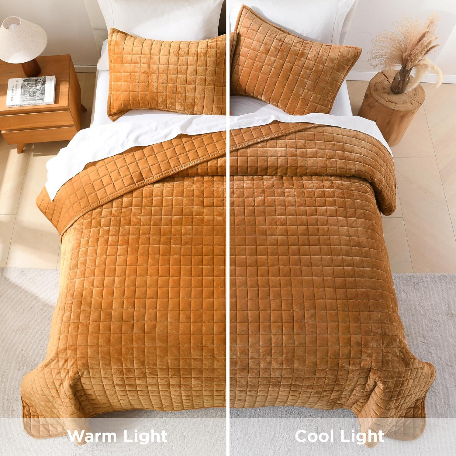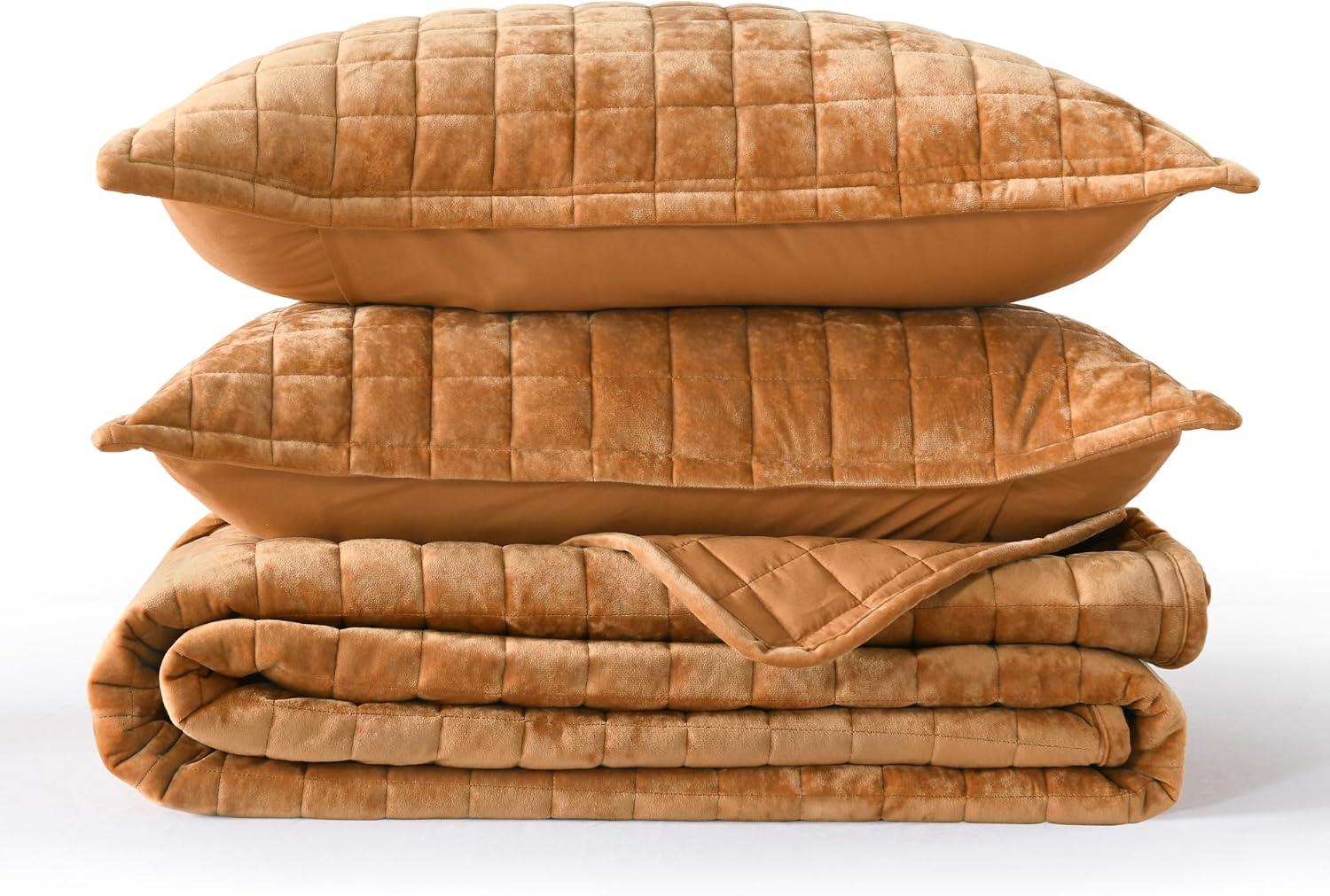 Andency Queen Quilt Cream White, Velvet Lightweight Plush Plaid Bedspread, Soft Luxury Coverlet Quilted Bedding Set (96x90 inch, 2 Matching Pillowcases), All Season(Gold Caramel)