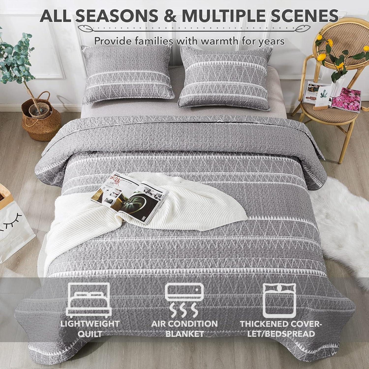 Andency Quilt King Size Set Grey (106x96 Inch), 3 Pieces(1 Striped Boho Printed Quilt and 2 Pillowcases), Bohemian Summer Lightweight Reversible Microfiber Bedspread Coverlet Sets(01 - Grey & Printed Pattern)