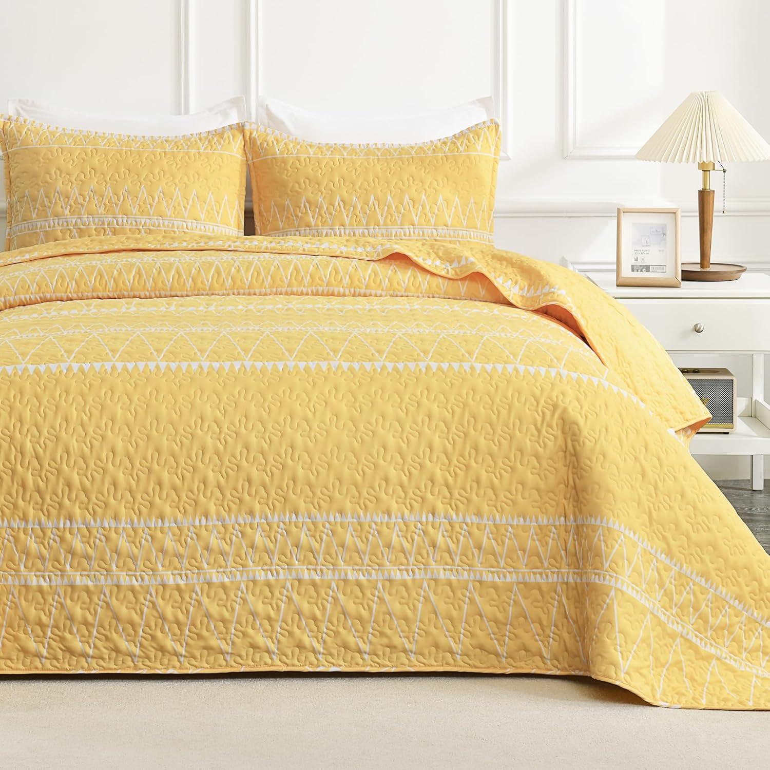 Andency Quilt King Size Set Grey (106x96 Inch), 3 Pieces(1 Striped Boho Printed Quilt and 2 Pillowcases), Bohemian Summer Lightweight Reversible Microfiber Bedspread Coverlet Sets(08 - Yellow & Printed Pattern)