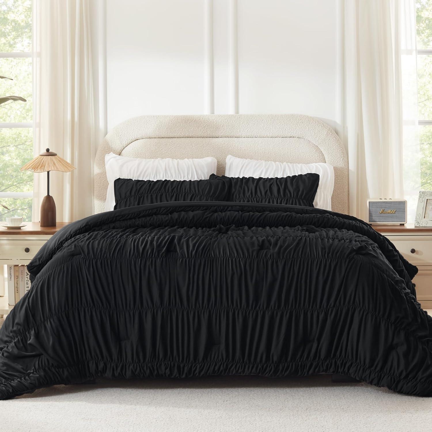 imageAndency Ruched Beige Queen Comforter Set Shabby Chic Pleated Bedding Sets 3 Pieces Lightweight Soft Boho Ruffle Bed Set for Girls Kids Women All SeasonBlack