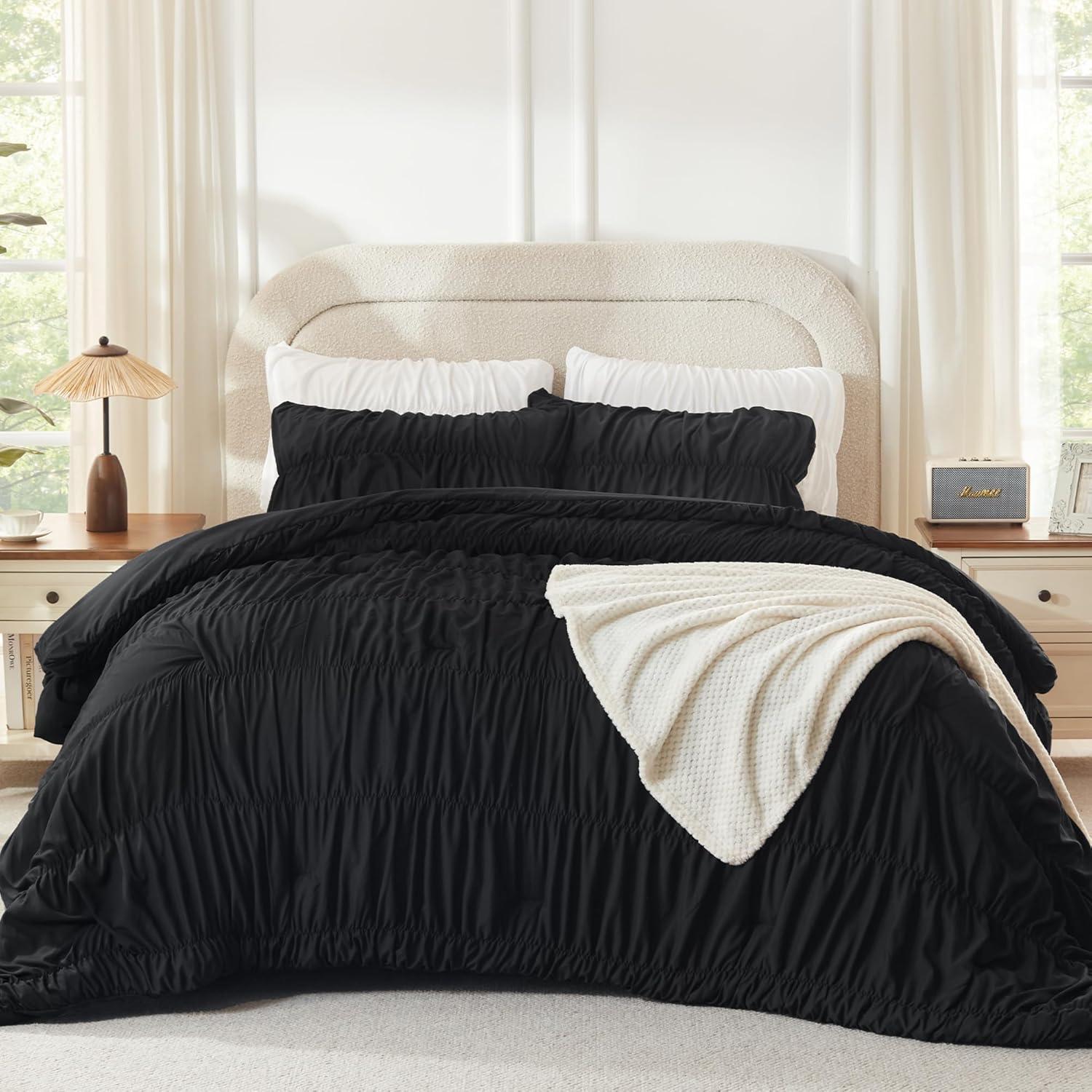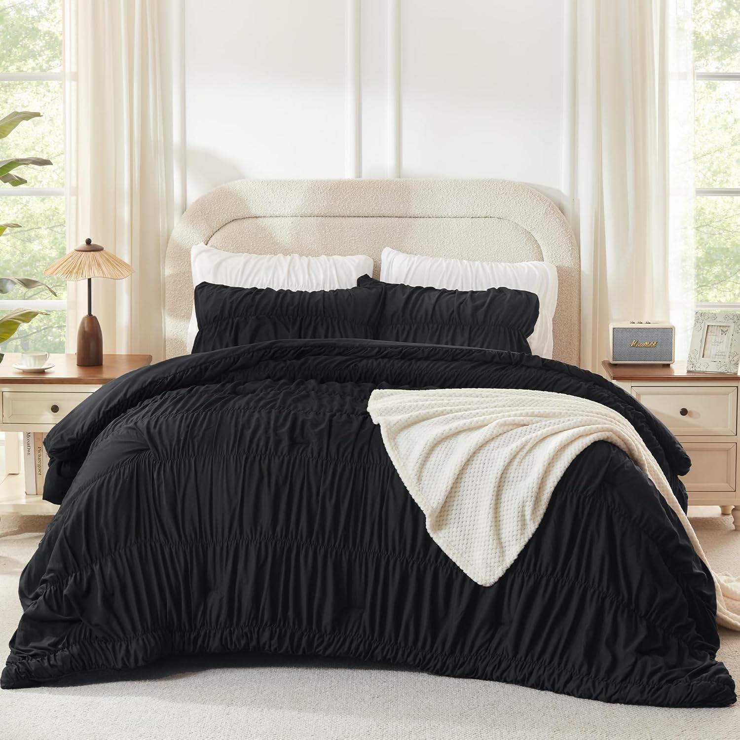 Andency Ruched Beige Queen Comforter Set, Shabby Chic Pleated Bedding Sets 3 Pieces, Lightweight Soft Boho Ruffle Bed Set for Girls, Kids, Women, All Season(Black)