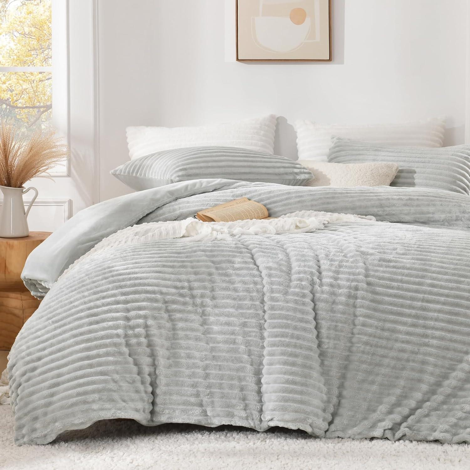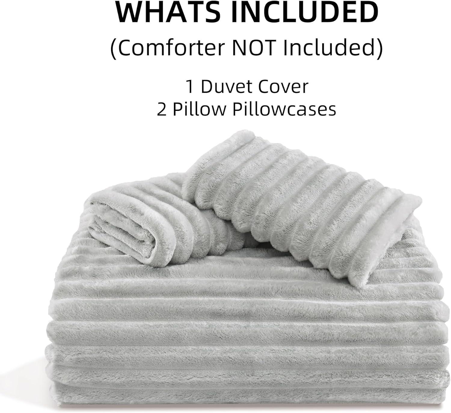 Andency White Fluffy California King Duvet Cover, Striped Plush Microfiber Fleece Comforter Cover, Ultra-Soft Lightweight Bed Set, 3 Piece Warm Faux Fur Bedding for All Season, Two-Way Zipper(Gray ( No Comforter))