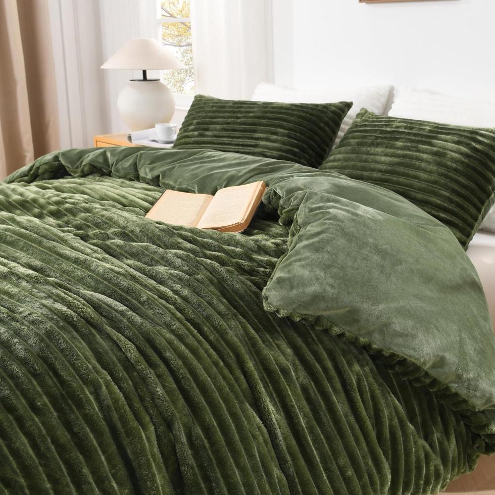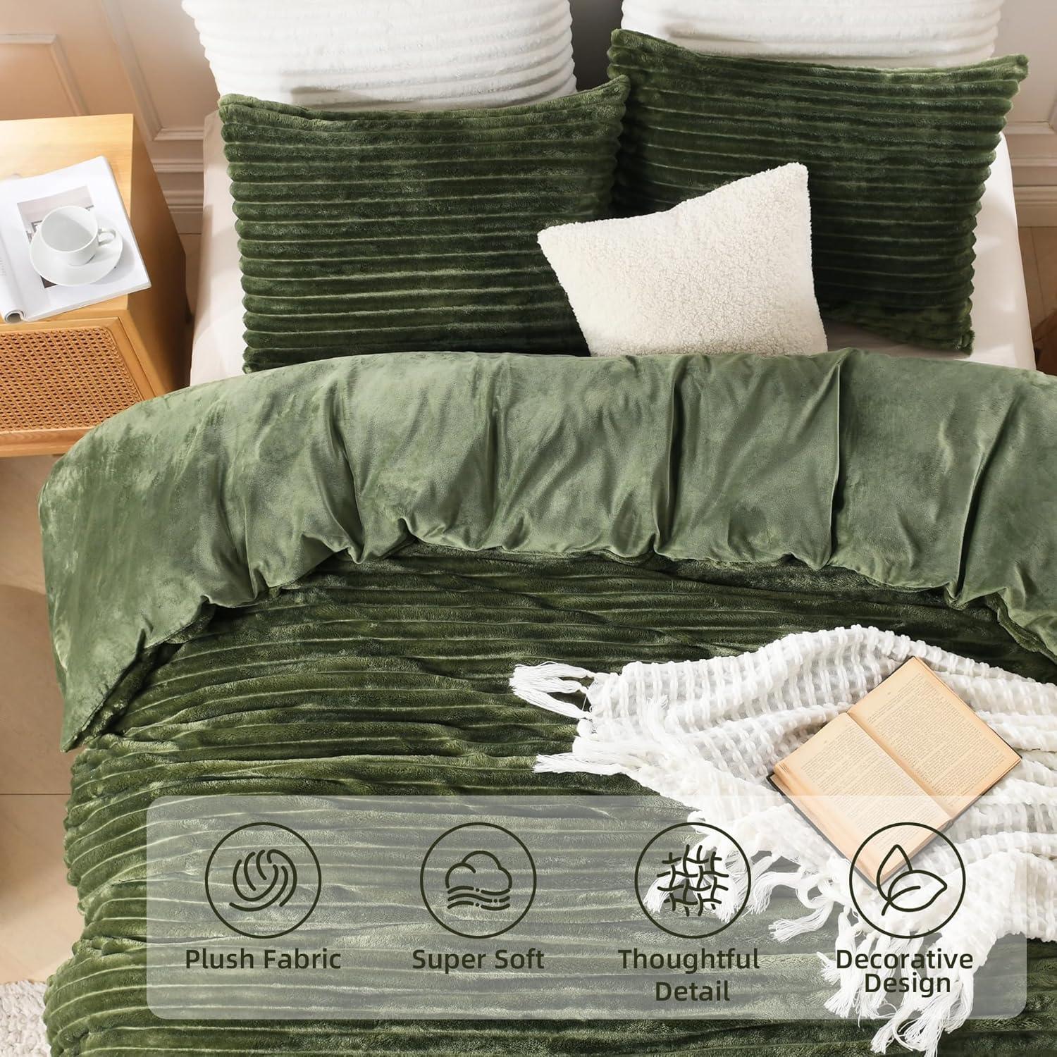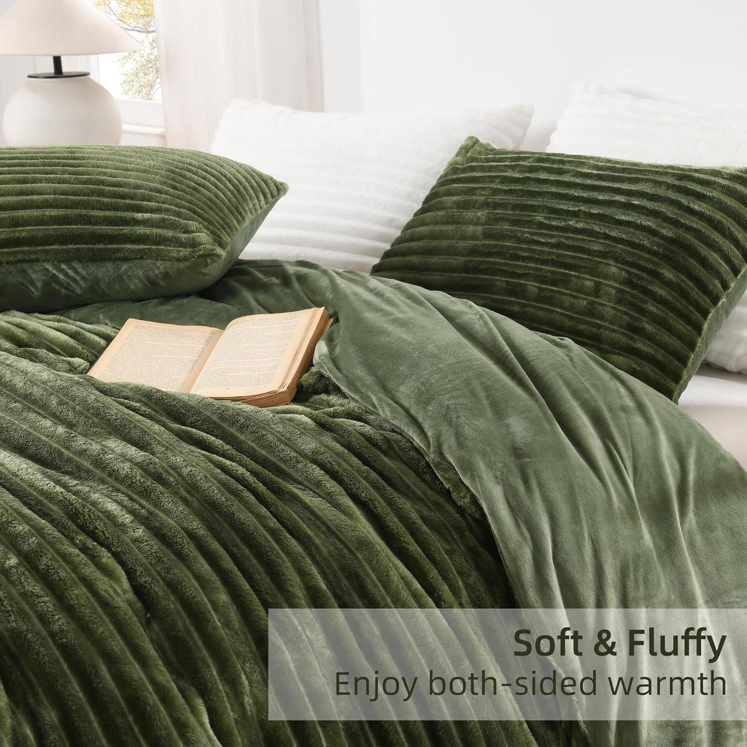 Andency White Fluffy California King Duvet Cover, Striped Plush Microfiber Fleece Comforter Cover, Ultra-Soft Lightweight Bed Set, 3 Piece Warm Faux Fur Bedding for All Season, Two-Way Zipper(Olive Green ( No Comforter))