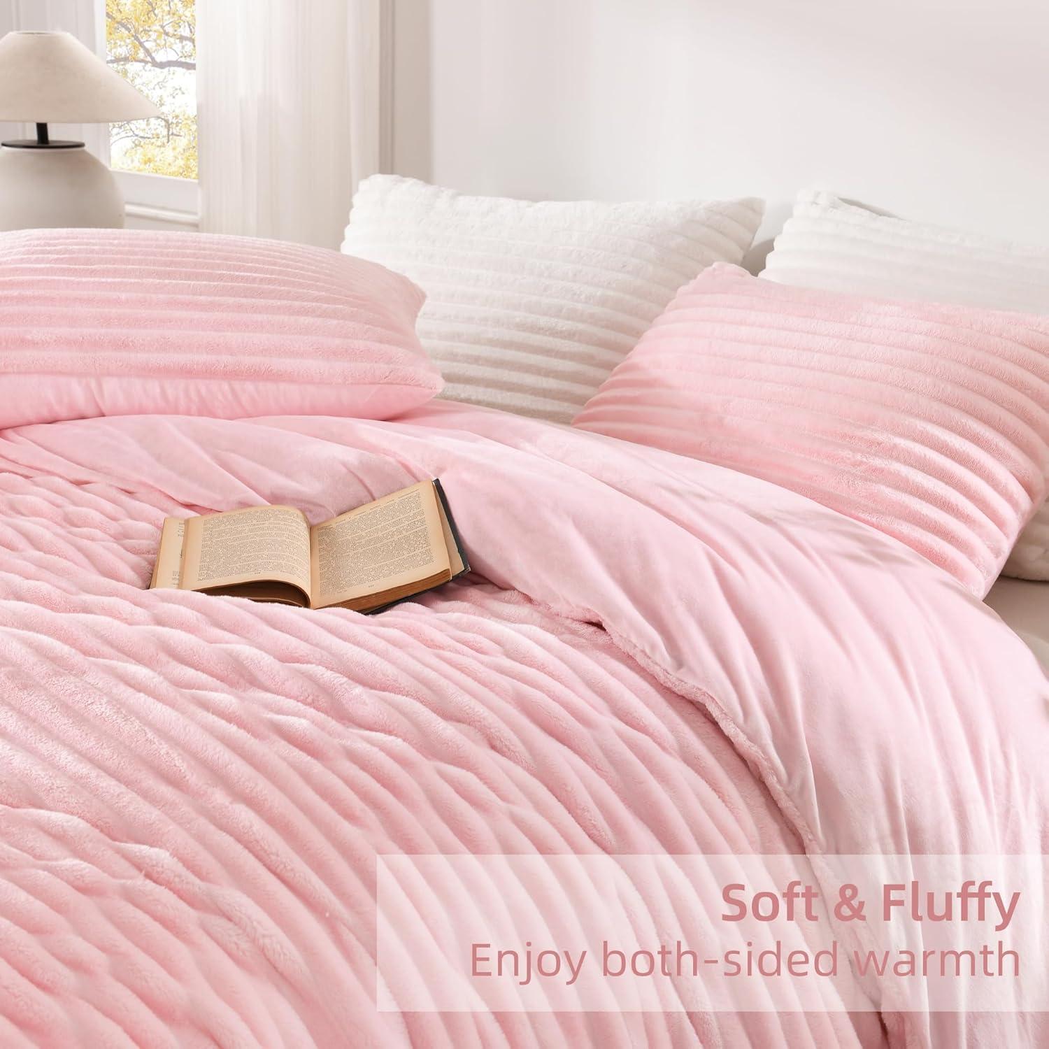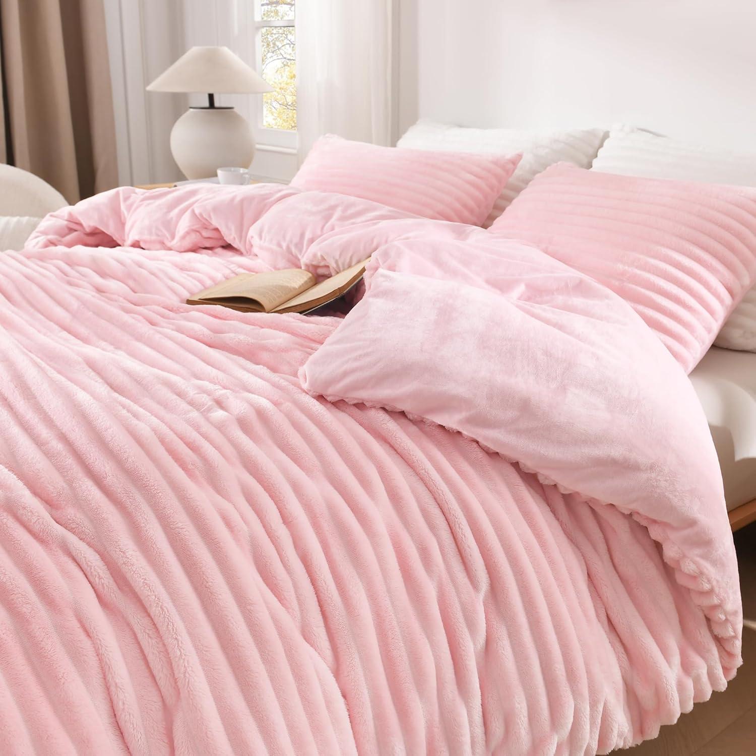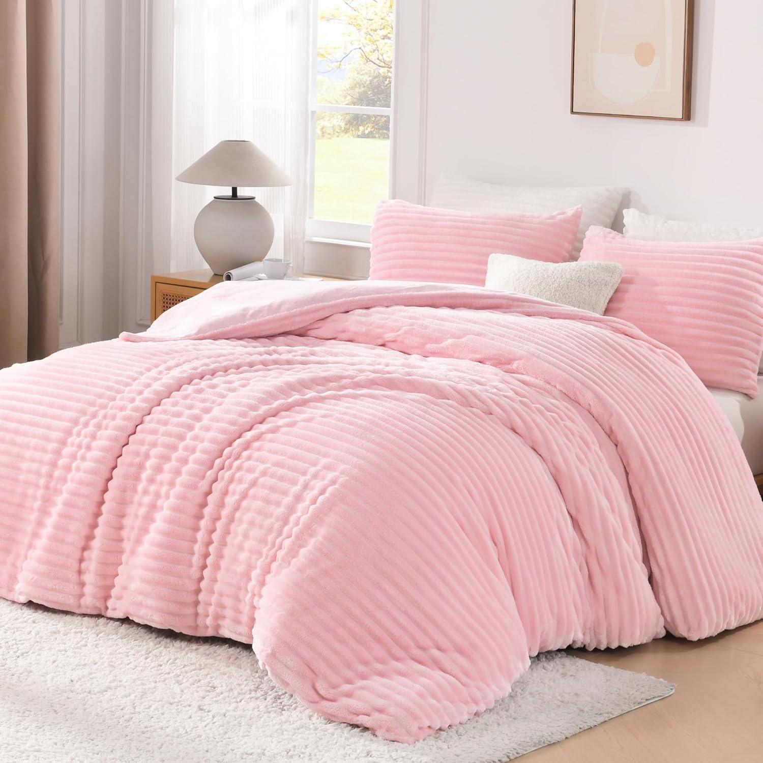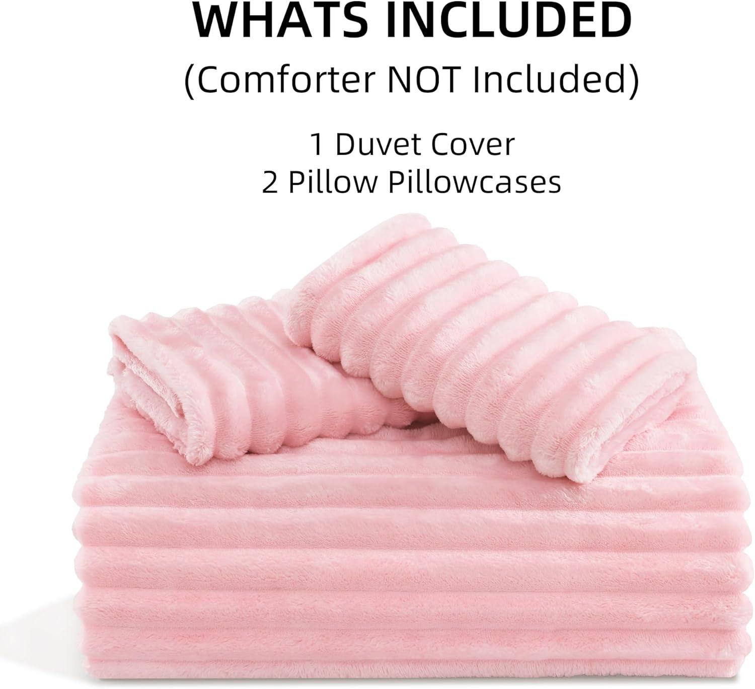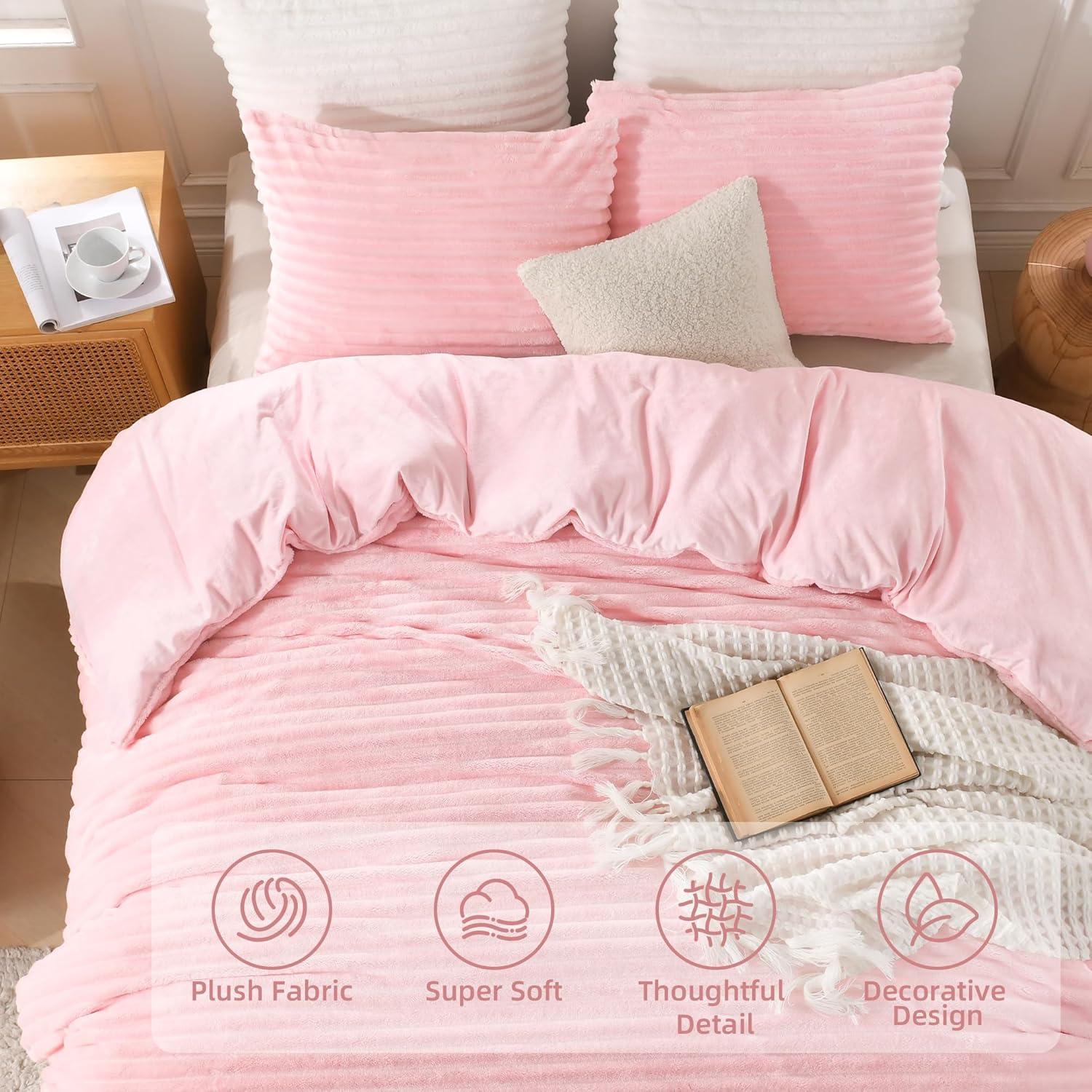 Andency White Fluffy Duvet Cover King, Striped Plush Microfiber Fleece Comforter Cover, Ultra-Soft Lightweight Bed Set, 3 Piece Warm Faux Fur Bedding for All Season, Two-Way Zipper(Pink ( No Comforter))