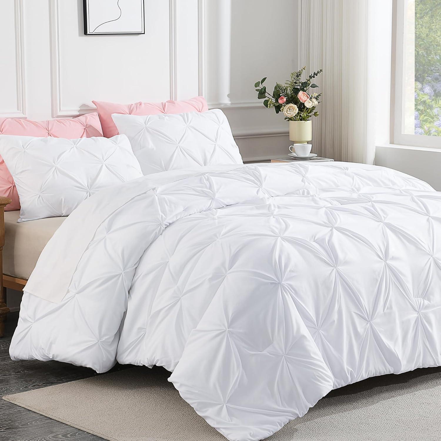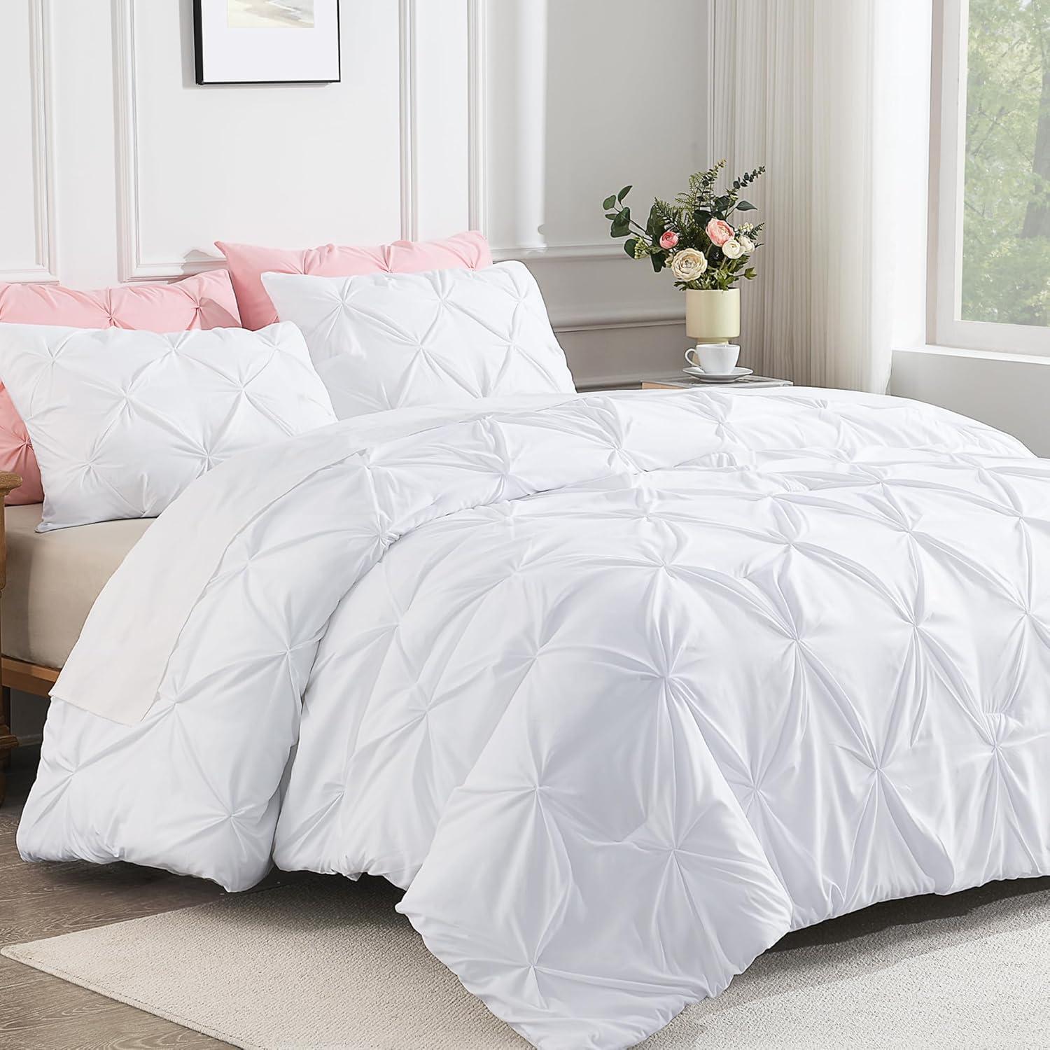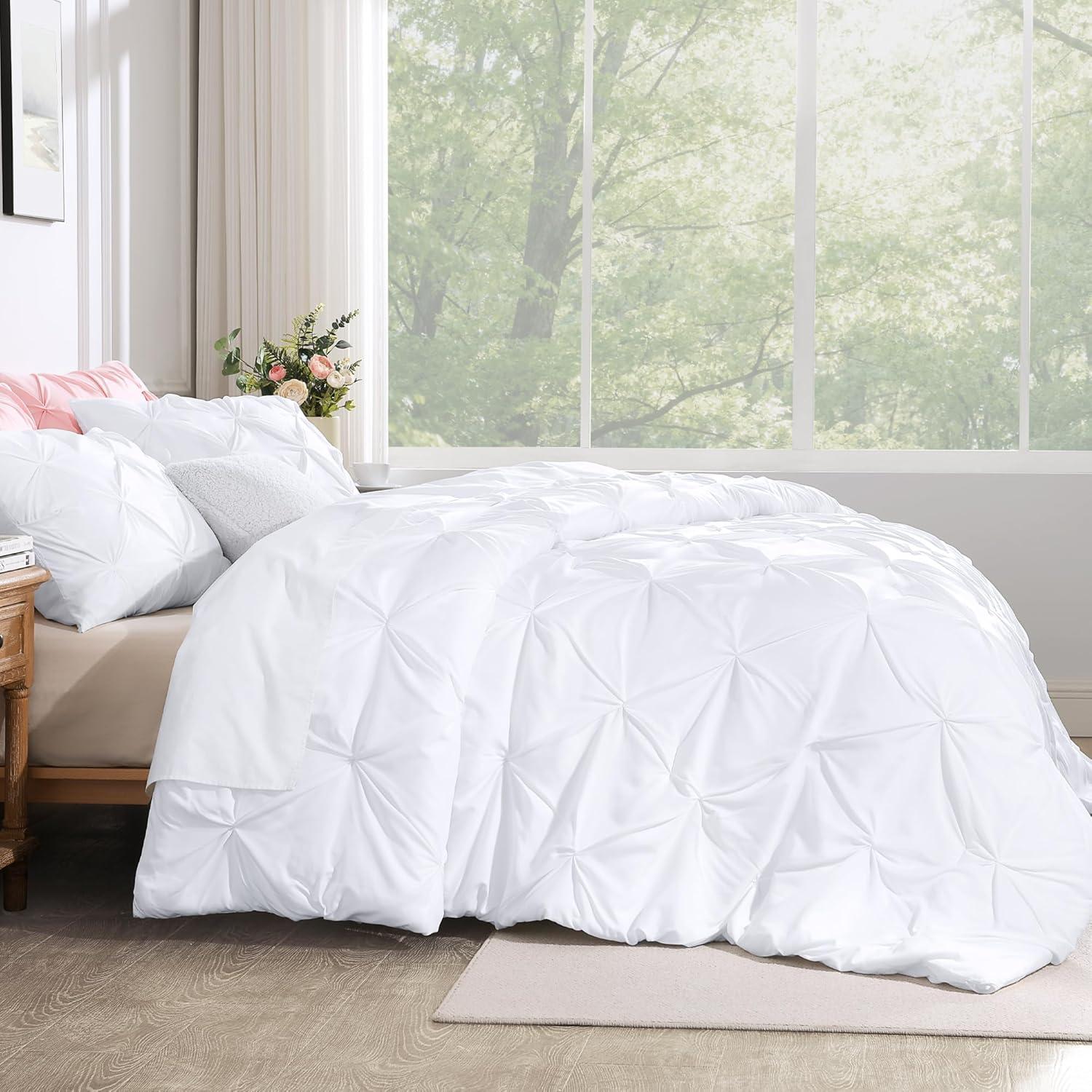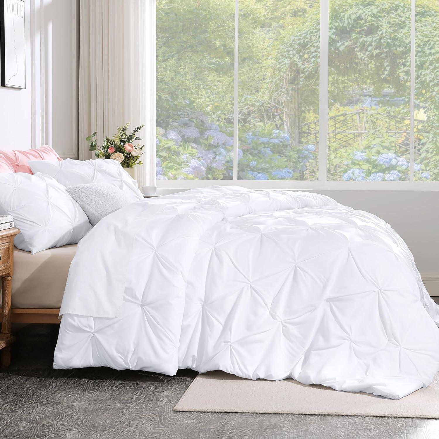 SOFT AND COZY FABRIC: This white comforter set is made from high-quality microfiber, which is extremely soft and cozy. The pinch pleated comforter is filled with down alternative microfiber, which is lightweight to reach a perfect balance between warmth and comfort, brings you a good and sound sleep.