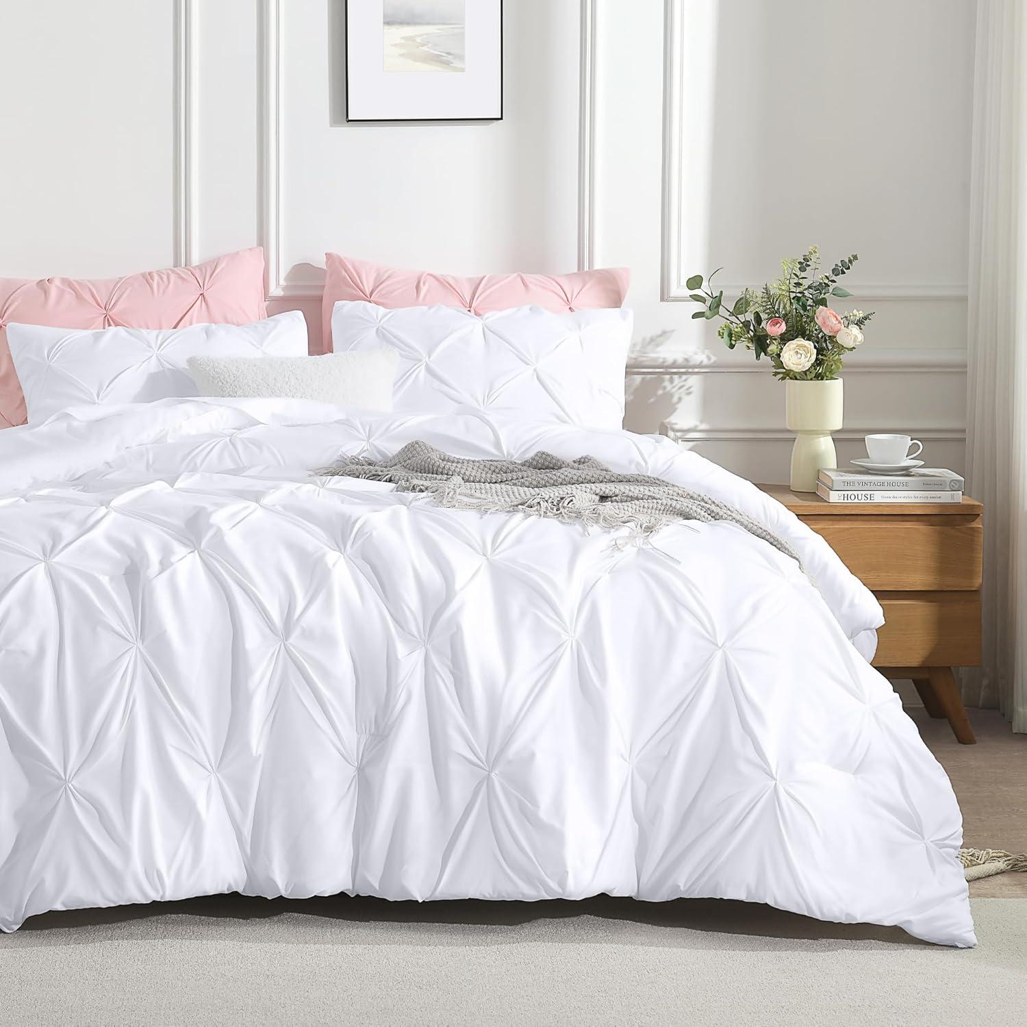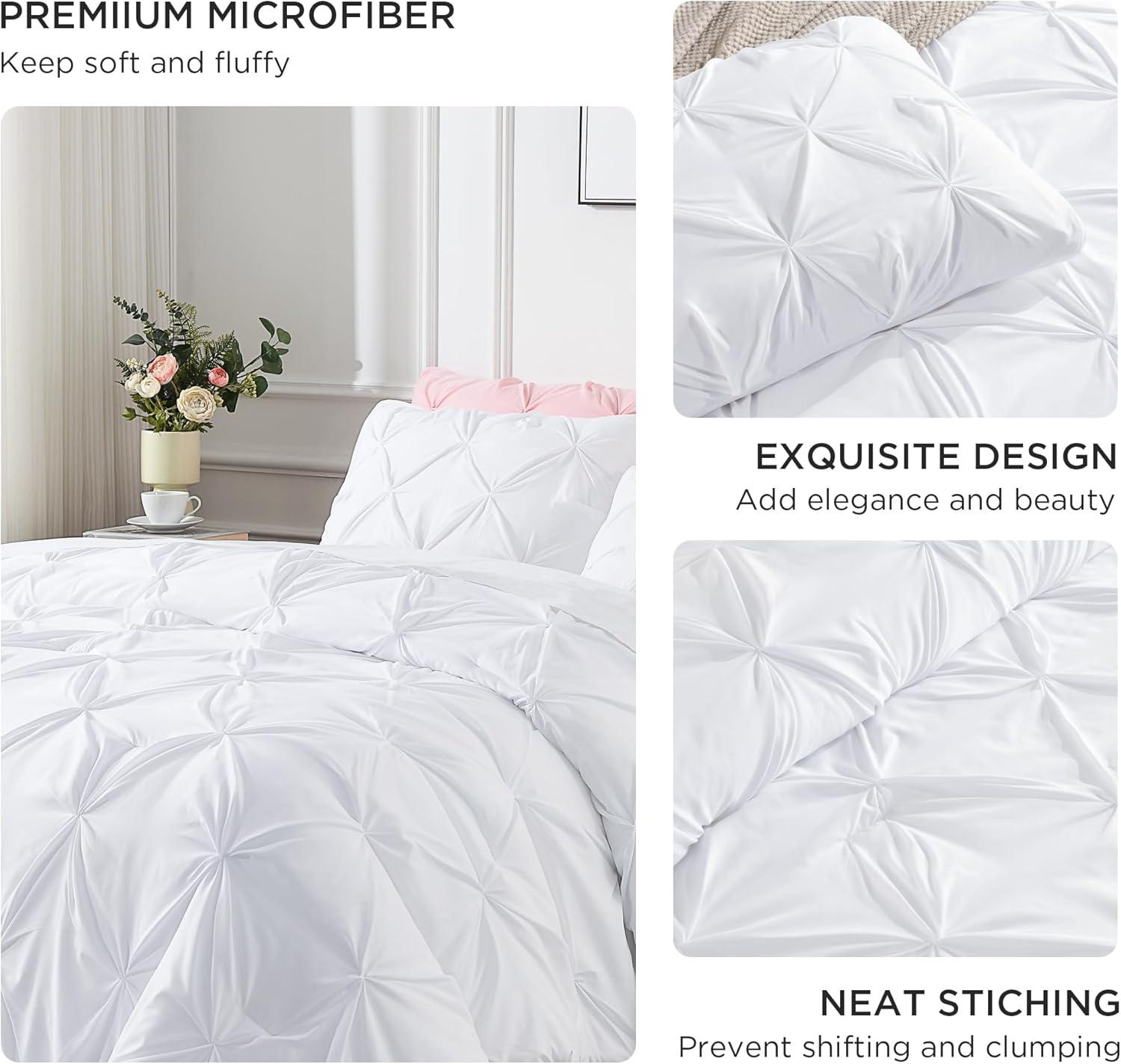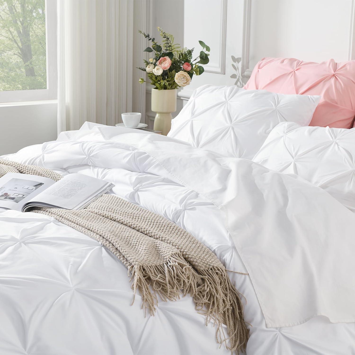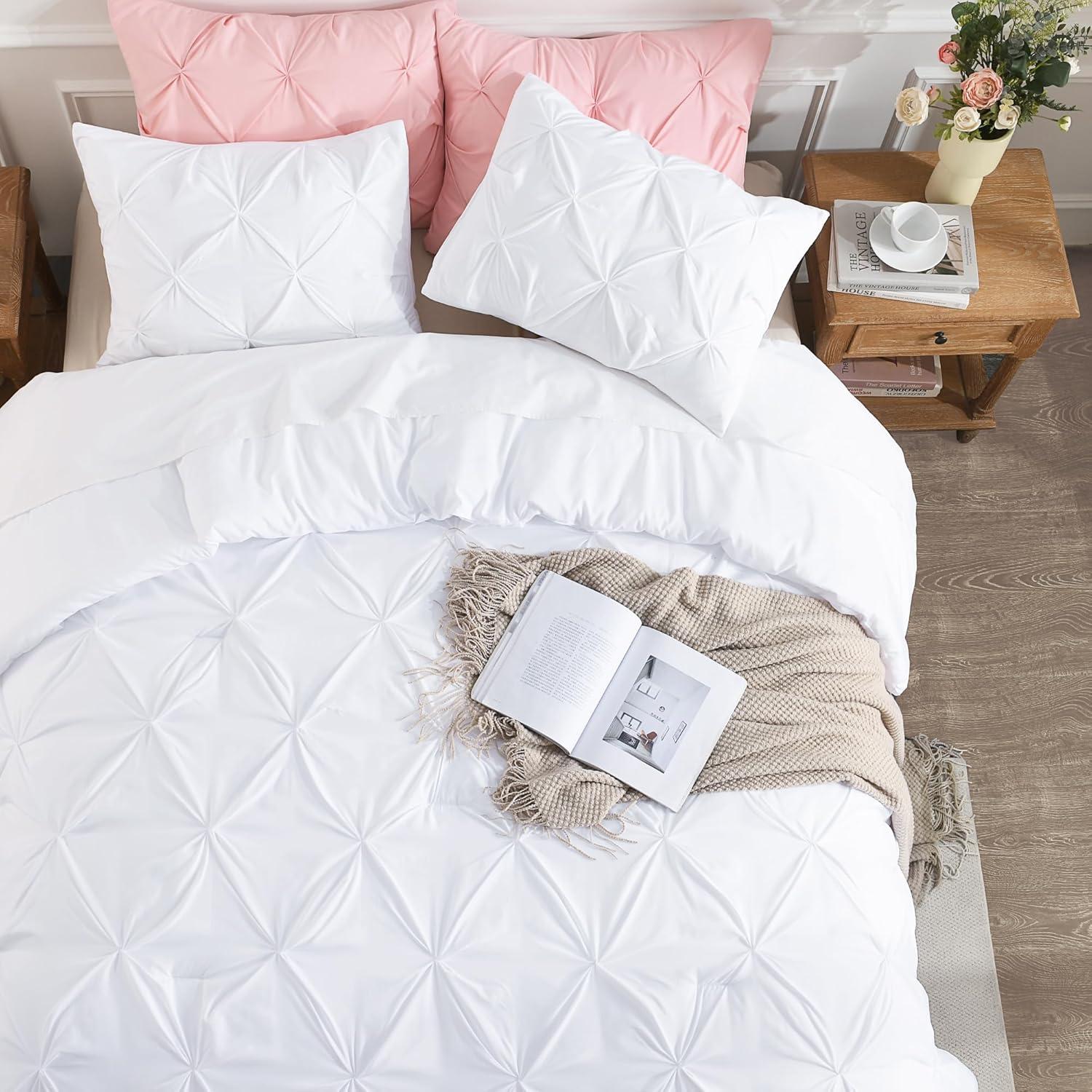 SOFT AND COZY FABRIC: This white comforter set is made from high-quality microfiber, which is extremely soft and cozy. The pinch pleated comforter is filled with down alternative microfiber, which is lightweight to reach a perfect balance between warmth and comfort, brings you a good and sound sleep.