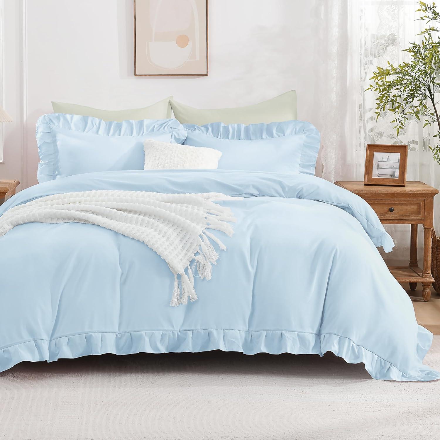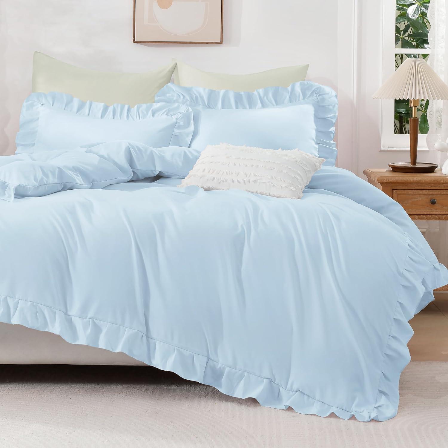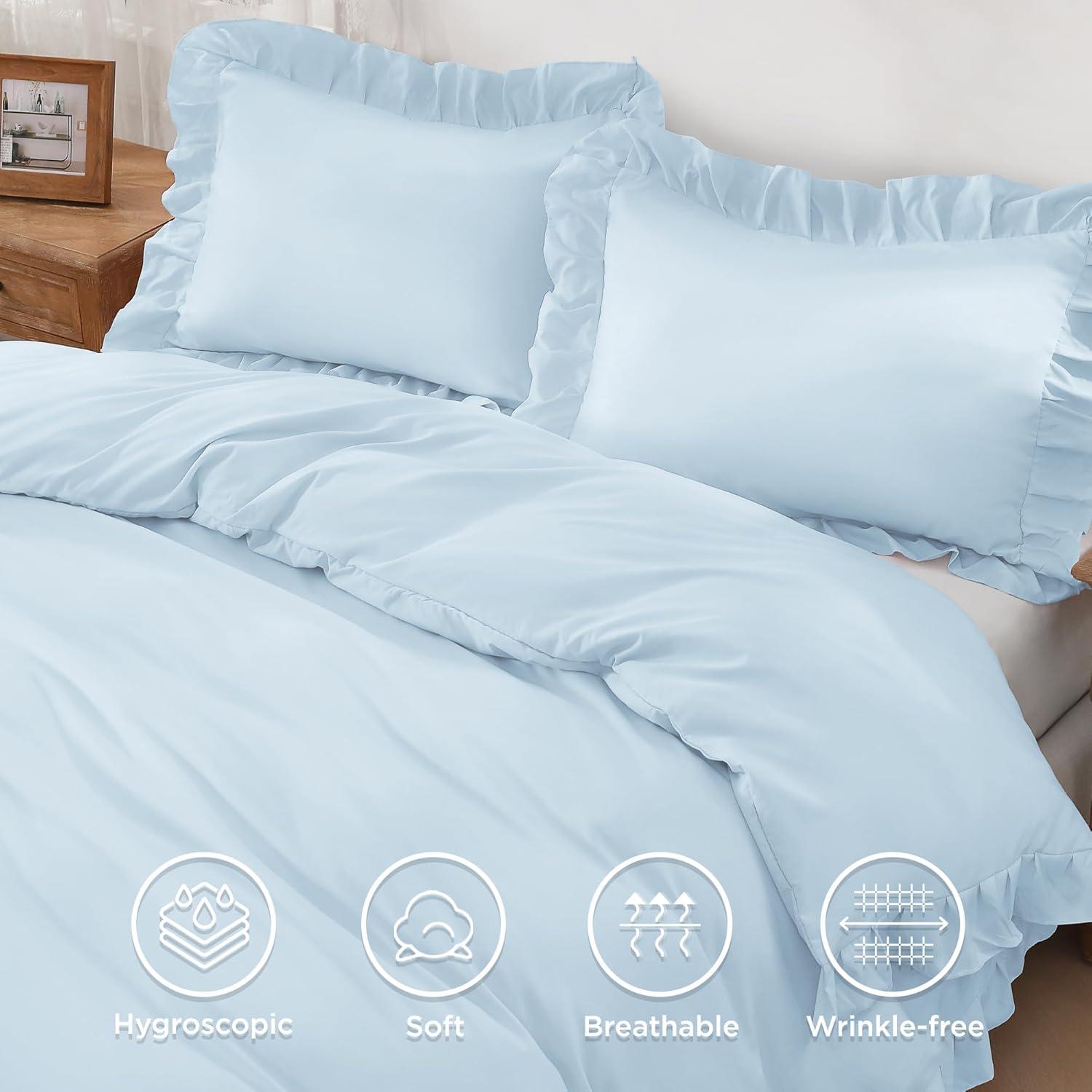 Andency White Ruffle Duvet Cover Queen(90x90Inch), 3 Pieces Soft Washed Microfiber Vintage Shabby Chic Farmhouse Ruffled Duvet Cover Set with Zipper Closure & Corner Ties(Light Blue)